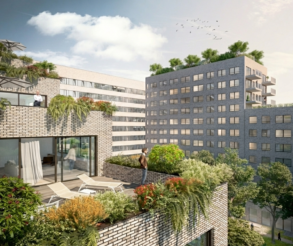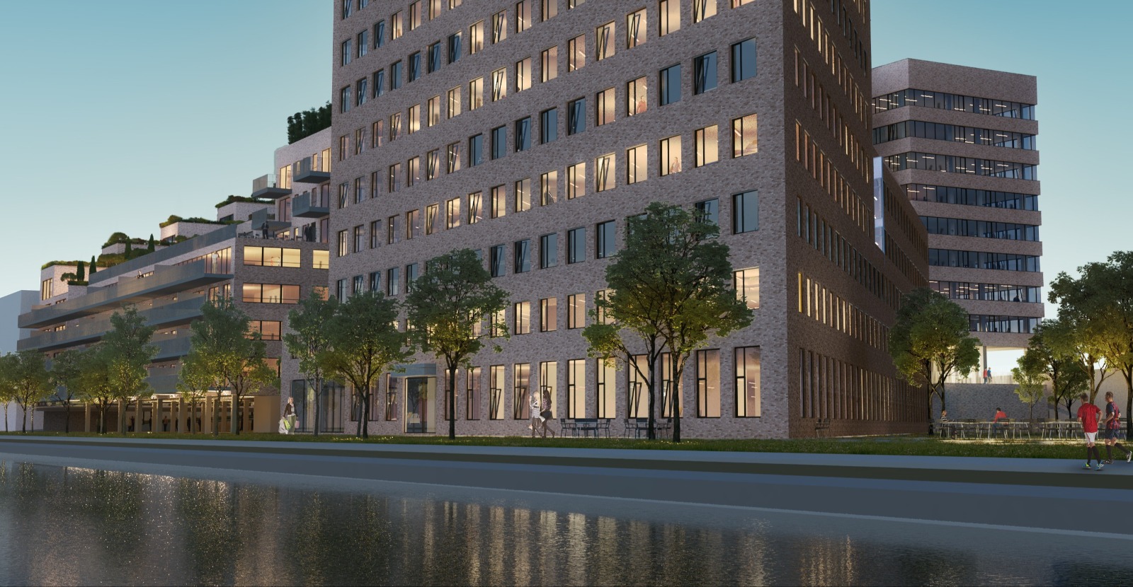 An urban design featuring private housing, social housing, offices, and a shared garden along the Bassin Vauban in Strasbourg (FR).