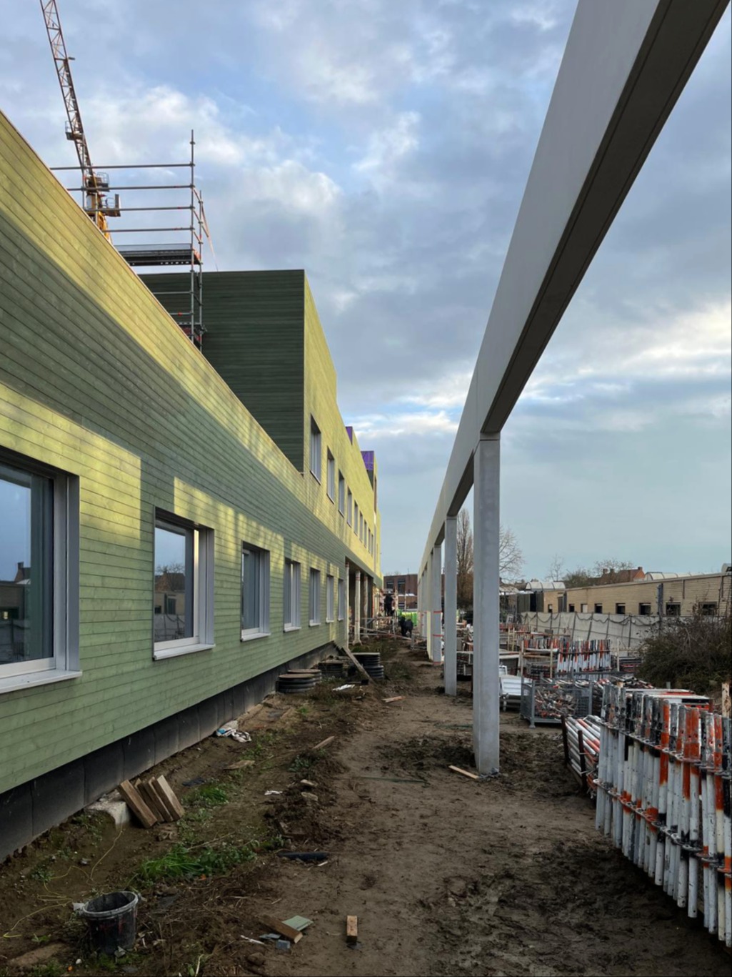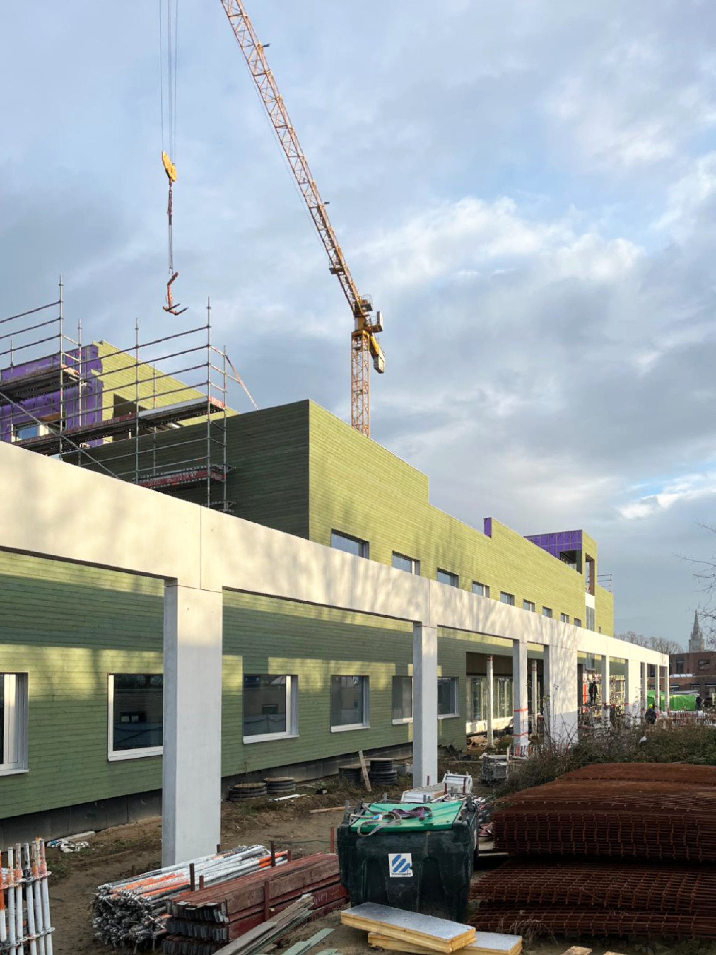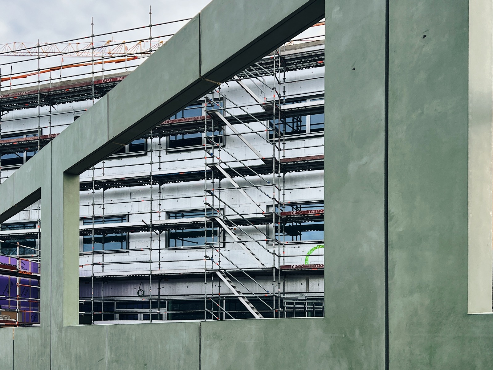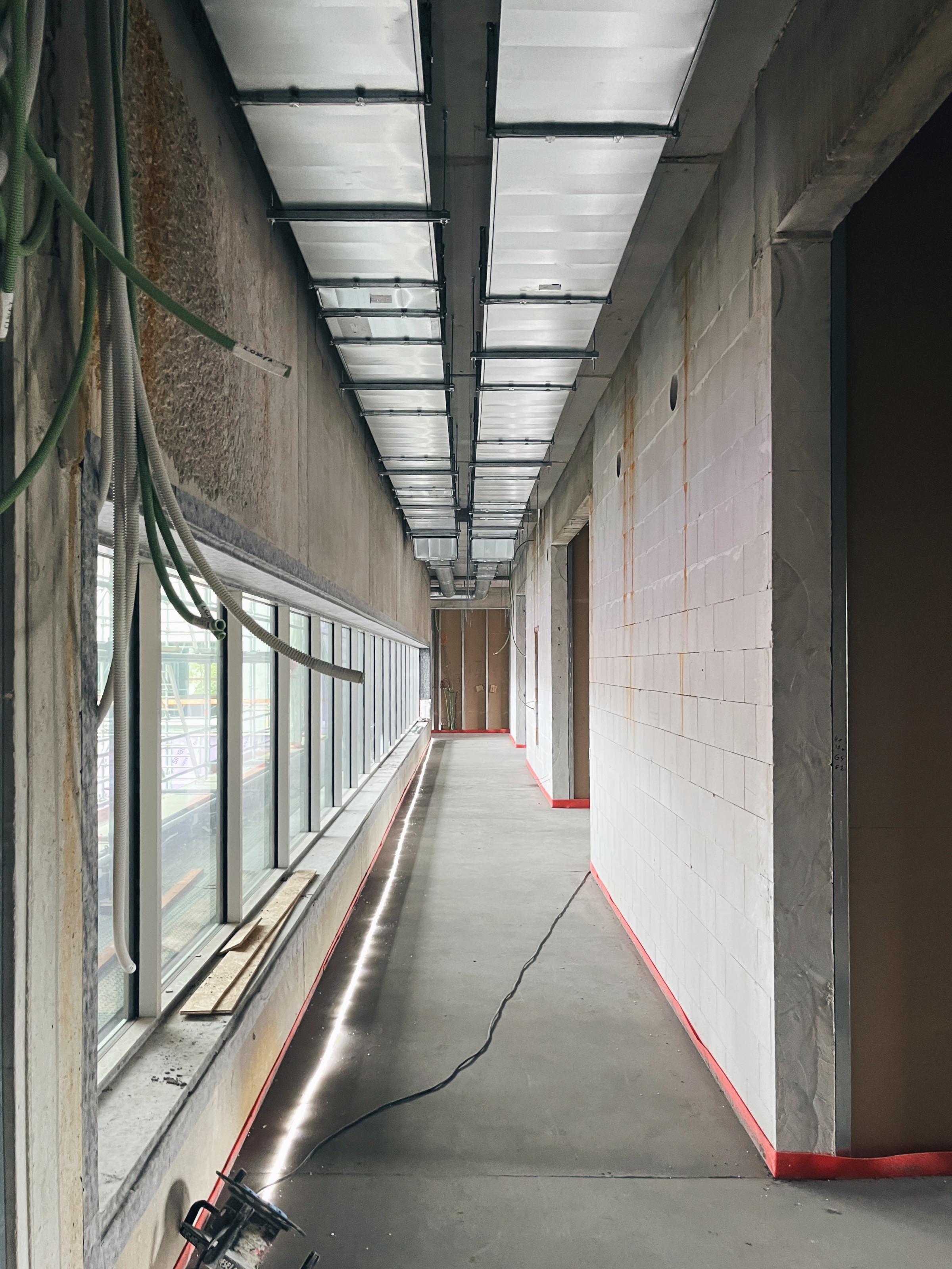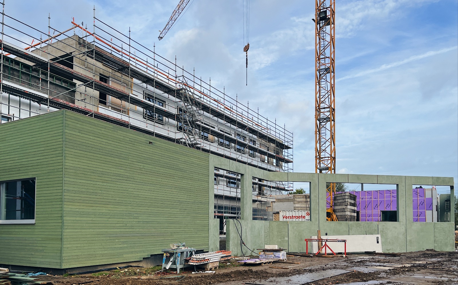 De portieken en de groene gevel komen tevoorschijn. Het gebouw is bijna wind- en waterdicht en ook de binnenruimtes krijgen steeds meer vorm.