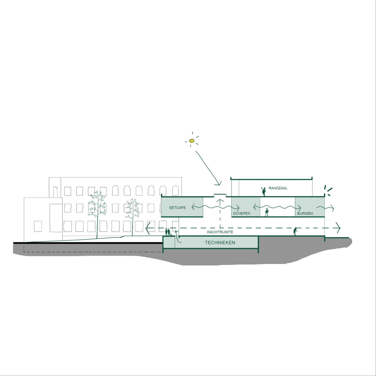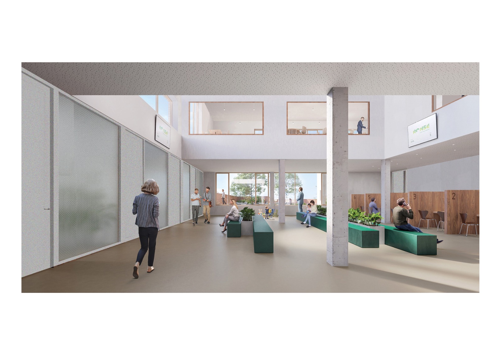 De publiekswerking wordt versterkt door duidelijke ontvangstzones, wachtruimtes met zicht op het atrium en een efficiënte organisatie van front- en backoffice. Een heldere circulatiestructuur met gescheiden publieke en personeelsstromen bevordert de oriëntatie en draagt bij aan een vlotte werking. In de kelder zijn de ondersteunende functies ondergebracht: technieken, fietsenstalling, logistiek en een centraal magazijn, die via een strategisch geplaatste lift rechtstreeks aansluiten op het gelijkvloers.