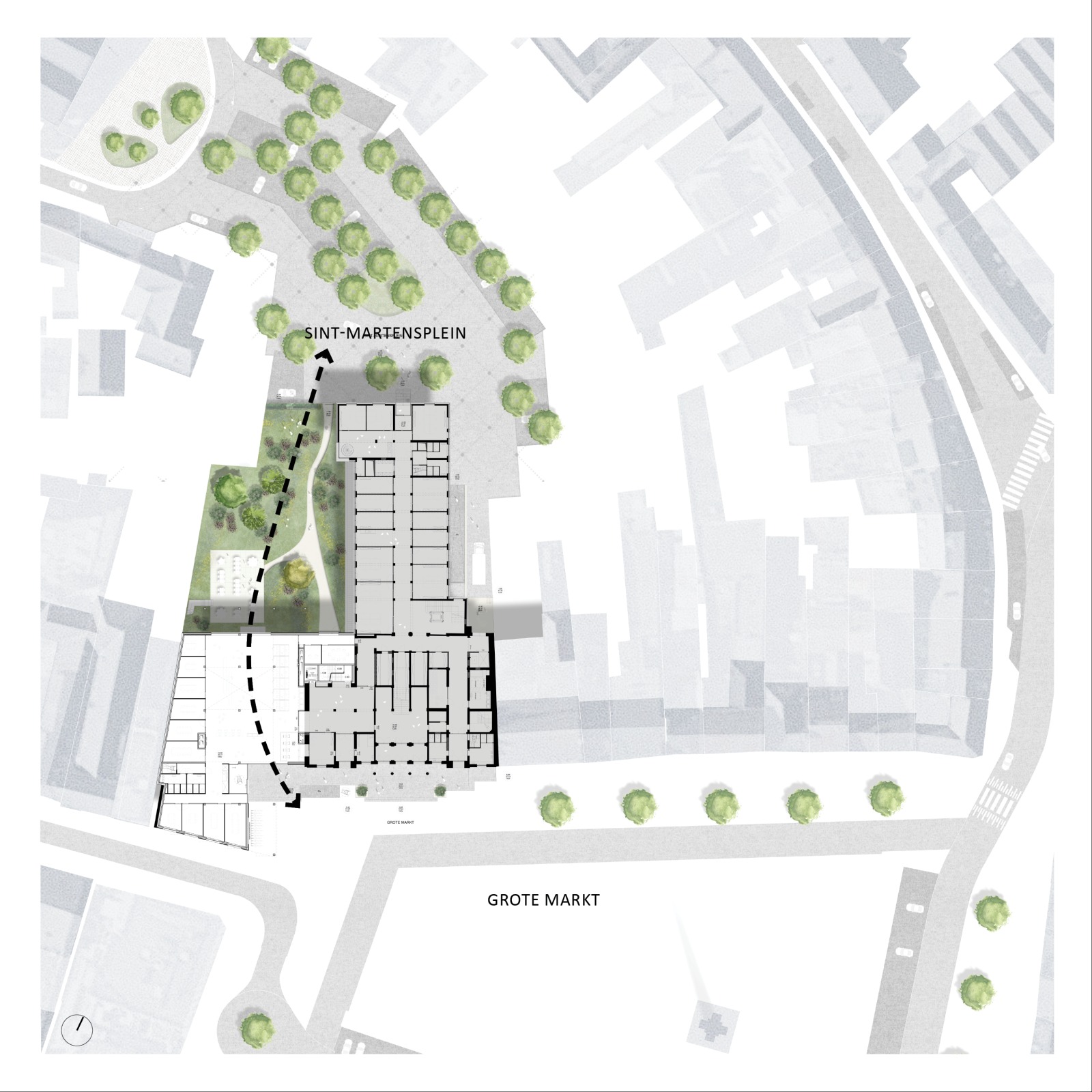 Op de hoek van de Grote Markt met de Peperstraat komt een nieuw volume dat zich zelfbewust naast het oude stadhuis plaatst. Het sluit aan op de schaal en ritmiek van de omliggende gebouwen en vormt zo een vanzelfsprekend visueel en functioneel geheel.