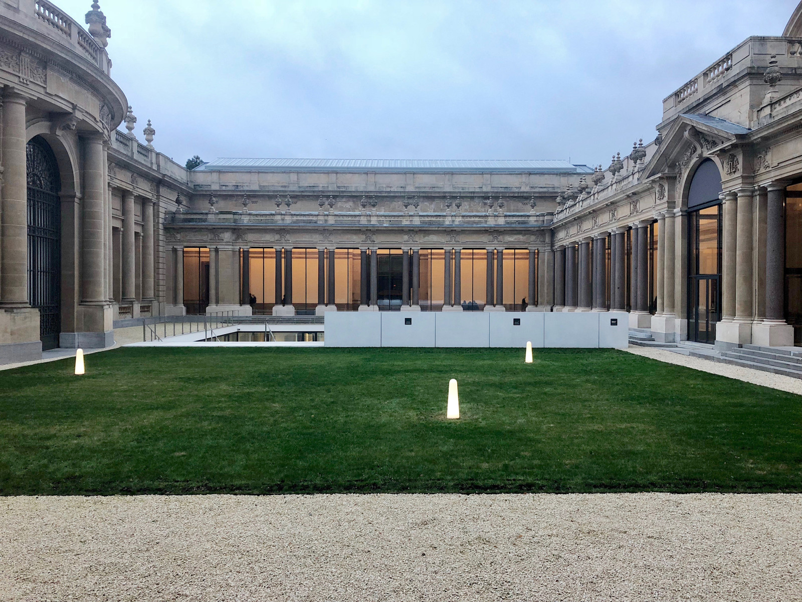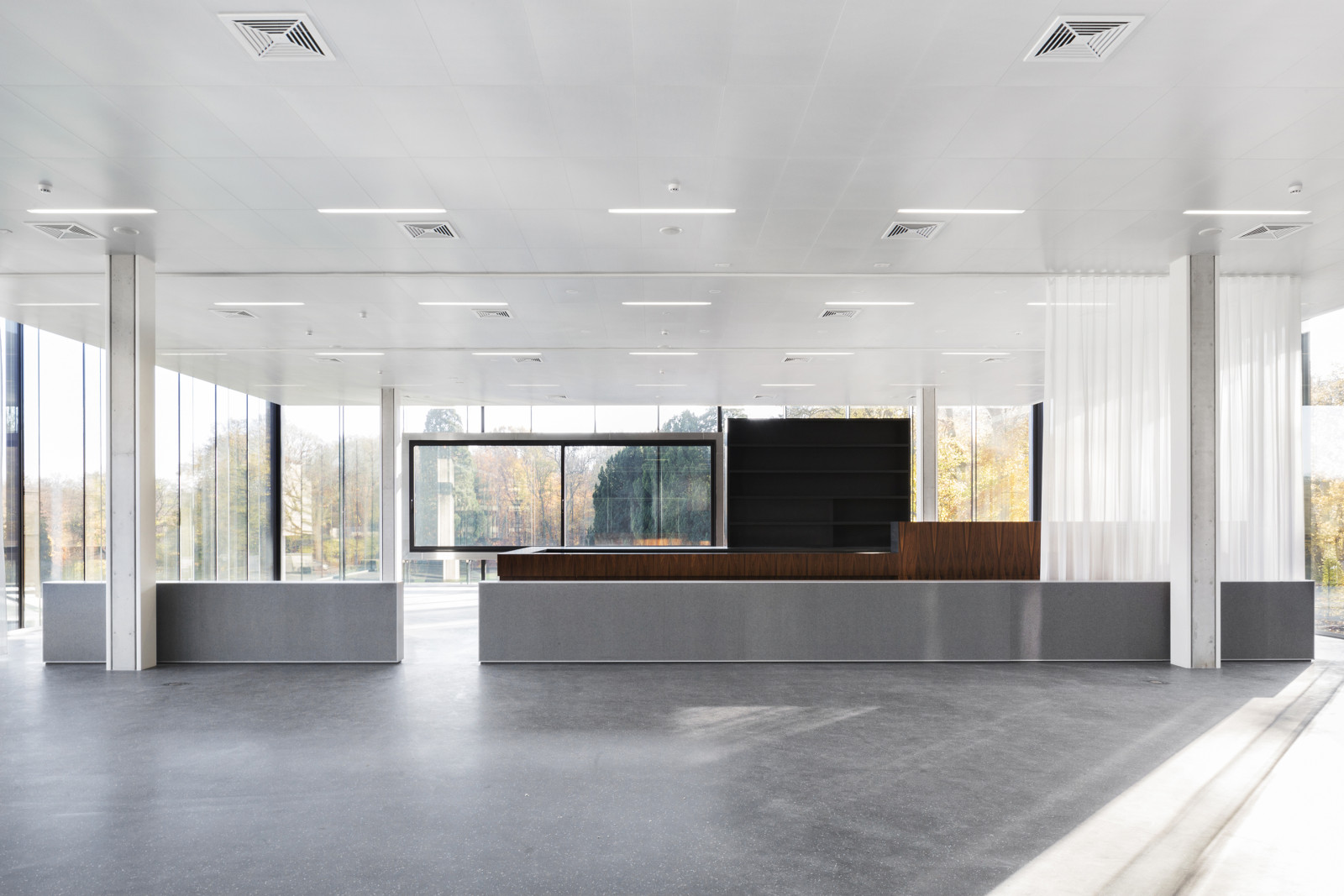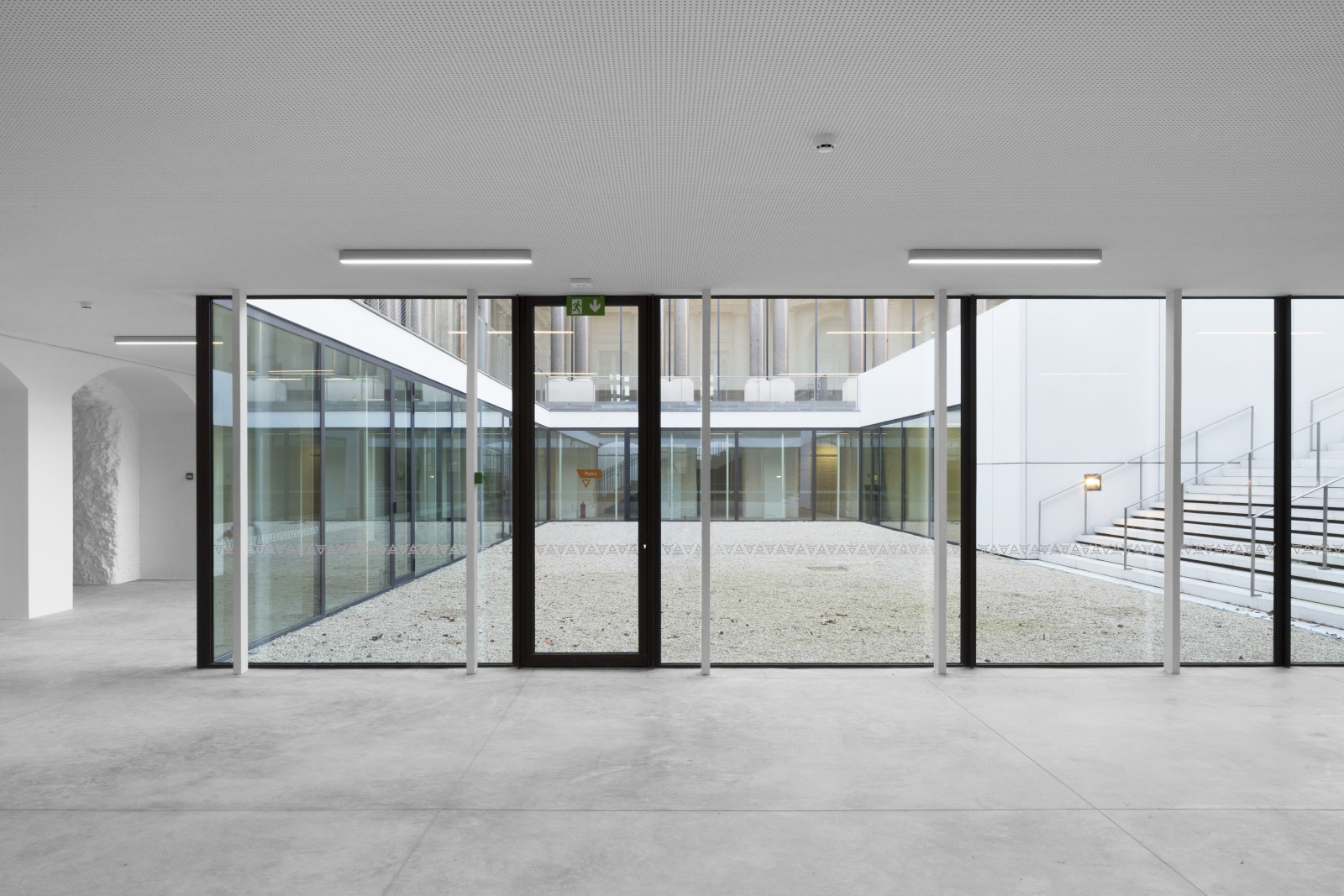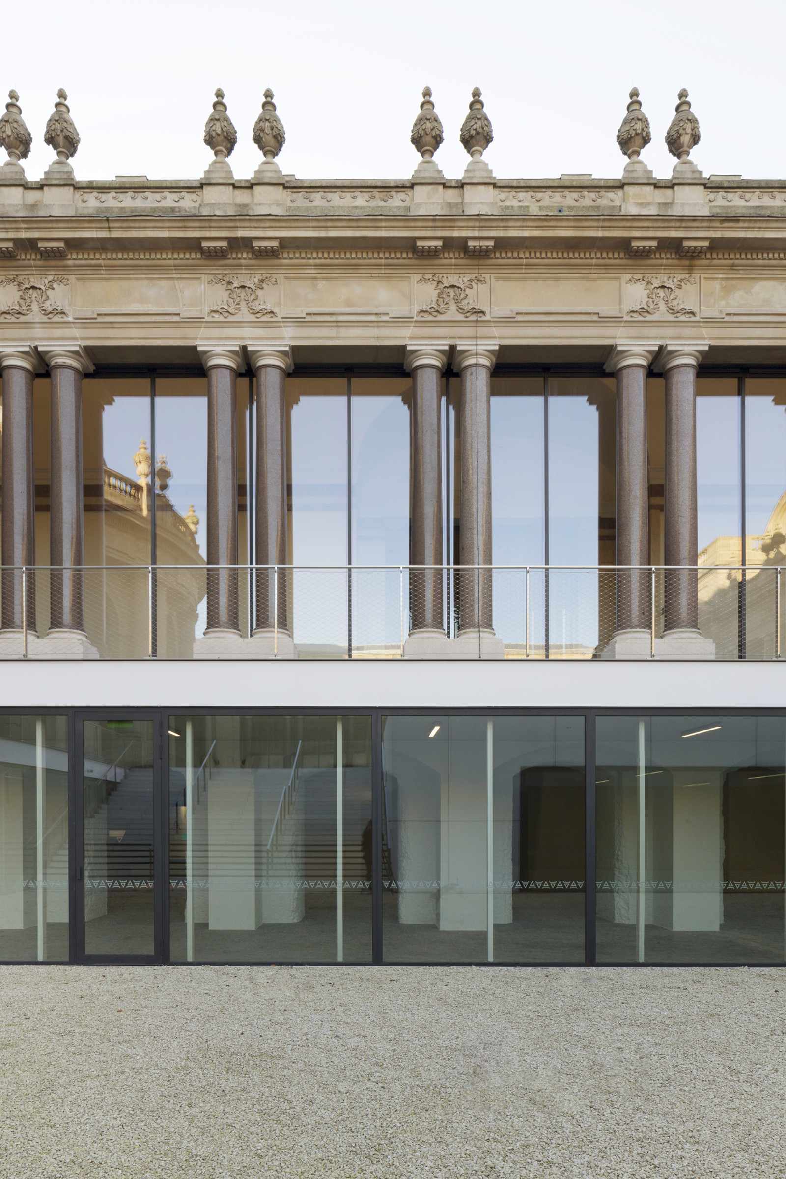 Op de langse as, nu door het nieuwe paviljoen versterkt, bevinden zich ook een lagergelegen binnenkoer en groenelementen die verwijzen naar de ondergrondse structuren.