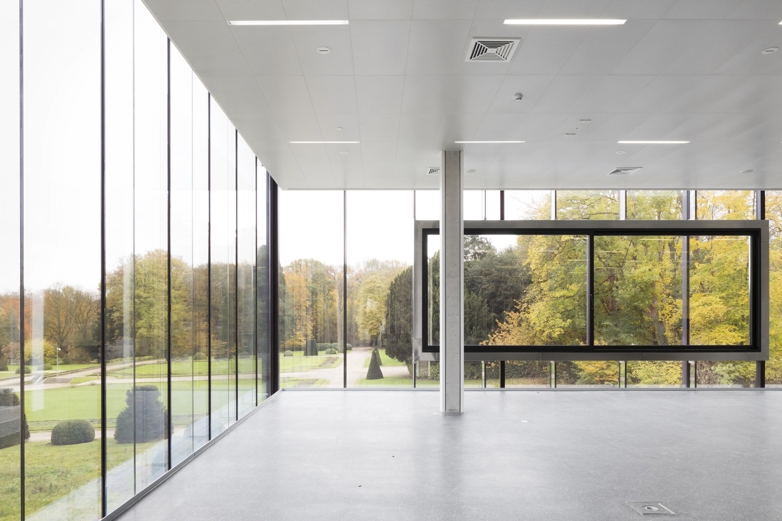 Het onthaal en de museumshop bevinden zich op het niveau van het park. Het restaurant op de eerste etage biedt de bezoekers een panoramisch zicht op de Franse tuin en het museumgebouw. De ondergrondse ruimtes van het onthaalpaviljoen, zoals de vergaderzalen, auditoriumfoyer, kinderauditoria en onthaalfaciliteiten, krijgen daglicht via een verdiepte koer. De open trappenpartij legt visuele verbanden binnen deze stapeling van functies.