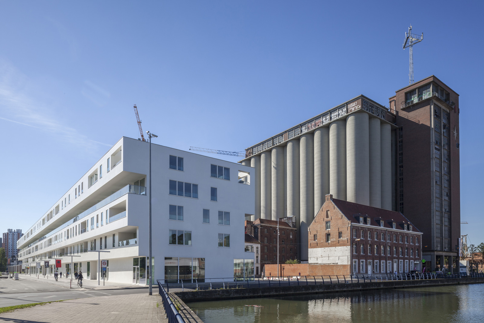 De ‘Balk’ structureert het gebied en begeleidt door zijn lengte de nieuwe fiets- en wandelroute tussen de Vaartkom en het stadscentrum. Tegelijk maakt het volume een harde grens en profileert het zich met een gladde-glanzende-wit bepleisterde huid expliciet als horizontale tegenhanger voor de ruw betonnen graansilo’s.