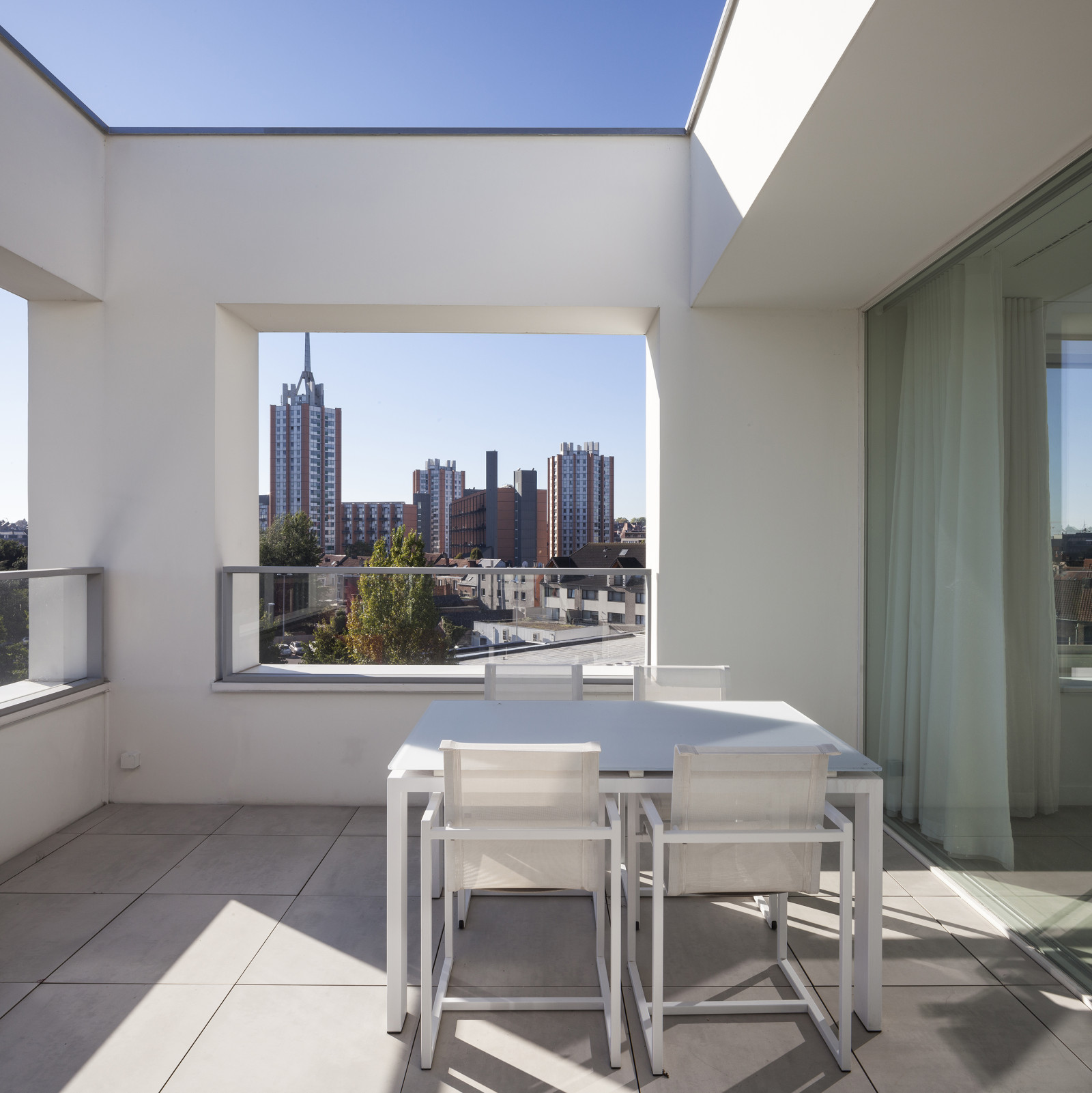 De bovenste verdieping is ingevuld met ruime appartementen met een eigen patio en grote daklichten, waardoor de ligging op de bovenste laag ten volle wordt benut.