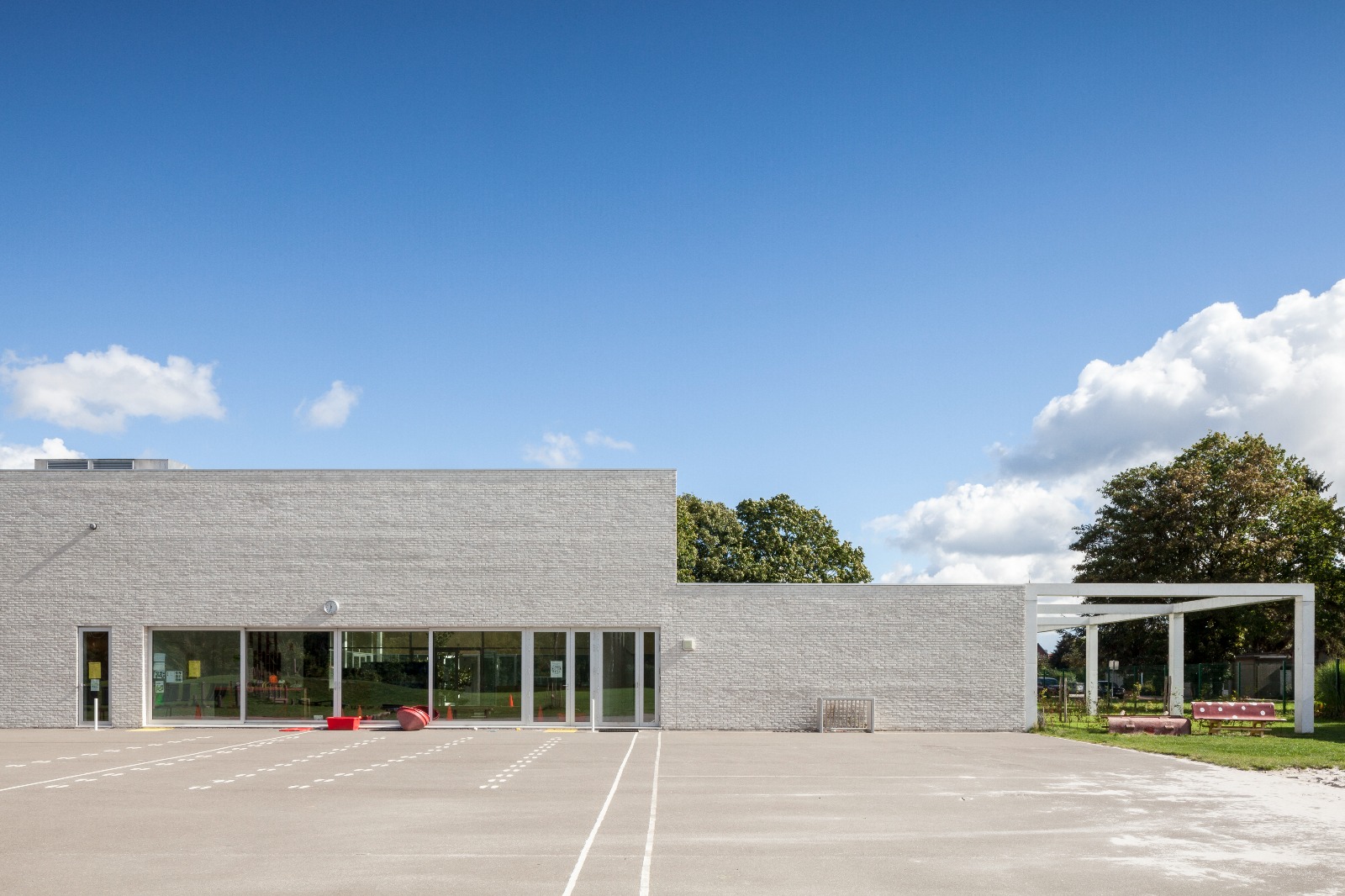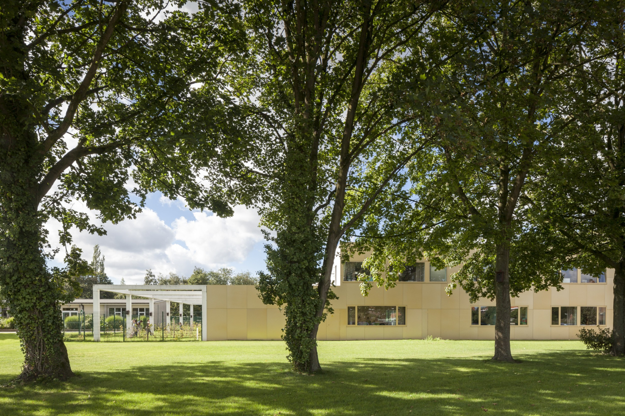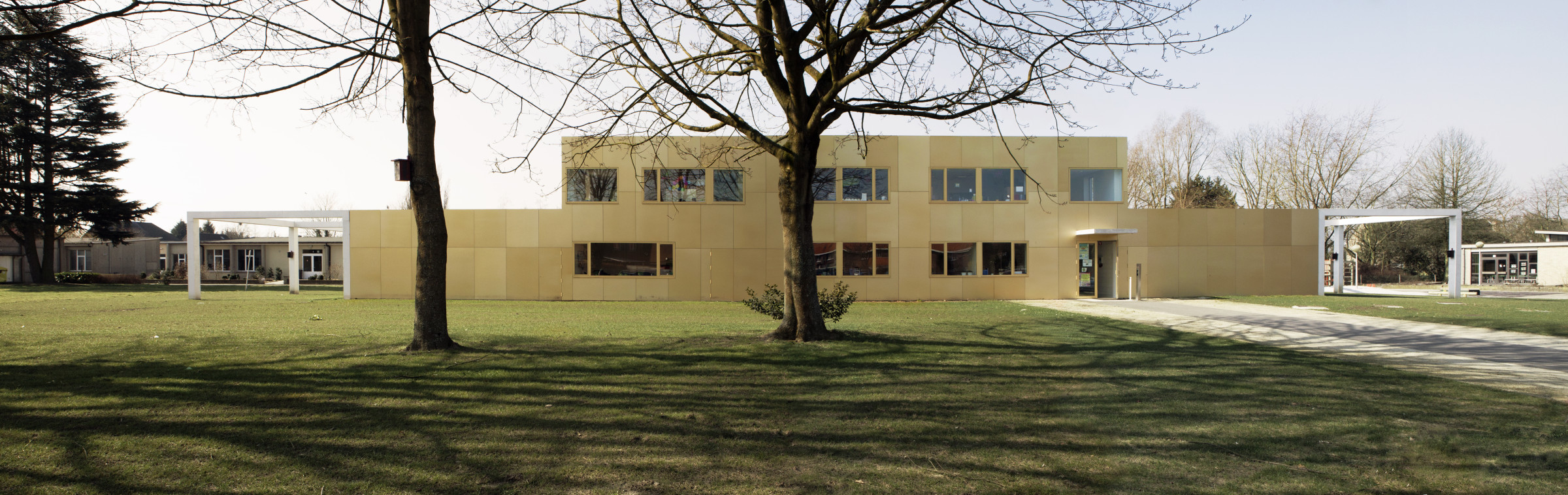 Het klaslokaal is een intieme plek waar de klas zich kan terugtrekken en waar elke vorm van afleiding geweerd wordt. Zo is er aan elke klas een omhaagde buitenruimte die als buffer fungeert naar de omgeving toe. Elke klas heeft rechtstreeks toegang tot zo’n eigen buitenruimte die bij mooi weer als een uitbreiding van het klaslokaal kan dienen. De betonnen pergolastructuur kadert per klaslokaal een private buitenruimte. Grote ramen brengen voldoende daglicht binnen.