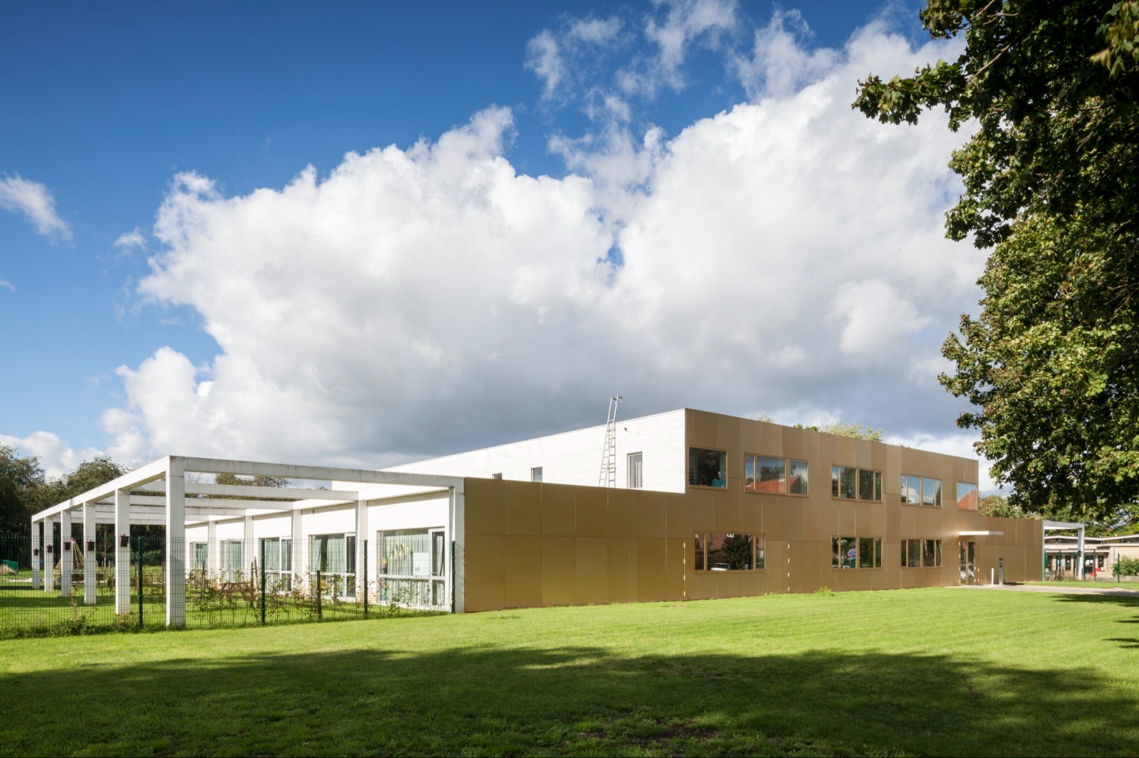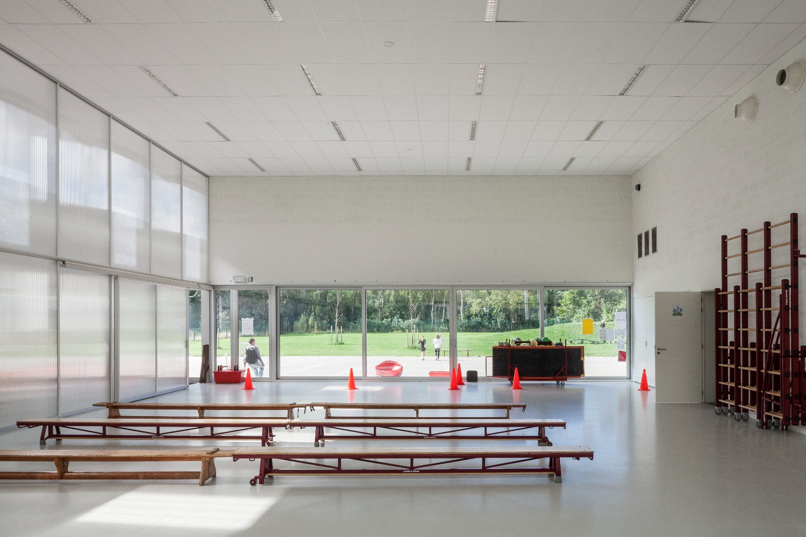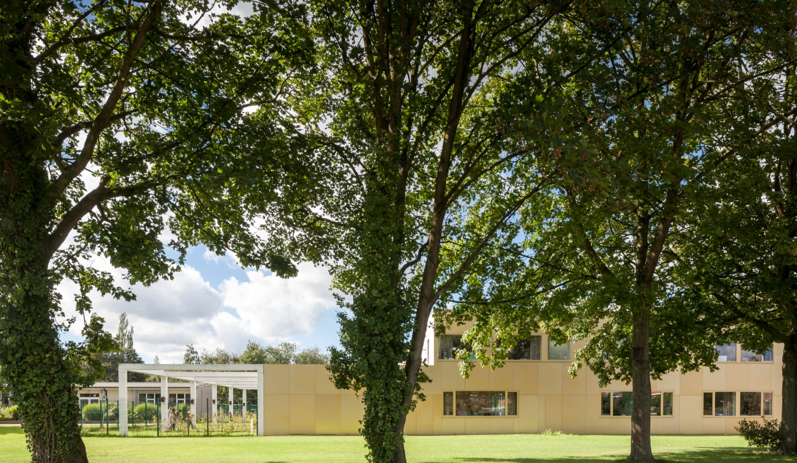 Het klaslokaal is een intieme plek waar de klas zich kan terugtrekken en waar elke vorm van afleiding geweerd wordt. Zo is er aan elke klas een omhaagde buitenruimte die als buffer fungeert naar de omgeving toe. Elke klas heeft rechtstreeks toegang tot zo’n eigen buitenruimte die bij mooi weer als een uitbreiding van het klaslokaal kan dienen. De betonnen pergolastructuur kadert per klaslokaal een private buitenruimte. Grote ramen brengen voldoende daglicht binnen.