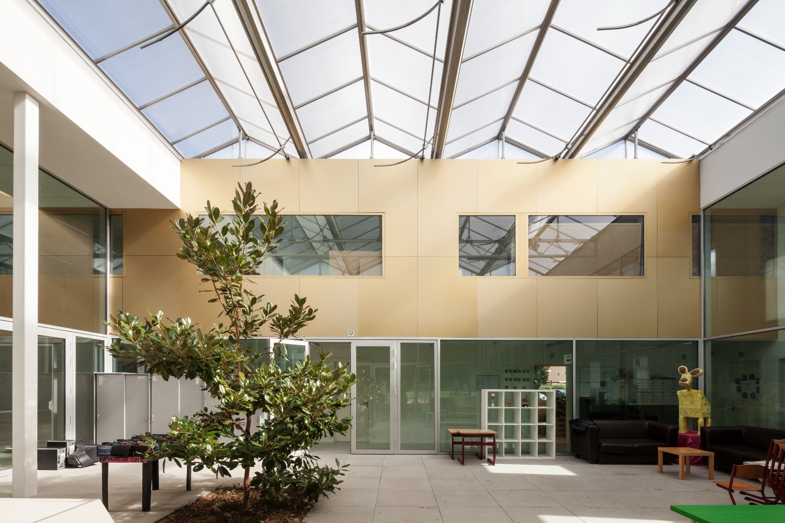 Het schoolontwerp is opgebouwd uit twee parallelle klassenvleugels met daartussen een overdekte binnenplaats. De binnenplaats heeft een cruciale rol in het functioneren van de school. Ze is het hart van de school en doet dienst als circulatiezone, speelplaats, turnzaal, refter, theater, vergaderzaal, feestzaal, enzovoort. Hier wordt de gemeenschapszin het sterkst gearticuleerd. De binnenplaats is dubbel zo hoog als de klaslokalen en is samengesteld uit de polyvalente zaal, de oefenzaal kiné, het technisch blok en een patio. Rondom ligt de circulatie als een (omme-)gang. De daglichttoetreding in de binnenplaats gebeurt via de gevelvlakken van de patio en de achtergevel en via bovenlichten in de circulatieassen. Het daglicht in de polyvalente zaal en de oefenzaal kiné komt gefilterd binnen via doorschijnend policarbonaat wanden.