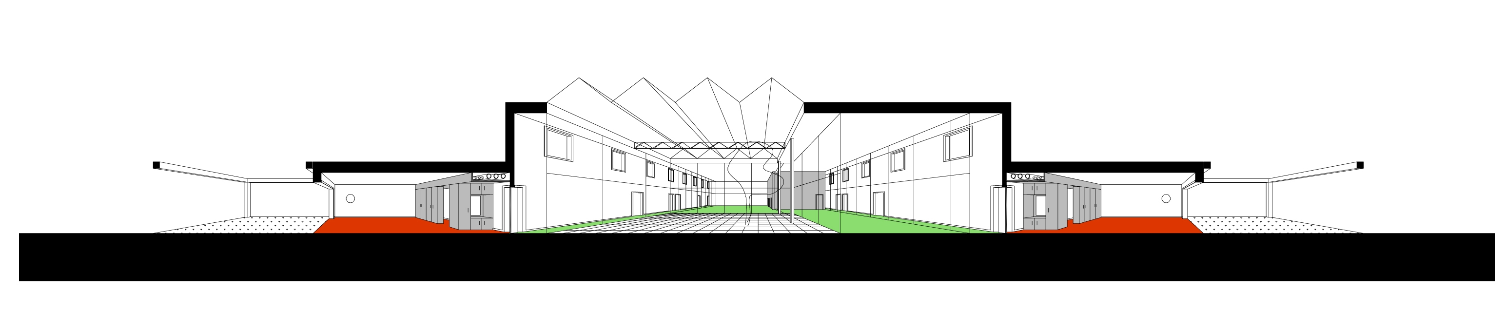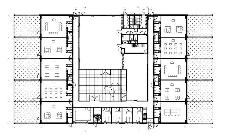 Tussen de twee klassenvleugels is een gestapelde serie lokalen opgespannen waarin administratie en de onderwijsgerichte diensten in ondergebracht zijn en zich tonen aan de straatkant. Door de eenvoudige opbouw kent het gebouw een heldere structuur. De school is bijgevolg zeer duidelijk leesbaar voor de ‘buitengewone’ bewoners/gebruikers. De doorgedreven transparantie van de binnenplaats maakt het gebouw intern zeer open, terwijl het zich naar de omgeving eerder gesloten toont. De architectuur van de school maakt een veelvoudig en creatief gebruik van de ruimte mogelijk en creëert een sfeer van samenhorigheid.