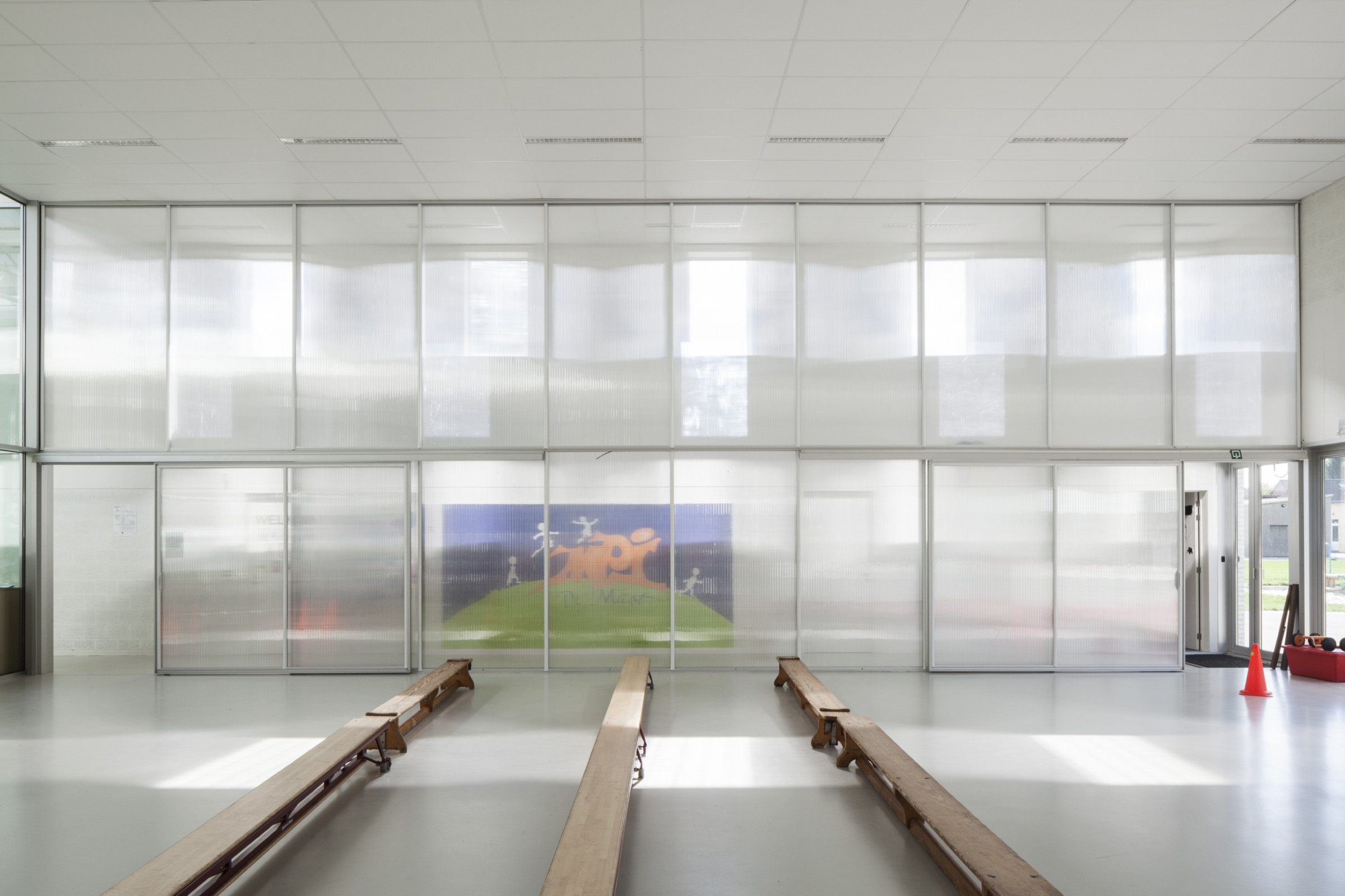 Per klas wordt een time-out zone voorzien, een ruimte die rechtstreeks vanuit de klas toegankelijk is en waar eenvoudig opgesteld met het vaste meubilair en een gordijn of vouwpanelen.