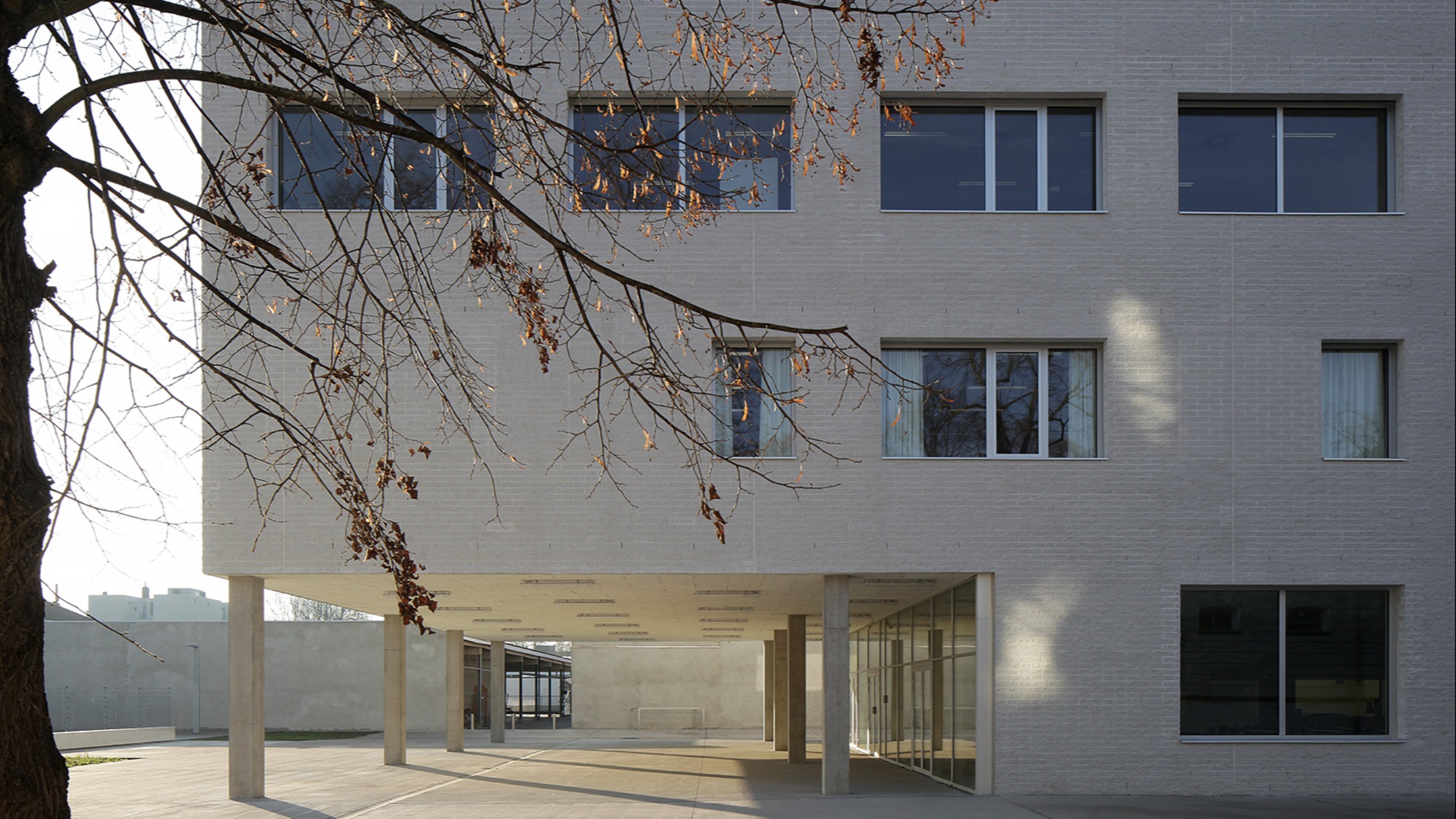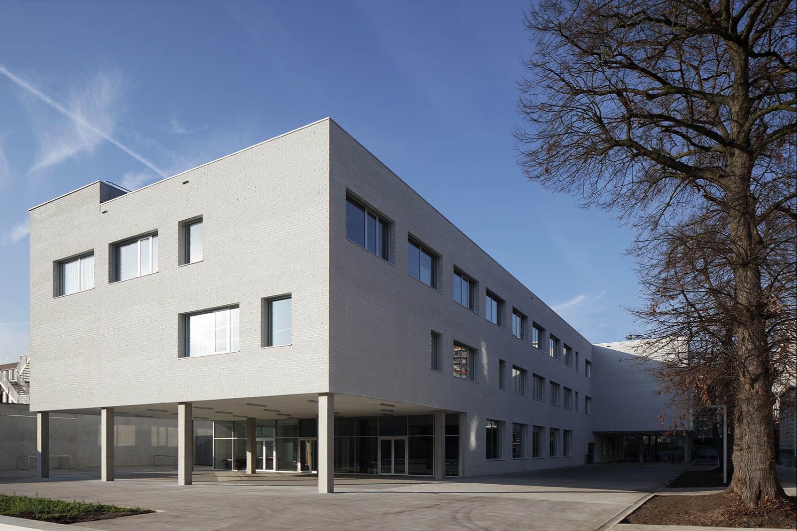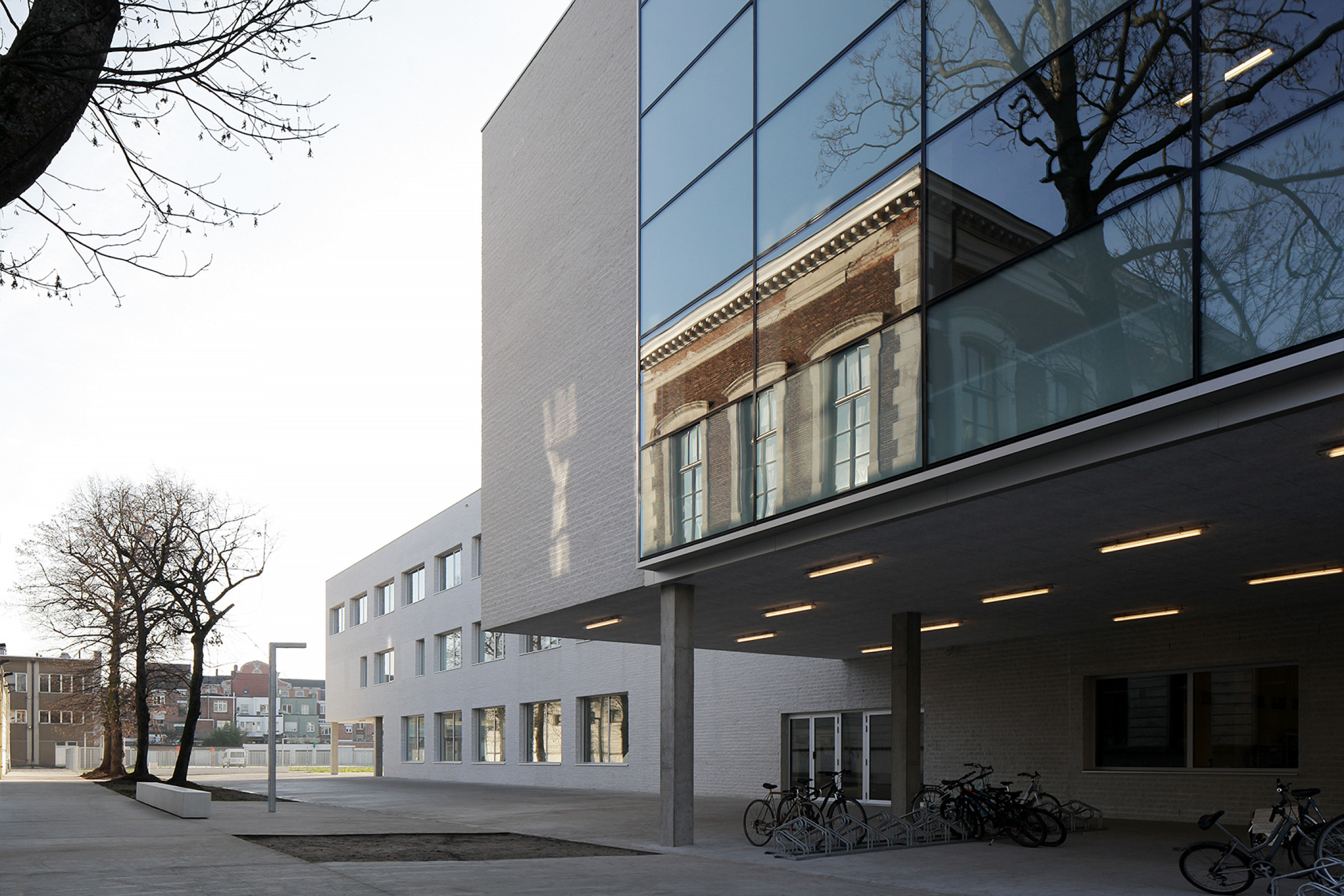 De nieuwbouw staat als compact en krachtig bouwvolume op de grens van de site, in lijn met de bestaande schoolgebouwen langs de Offerlaan. Een grote uitsnijding van het L-vormig bouwvolume markeert een overdekte inkomzone, een doorgang naar de speelplaats en biedt plaats aan een beschutte fietsstalling. Een tweede strategische uitsnijding gericht naar het binnengebied doet dienst als overdekte speelplaats.