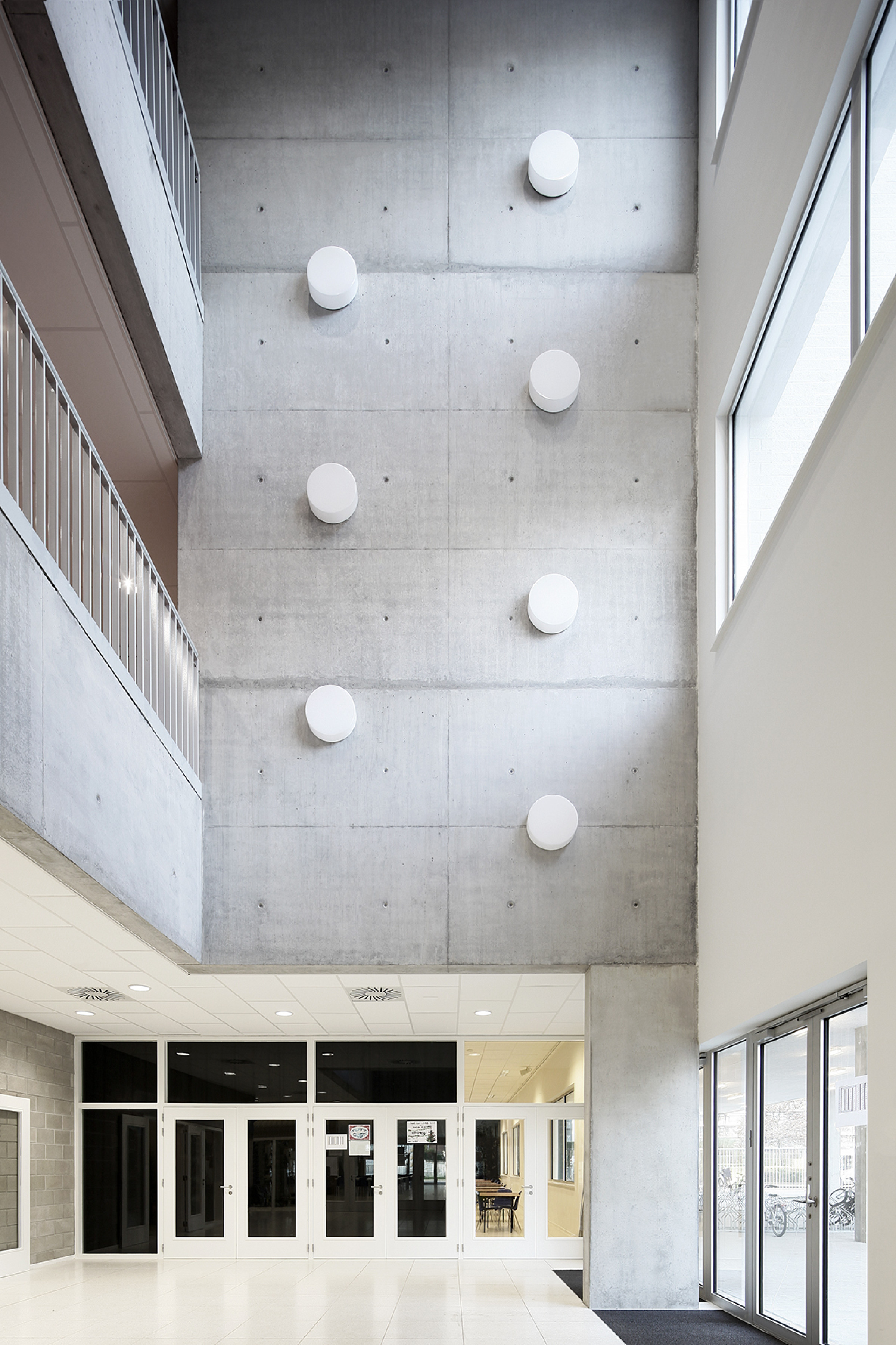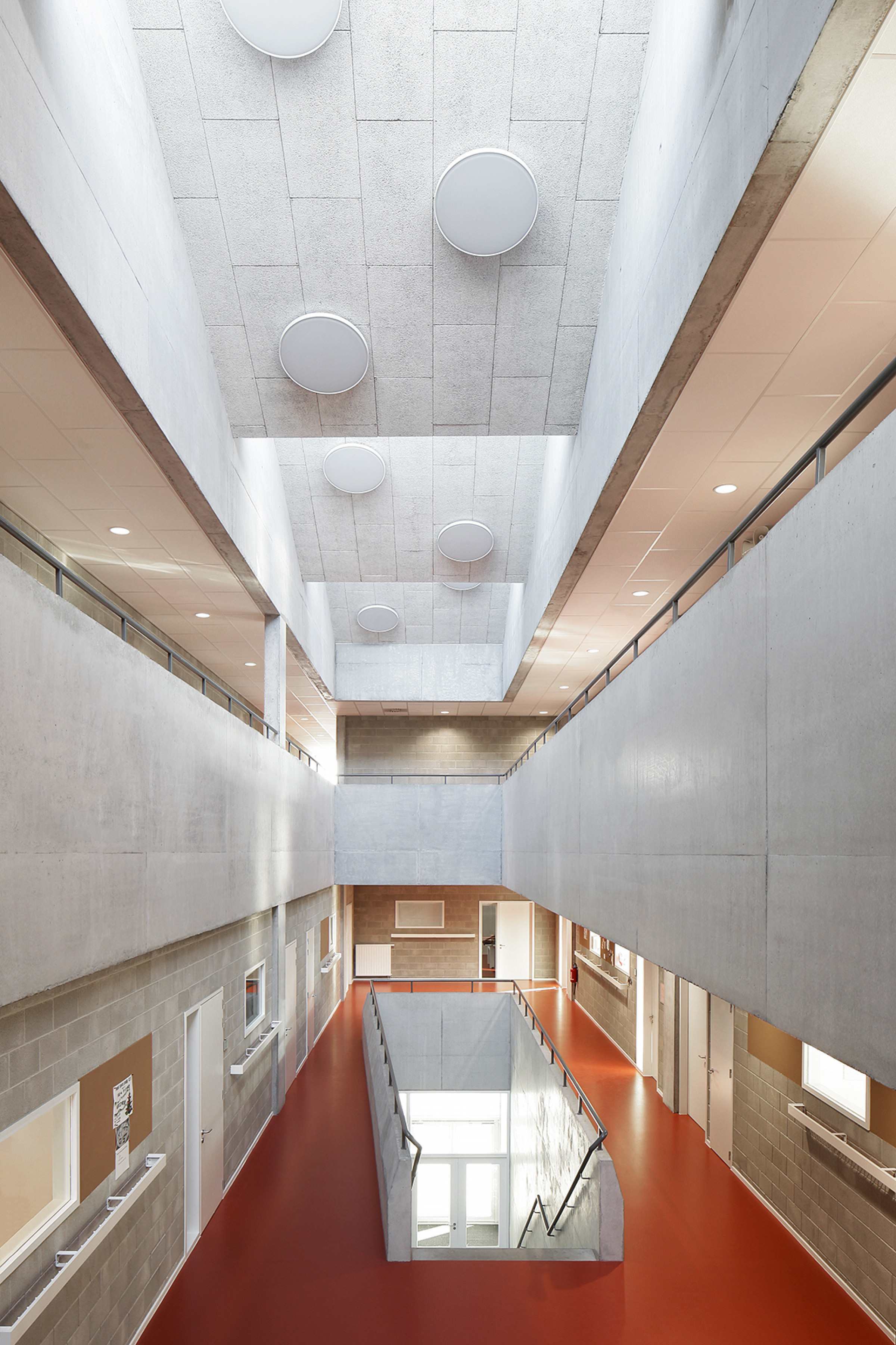 Op het gelijkvloers van de school bevinden zich de refter en polyvalente zaal. De refter wordt omzoomd door speelplaatsen en is via verschillende zijden toegankelijk. Er is ruimte voorzien voor een opwarmkeuken en bijhorige bergruimten. Een gesloten betonnen trapvolume in de refter geeft rechtstreeks uit op de klaslokalen op de verdiepingen en op de overdekte speelplaats. Deze ‘trapsculptuur’ zoneert de refter zodat gelijktijdig diverse activiteiten in de refter georganiseerd kunnen worden.