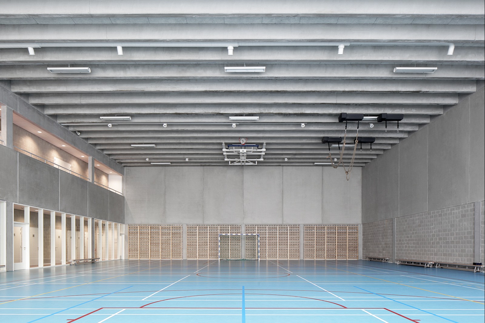 Buiten schooluren kunnen de turnzaal, polyvalente zaal en refter verhuurd worden, met afzonderlijke toegangen via de centrale inkomhal om het schoolgedeelte af te schermen. Indien nodig biedt een extra toegang vanaf de laad- en loszone directe toegang tot de turnzaal, zodat gebruikersstromen gescheiden blijven.