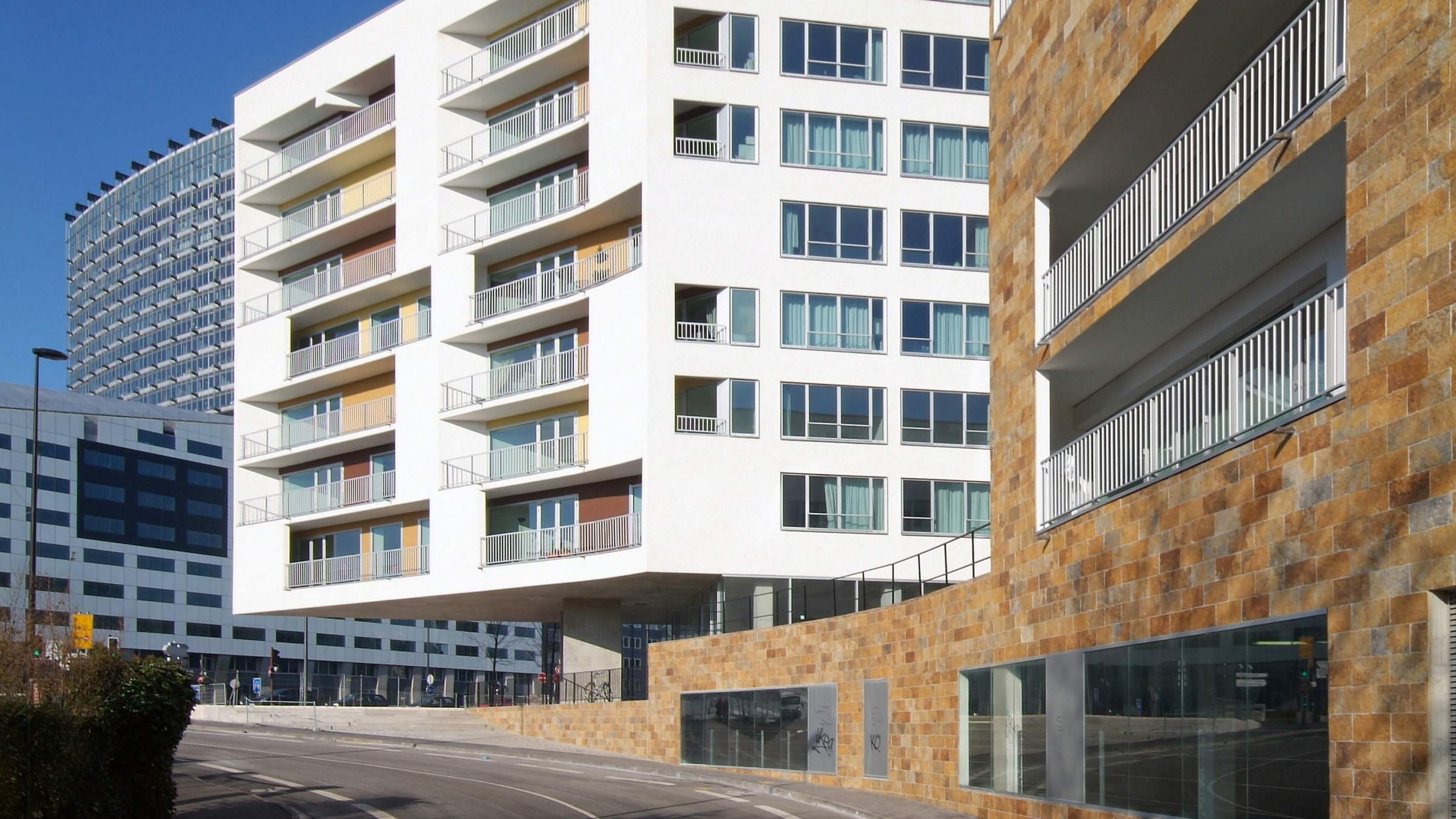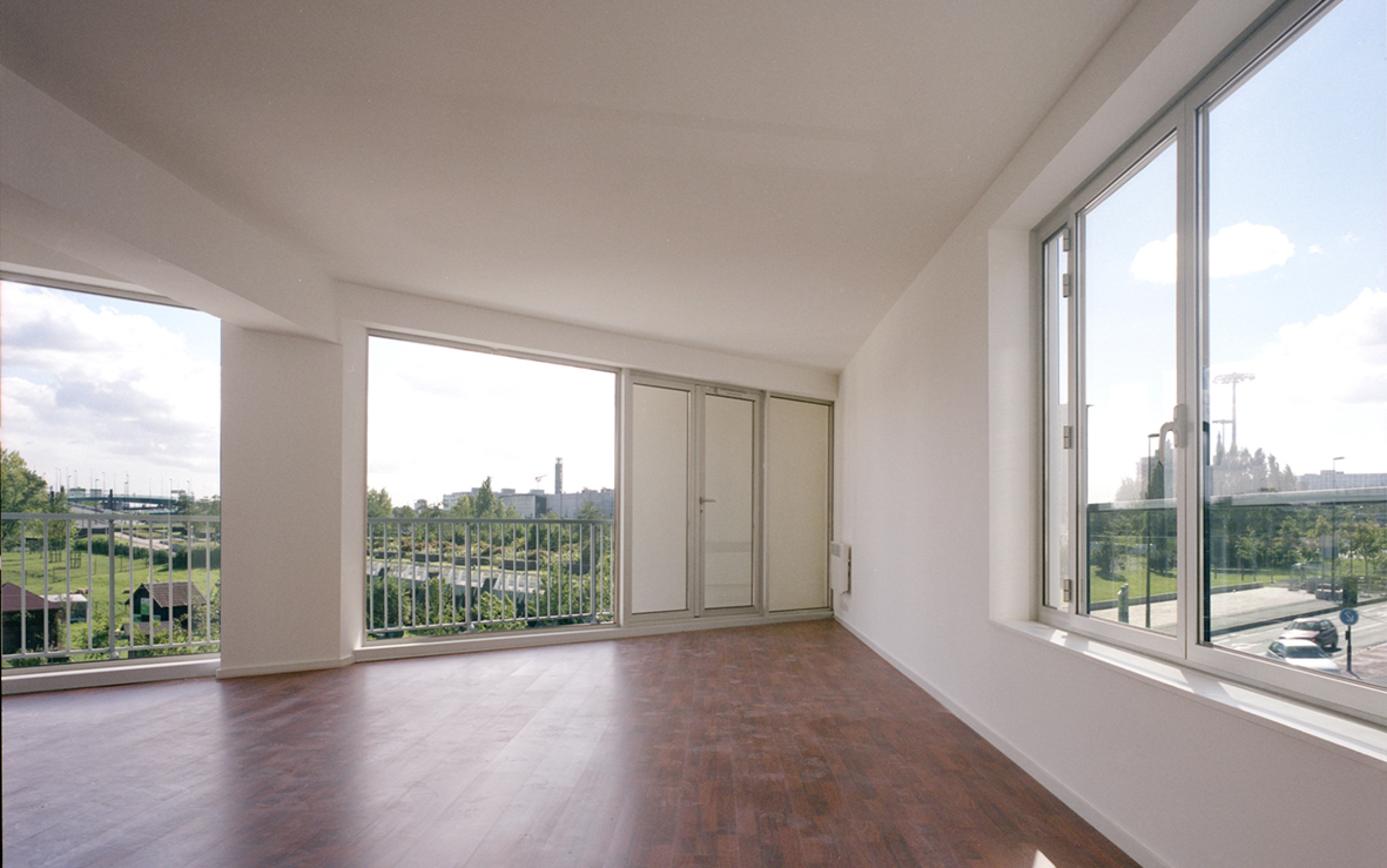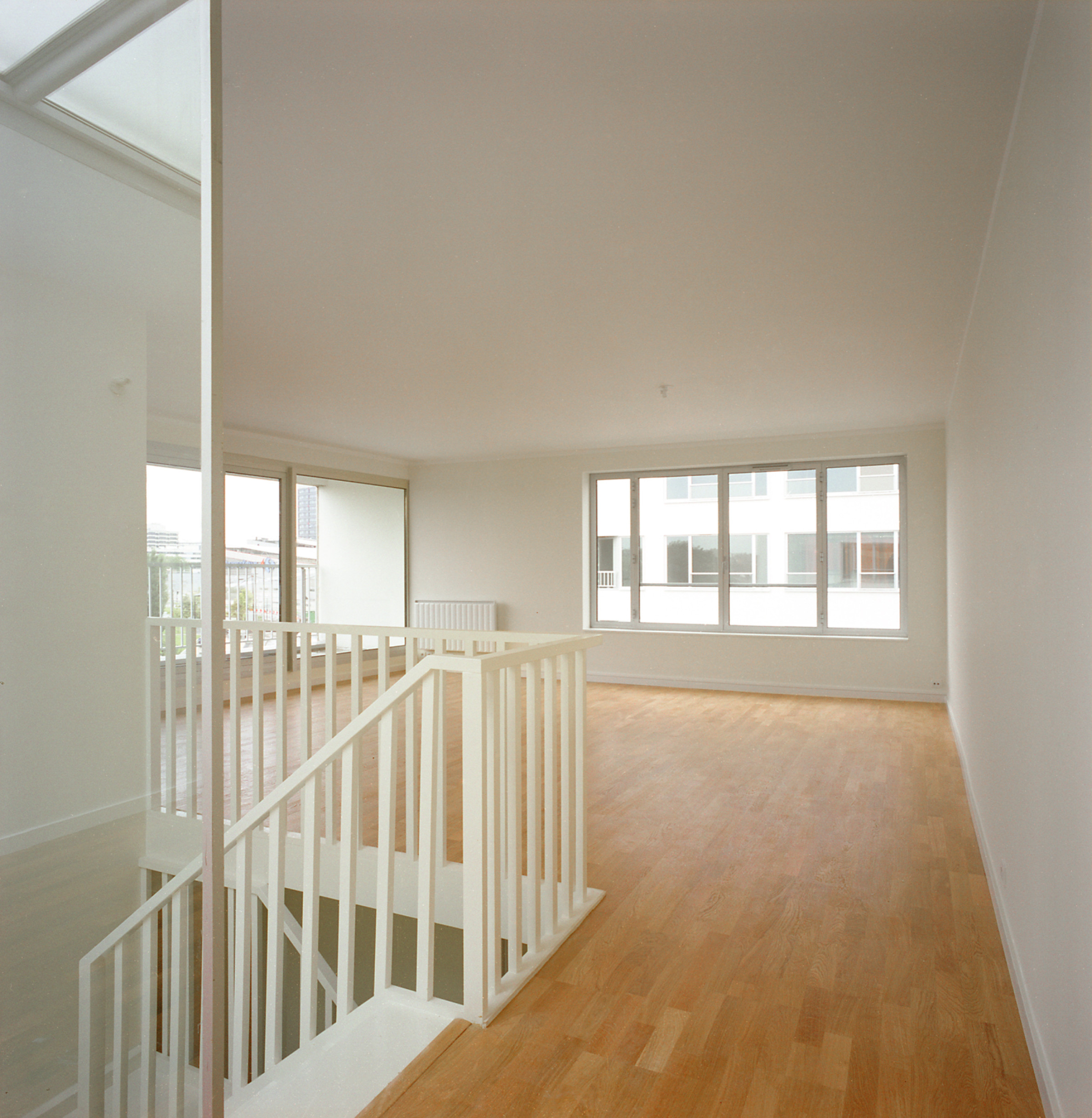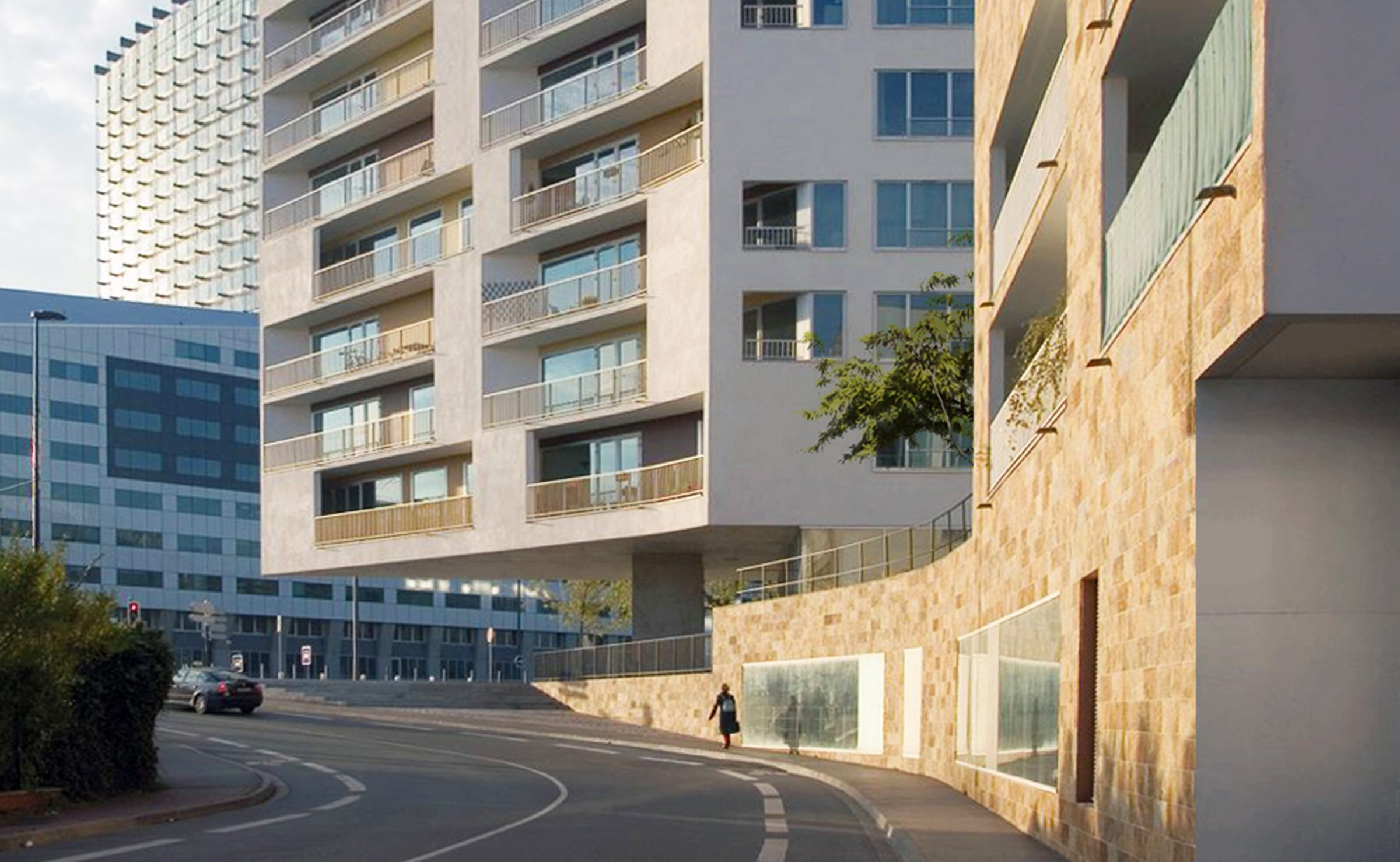 Boven op deze diverse stapeling staan twee woongebouwen waarin iedere woning ruim voorzien is van daglicht en uitzicht en beschikt over een buitenruimte in de vorm van een terras, loggia, patio of daktuin. De hoge delen van de gebouwen staan geschrankt ten opzichte van elkaar waardoor lichten en zichten gevrijwaard blijven. De vervaarlijk uitkragende punt van het hoekgebouw reageert op de beperkingen van een ondergrond vol metrolijnen en markeert de entree naar de wijk vanuit Euralille en in de bocht van de Rue Eugène Jacquet.