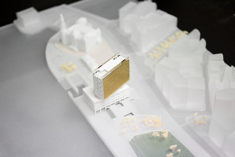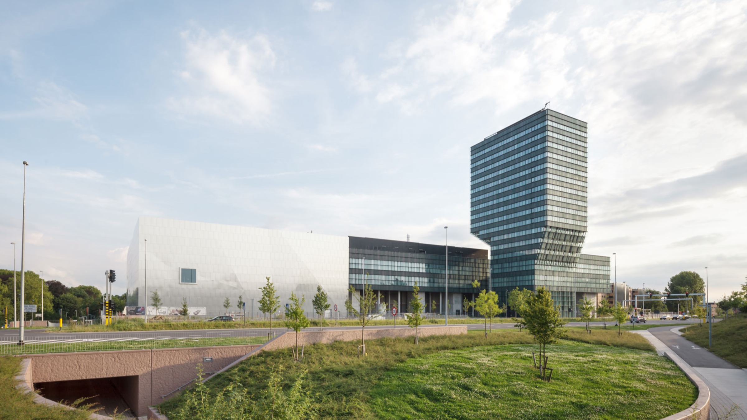 De gevel krijgt verschillende knikken waardoor het gebouw een relatie aangaat met de omgeving. Deze wordt weergegeven in een gefragmenteerd beeld. Door de hoekverdraaiingen van de panelen ontstaan er naast verschillende vlakken met projecties van de lucht, van de grond, van het auditoriumgebouw en de glazen gevel. Het gebouw wordt opgenomen in zijn omgeving door het te laten “dazzelen”, refererend naar dazzle paintings. De perceptie wordt vervormd, ver wordt dicht, boven wordt onder, groot wordt klein, lucht wordt groen. Een spel van mat en glanzend, beeld en licht, stilstand en beweging.