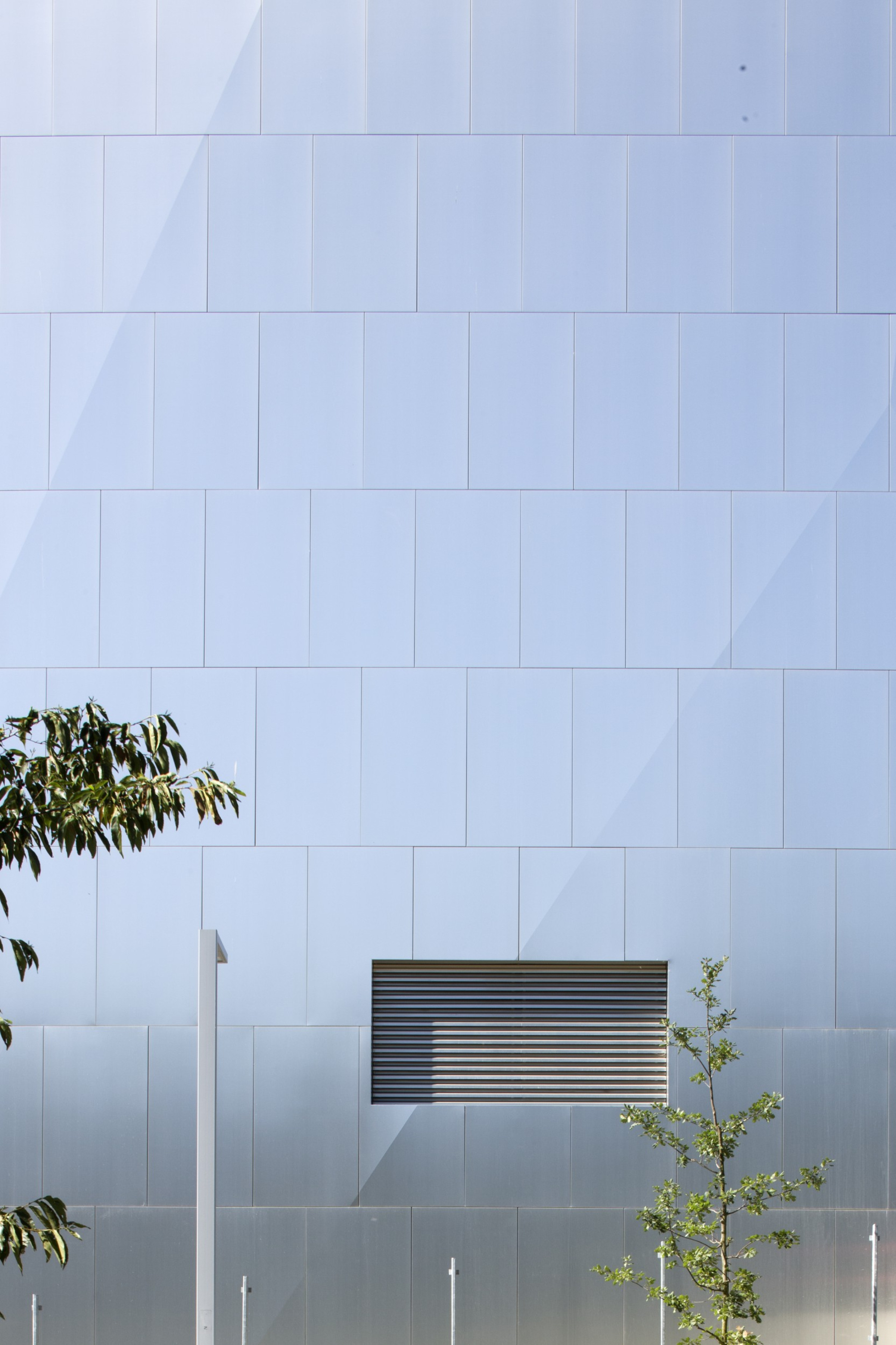 De aluminium gevel heeft een high-tech uitstraling en is het uithangbord voor Imec langs één van de belangrijkste invalswegen van Leuven. Het vinden van een aluminium afwerking met de juiste karakteristieken was geen eenvoudige opgave. Naast de esthetische vereisten zoals de juiste weerspiegeling, kleur en diepte diende het materiaal ook aan heel wat technische aspecten te voldoen. Meerdere ophangsystemen werden onderzocht en afgewogen. Details werden gedurende het ontwerpproces meervoudig aangepast om tot de gewenste scherpte en verfijning te komen.