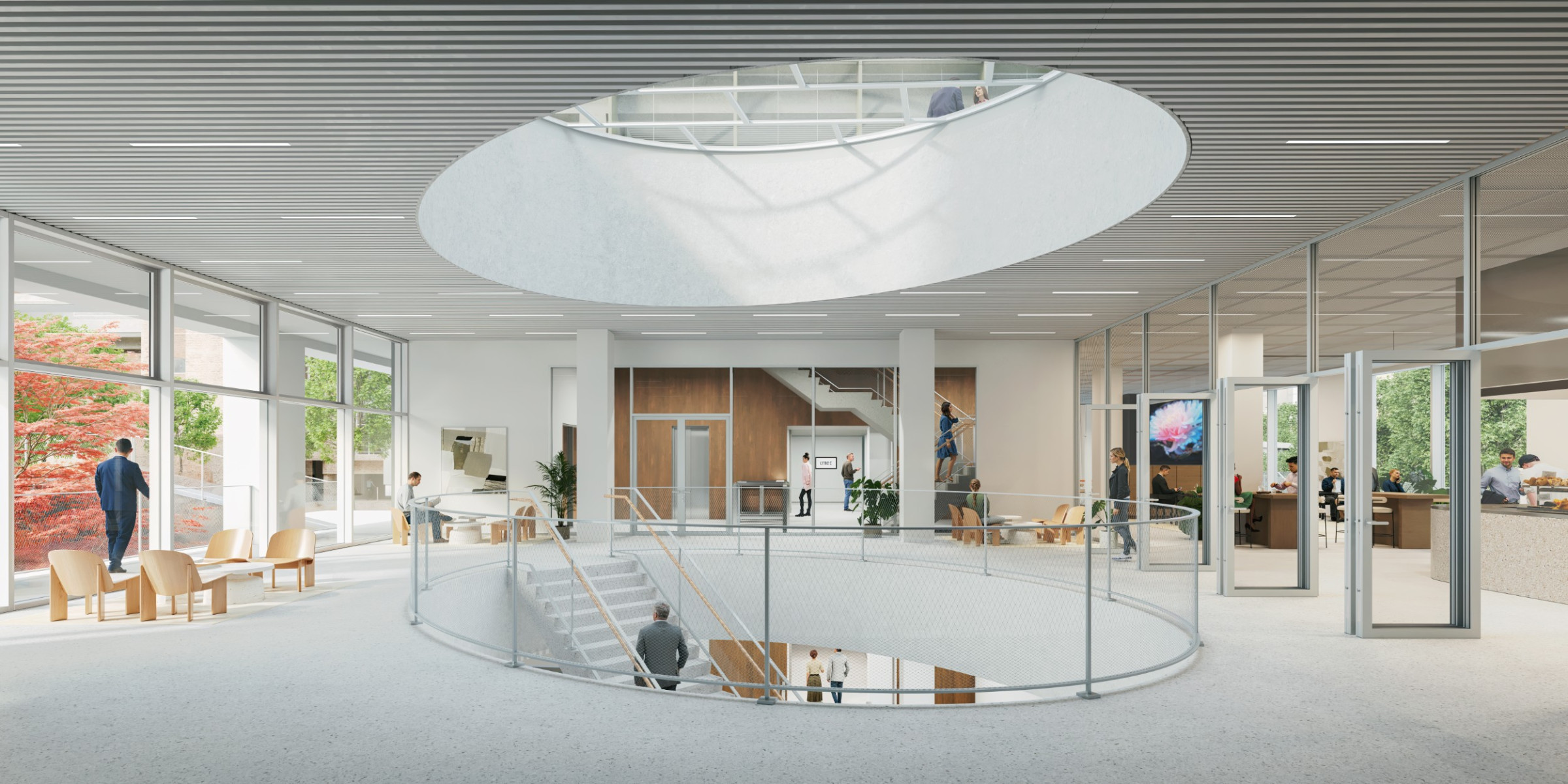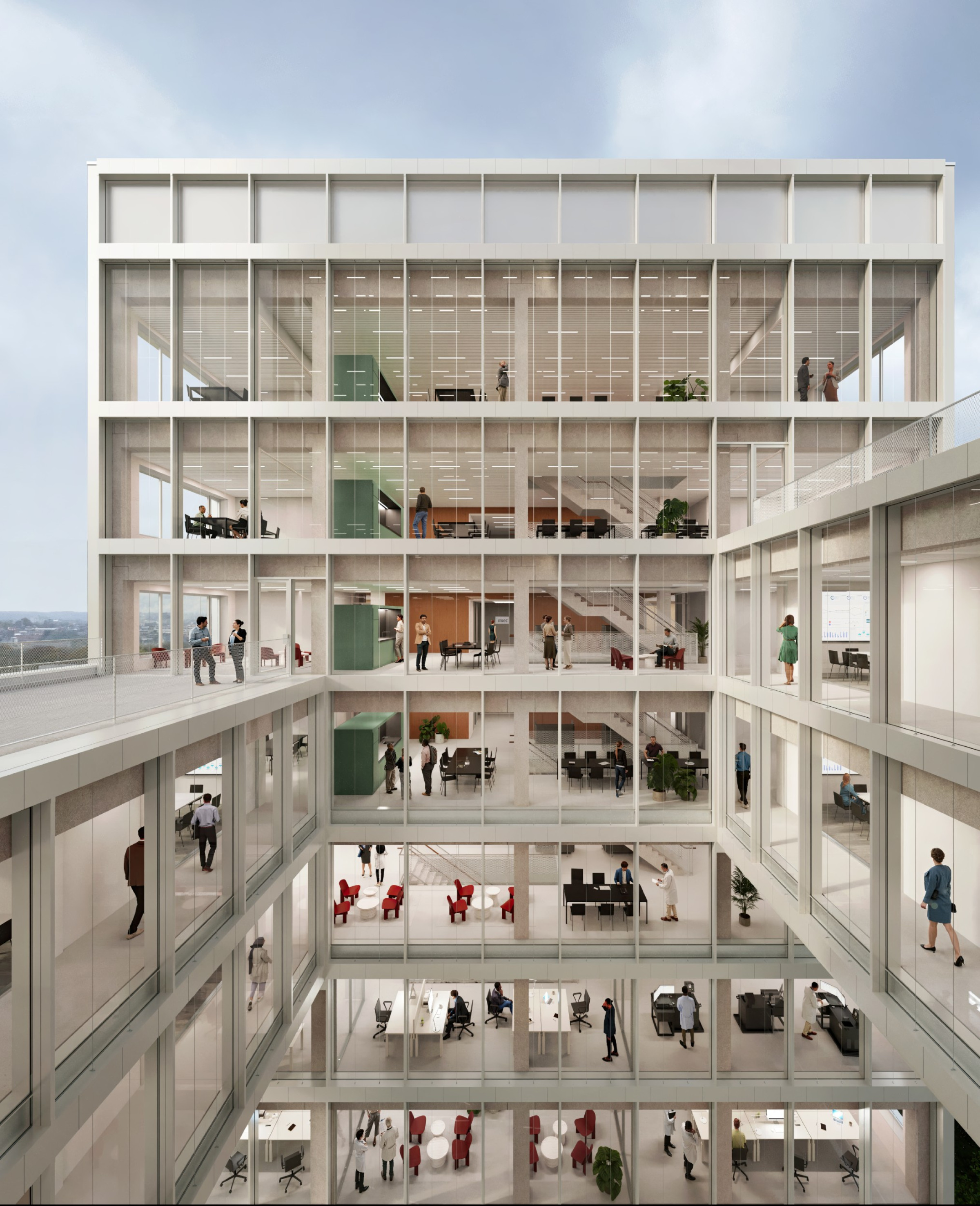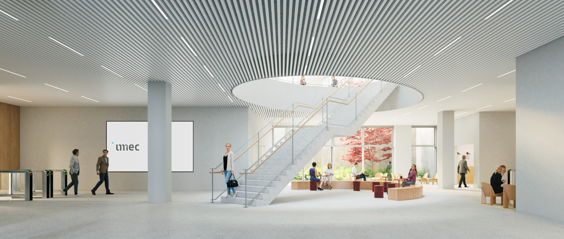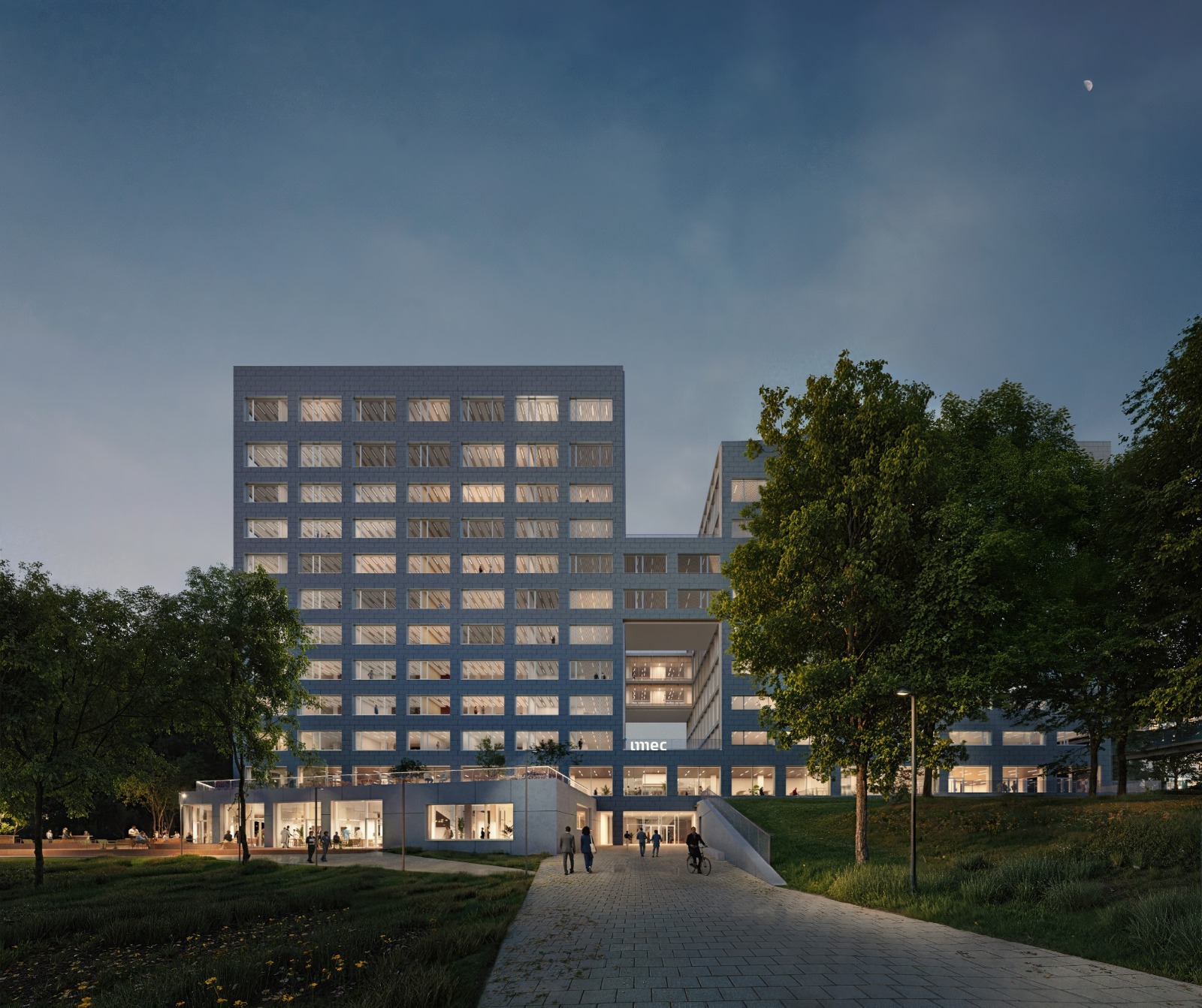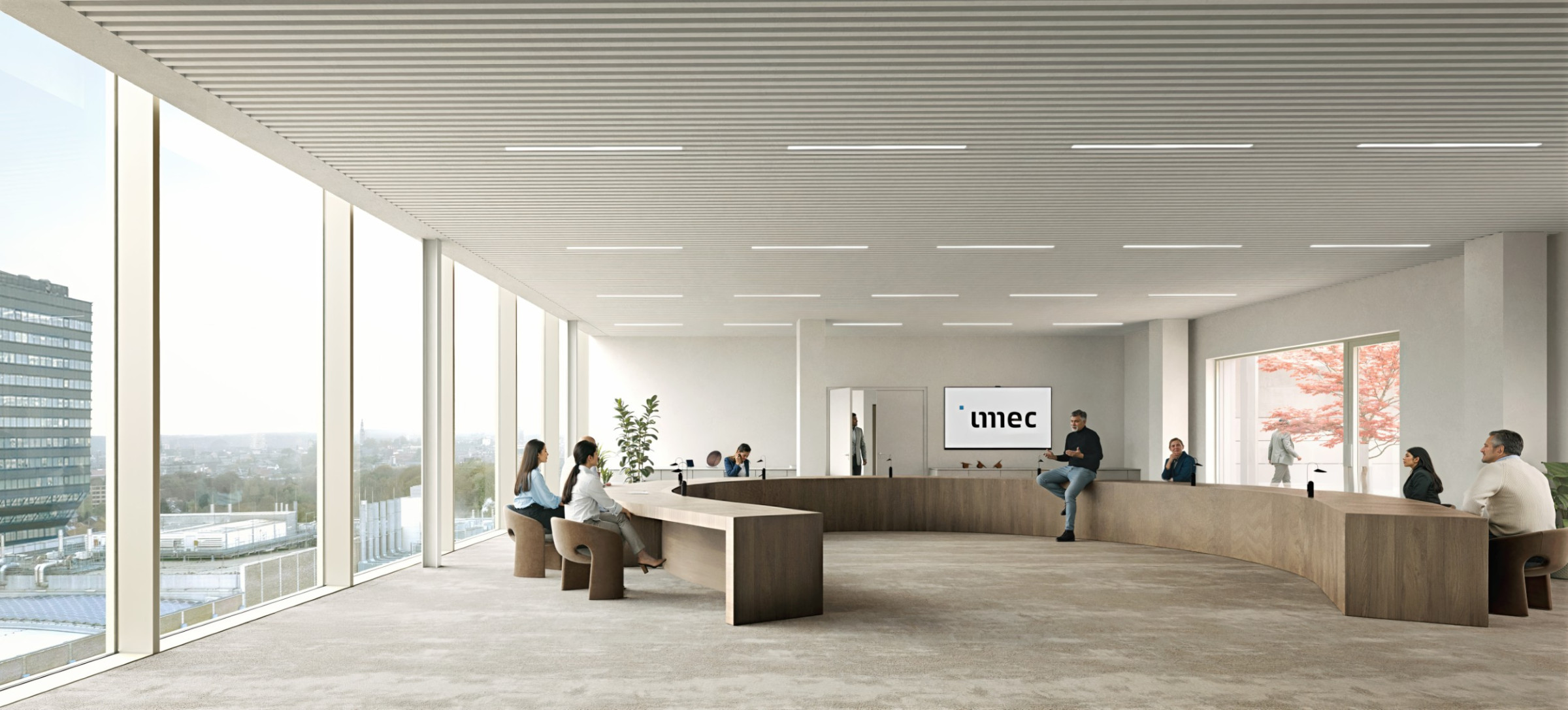 Nieuw kantoorgebouw voor imec met kantoorruimtes, vergaderzalen, labo’s en een marketplace met hybride werk- en vergaderplekken.