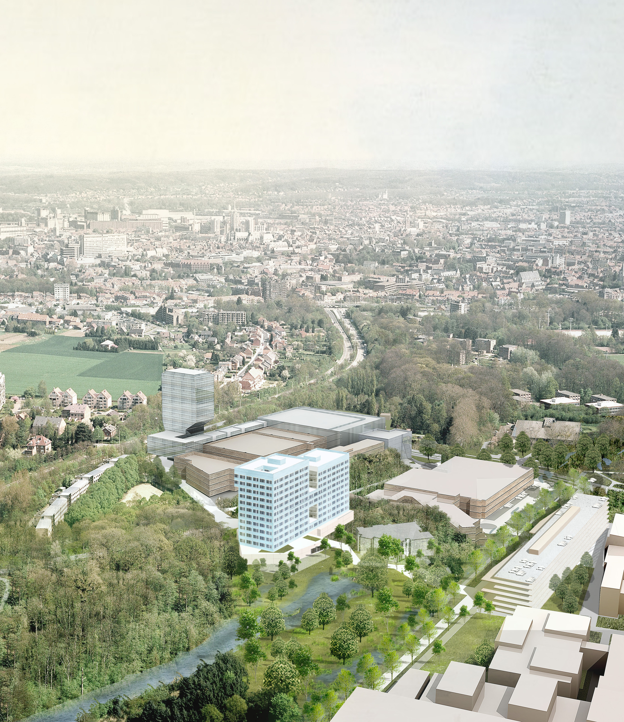 Het gebouw bestaat uit twee compacte torenvolumes op een sokkel, verbonden met de bestaande gebouwen via een nieuwe skybridge. Dankzij de strategische inplanting, deels zwevend boven de Steengroevenlaan, blijft een waardevol deel van het groene hart gevrijwaard en blijft er ruimte voor een toekomstig uitbreiding zonder de vallei te verstoren.