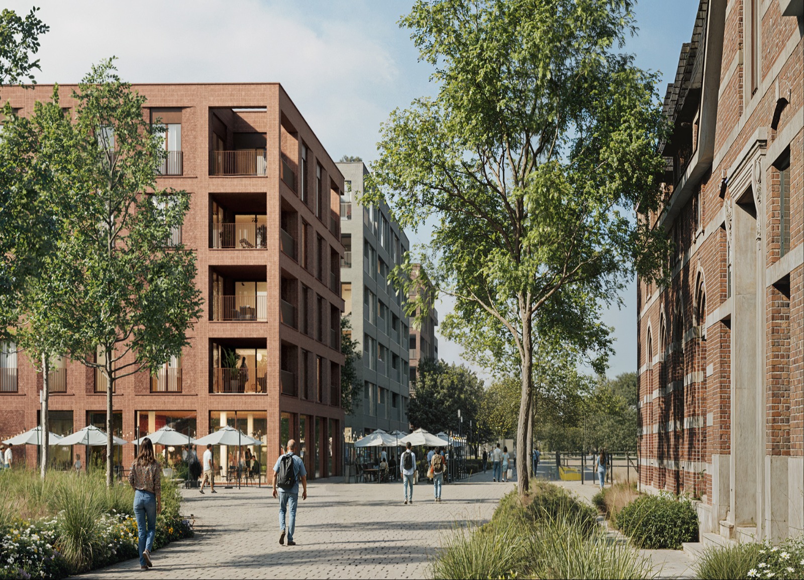 Herontwikkeling van een voormalige handelssite in een woonwijk met 240 wooneenheden, ruimtes voor handel en een ondergrondse parking.