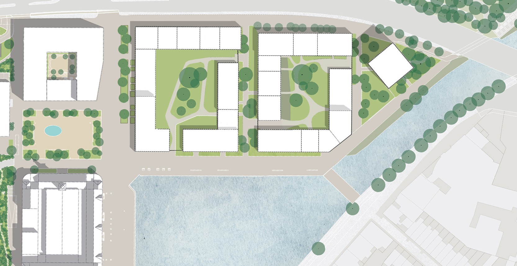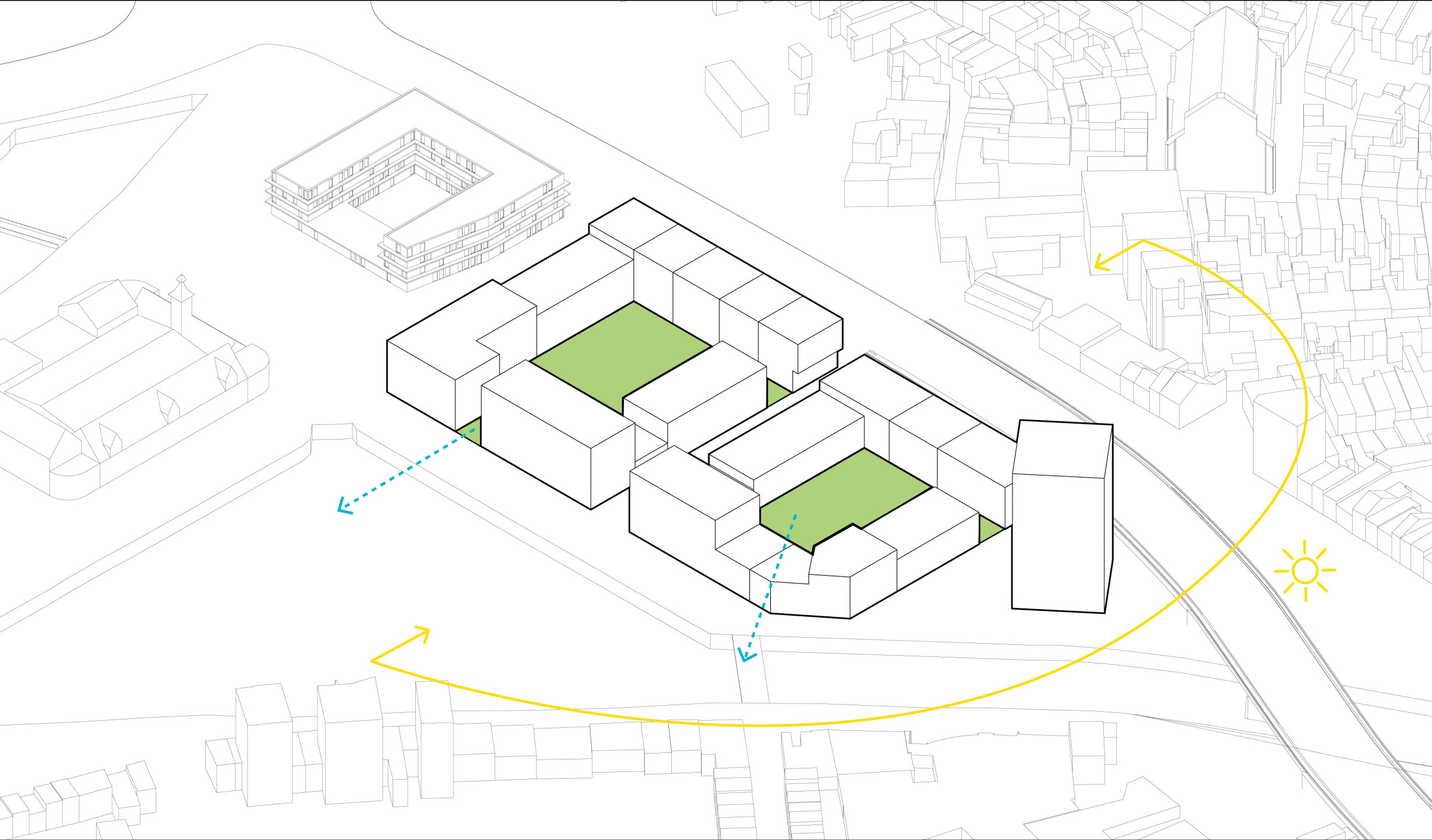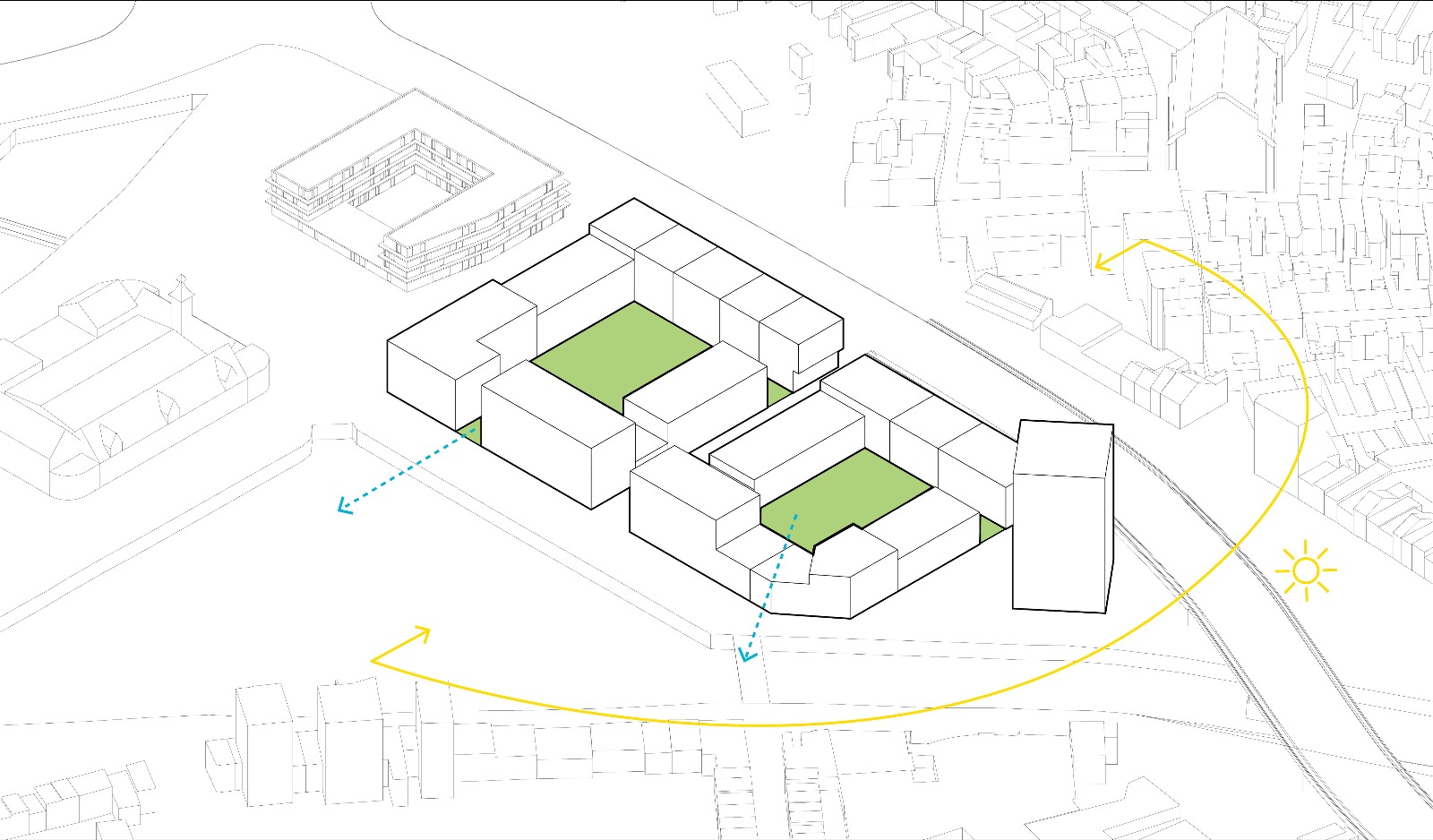Een spel van wisselende hoogtes voor de verschillende gebouwen onderstreept de pandsgewijze opbouw van de bouwblokranden. Grote openingen in de randbebouwing verzekeren bezonning van de binnentuinen en een ruimtelijk en open gevoel.