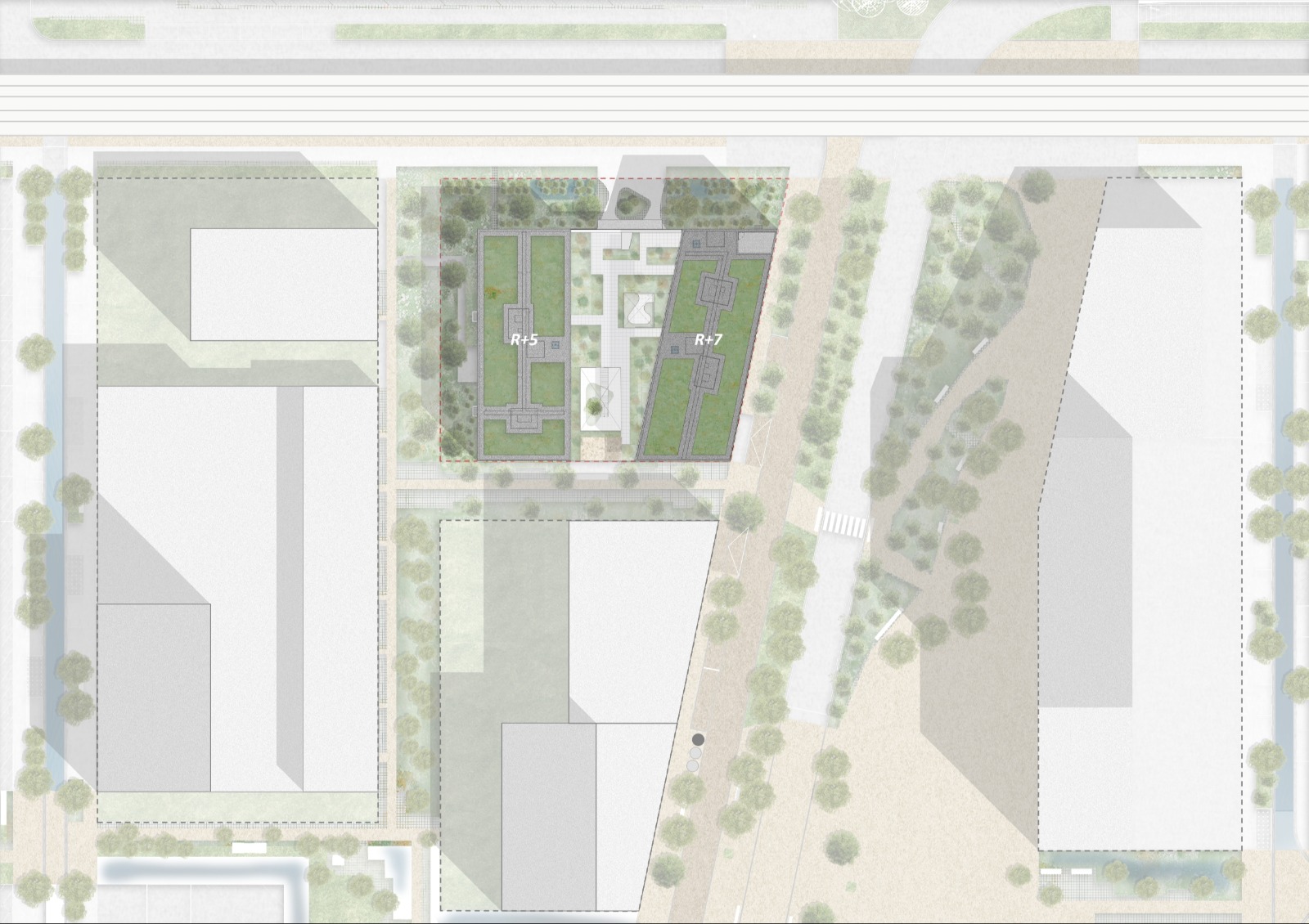 Het ontwerp vertaalt deze context in twee zorgvuldig gearticuleerde volumes: een hoger bouwdeel dat naast studentenwoningen ook het hotel huisvest en daarmee de hoek markeert in het stedelijke weefsel, en een lager bouwdeel met uitsluitend studentenwoningen dat zich naar de publieke ruimte opent. De zuidvleugel van de studentenwoningen, gedraaid voor maximale lichtinval, creëert terrassen, zicht naar het groene binnengebied en een expressieve gevel die het stedelijke karakter van het project benadrukt.