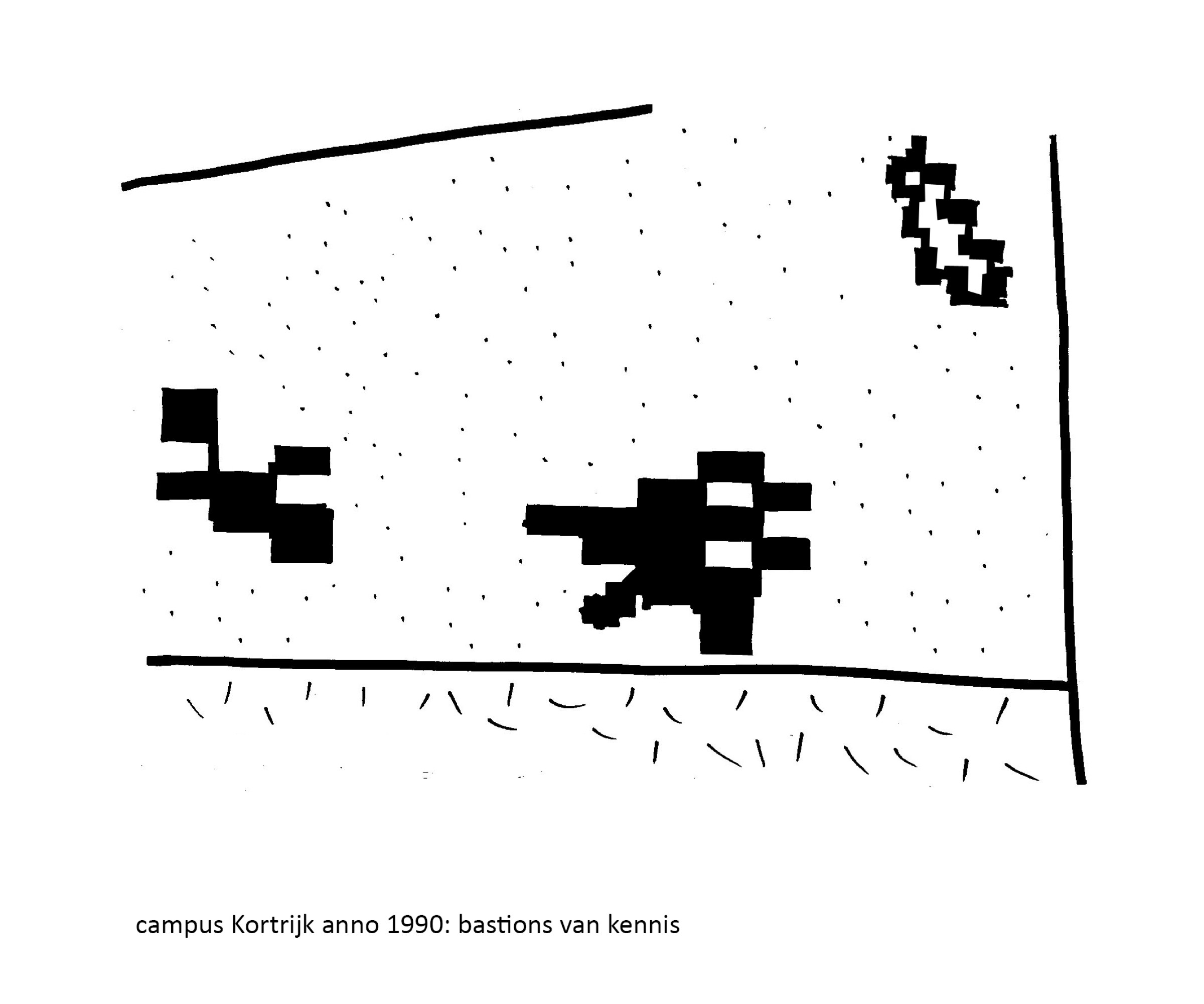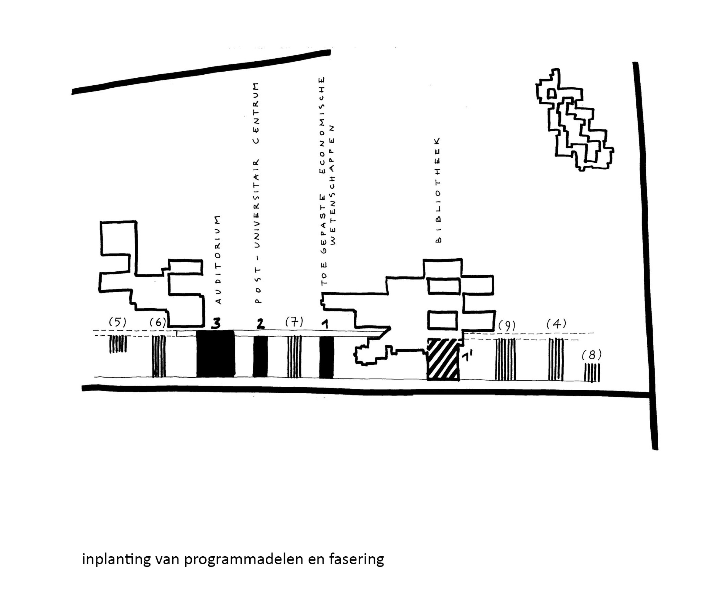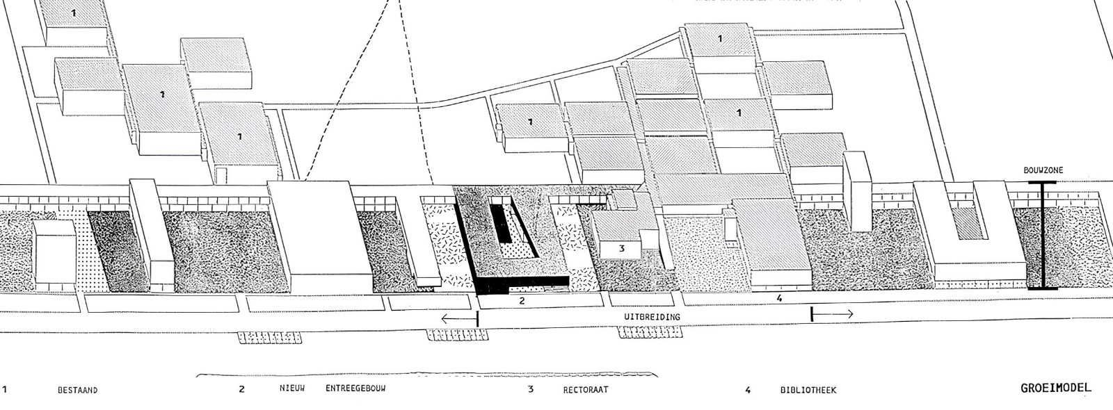 Het gebrek aan herkenbaarheid, leesbaarheid en structuur van het totale gebied werd versterkt door de toenmalige uitbreidingen die de voorziene groei sterk bemoeilijkten. De onvoltooide ‘spina’ tussen de twee gebouwen, de drager van het modulair systeem, werd kortgesloten door de bouw van het rectoraat.