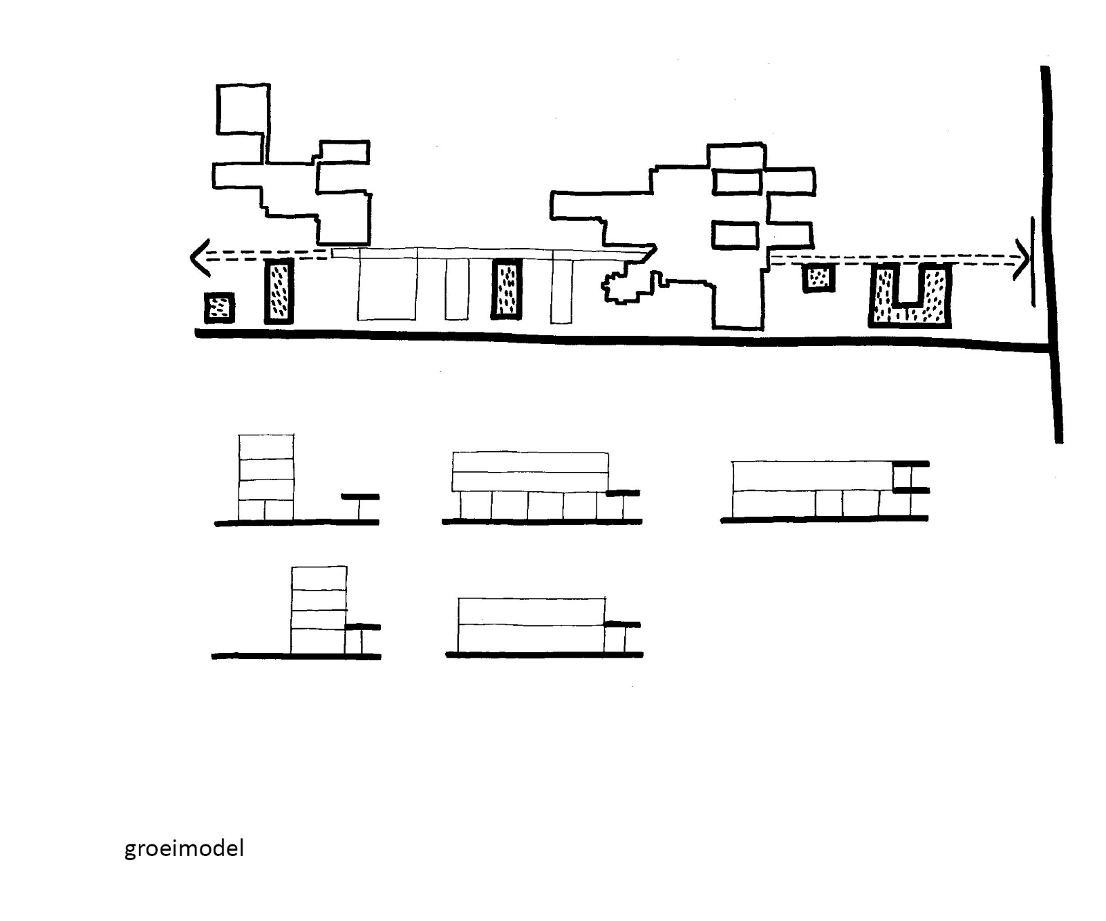 De haaks op de spine en toegangsweg geplande gebouwen worden afgewisseld met open ruimtes van verschillende functie en textuur. Deze eenvoudige actie heeft volgende consequenties: