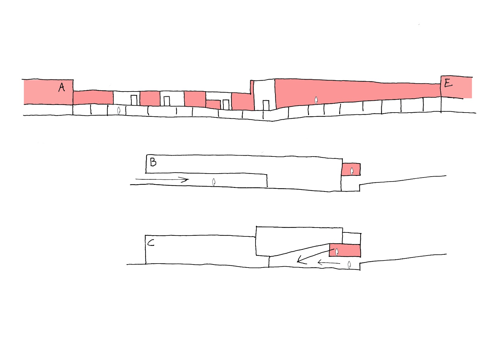 Het herintroduceren van de spina als verbindend maar ook scheidend element definieerde een vlakke, gemakkelijk te bebouwen zone tussen de spina en de weg en liet toe om de openheid van de helling te vrijwaren van verdere bebouwing.