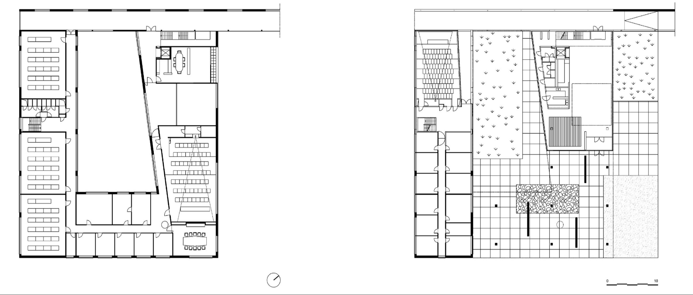 Het inkomgebouw kreeg een zekere autonomie terwijl de spina garant stond voor een beschutte verbinding op de begane grond en een gesloten verbinding op de verdieping.