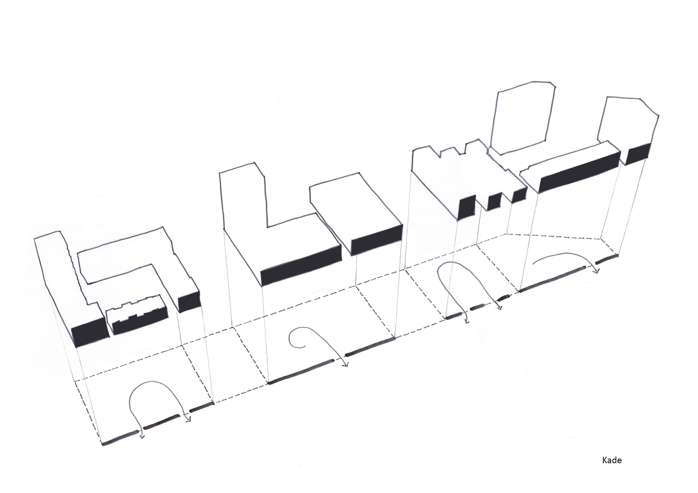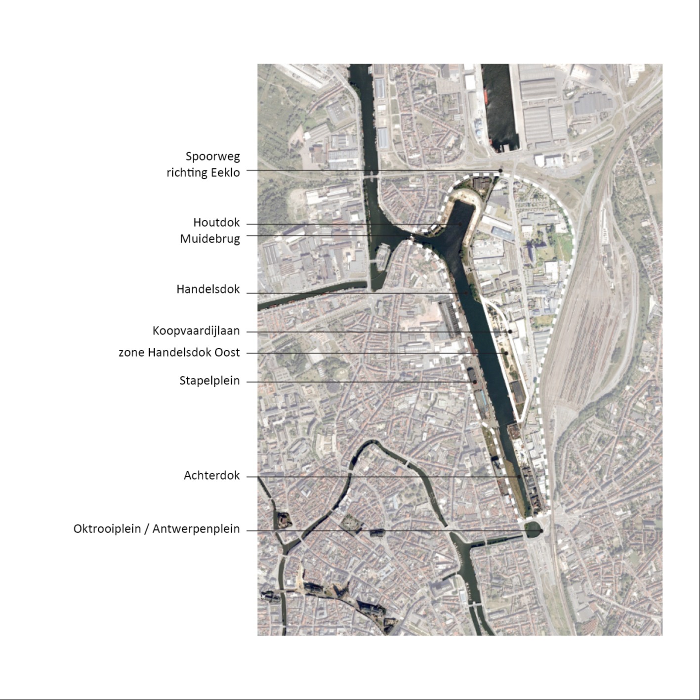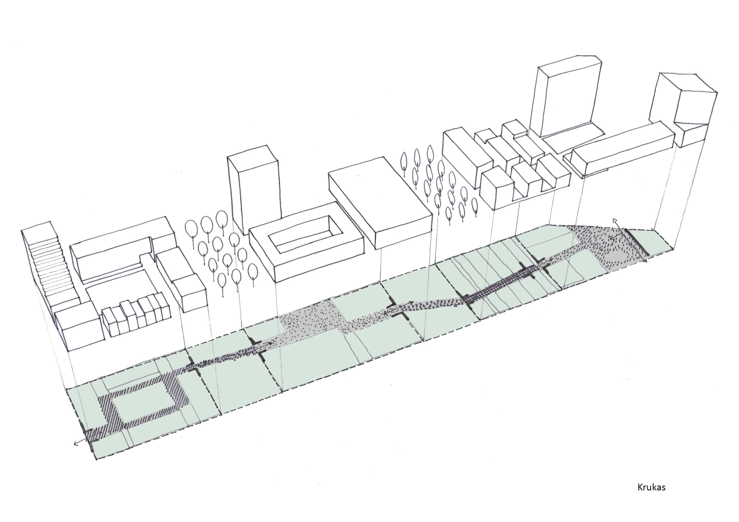 Even belangrijk als de identiteit en complementariteit van de verschillende open ruimtes, is het verbindende element ‘de krukas’. Deze route, parallel aan de Schipperskaai en Koopvaardijlaan, functioneert als een flexibele publieke ruimte die de identiteit van elke woonomgeving overneemt. Zo benadrukt ze de diversiteit en kleinschaligheid van de wijk. De krukas kent zes verschillende segmenten, elk afgestemd op de specifieke noden en sfeer van de omliggende bebouwing.