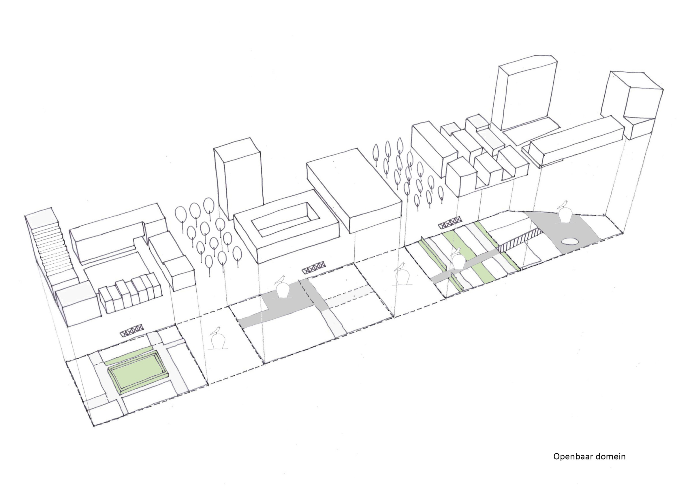 Een van de fundamenten van het ontwerp is de nadruk op kwalitatieve publieke ruimte. Groene dooradering en zachte overgangen tussen privé, collectieve en publieke ruimtes staan centraal. De woonparken, op maat van de bebouwing, zijn vooral bedoeld voor de bewoners en bieden een intiem, groen karakter met een minimum aan verharding. Ze laten ruimte voor eigen invulling door de gebruikers en zorgen voor een natuurlijke overgang tussen de woonclusters en de openbare ruimte.