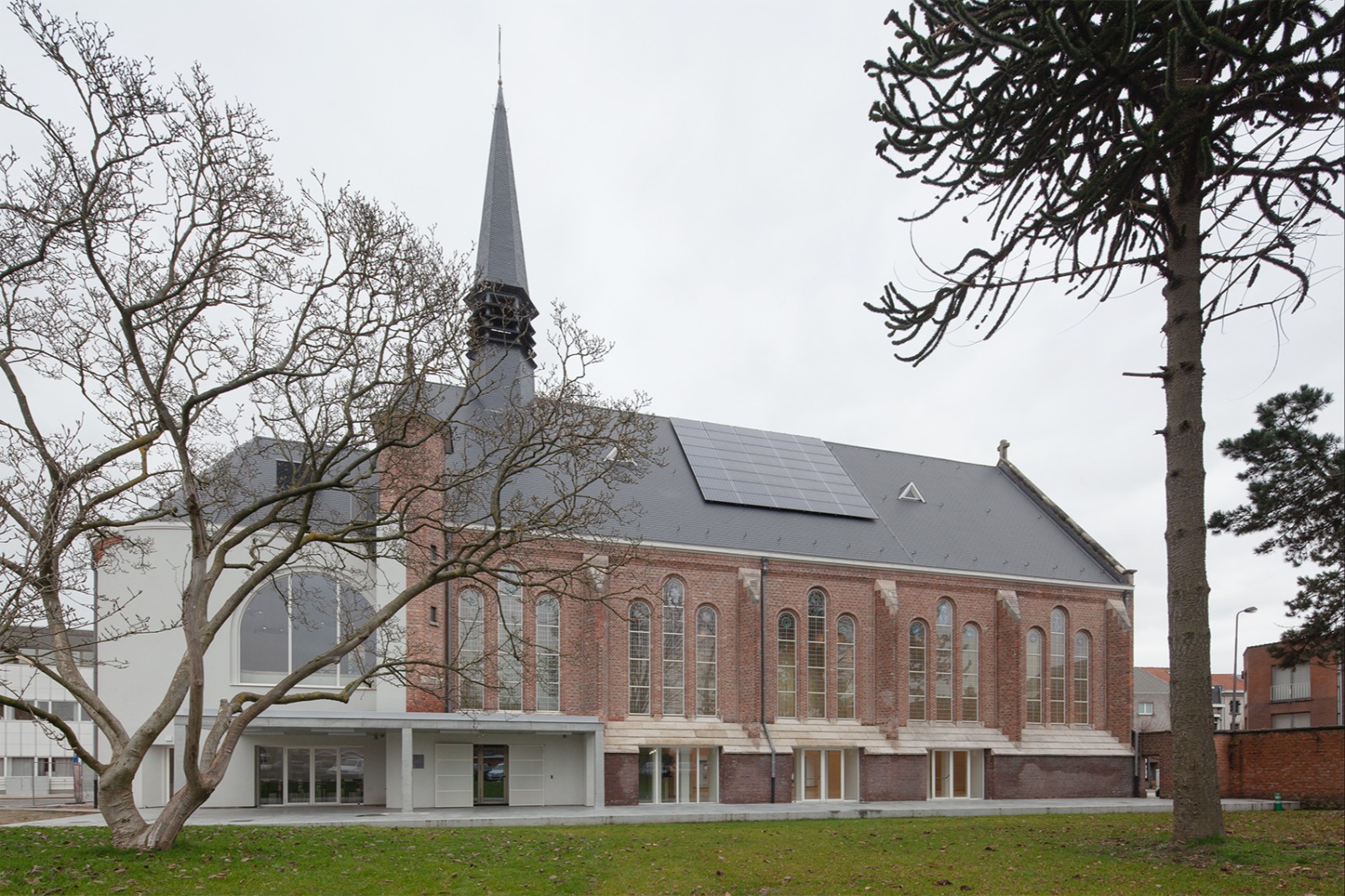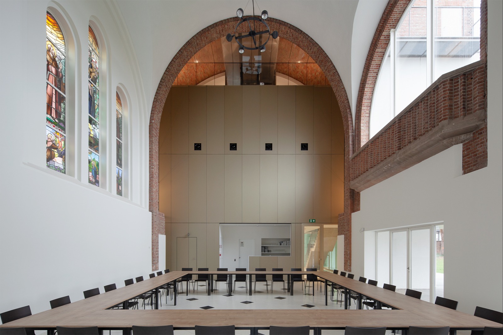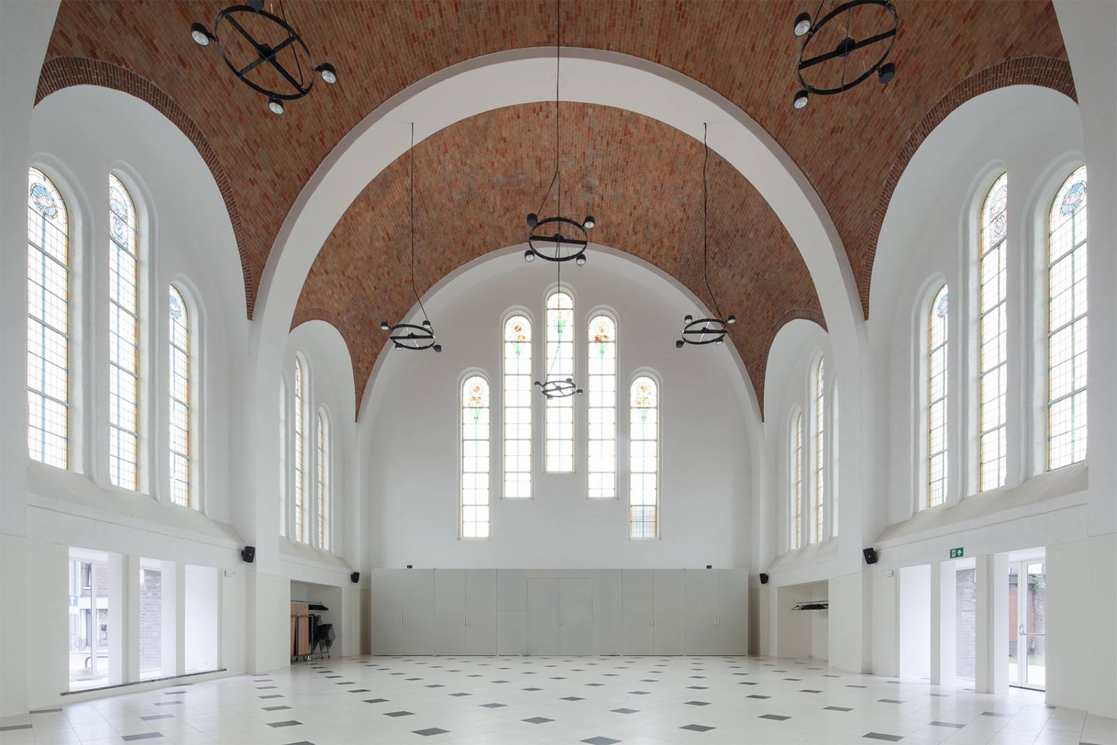 Het ontwerp voegt een nieuwe ‘box’ toe in de kerk. De box wordt in het bestaande volume van de kerk geschoven als scheiding tussen het koor en het schip. Op die manier worden in de ruimte van de kerk drie zalen gecreëerd: de grote polyvalente zaal in het schip van de kerk, de kleinere zaal in het koor van de kerk en de vergaderzaal in de nieuwe box. Hierin bevinden zich ook alle ondersteunende functies en technische ruimtes.