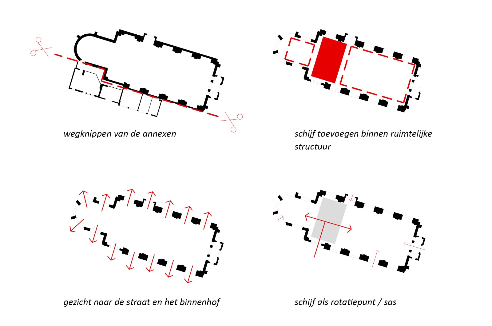 Door de nieuwe gebouwen de site op een afstand van elkaar te plaatsen, wordt de kerk nog meer als zelfstandig oriëntatiepunt benadrukt. Via doorzichten op strategische plaatsen wordt de voorbijganger uitgenodigd om de kloostertuin te ontdekken.