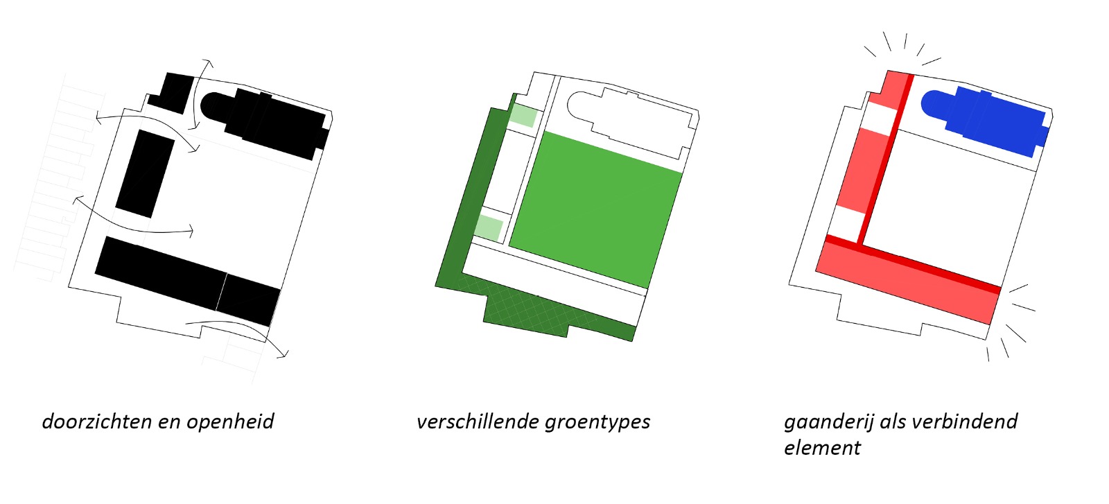 De nieuwbouw werd zo ontworpen dat er geen ‘achtergevel’ gebouwd wordt, maar dat de achterliggende zone een volwaardig statuut krijgt. Hierdoor strekt de site zich uit tot aan de tweede tuinmuur en wordt de gelaagdheid van de site opnieuw zichtbaar gemaakt.