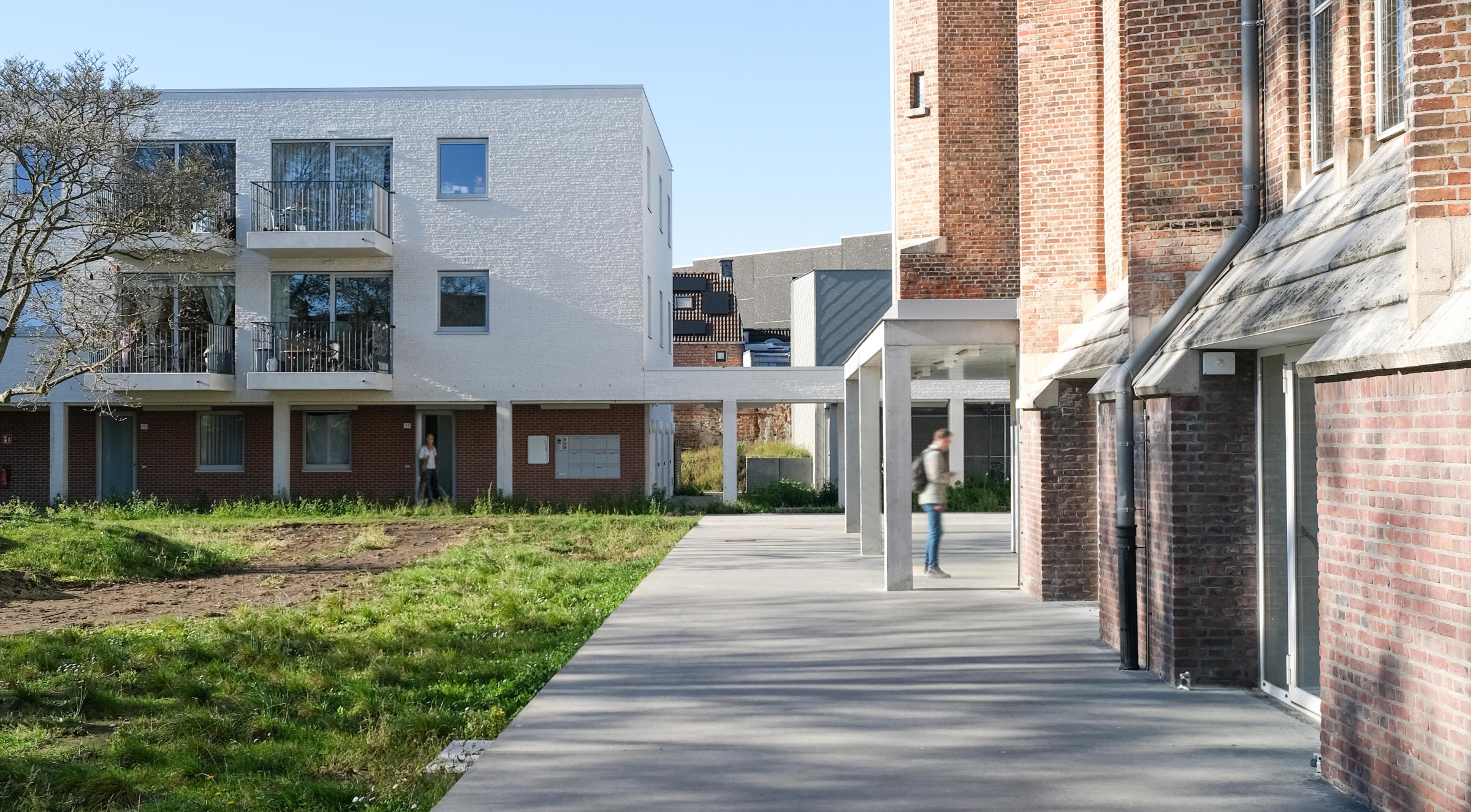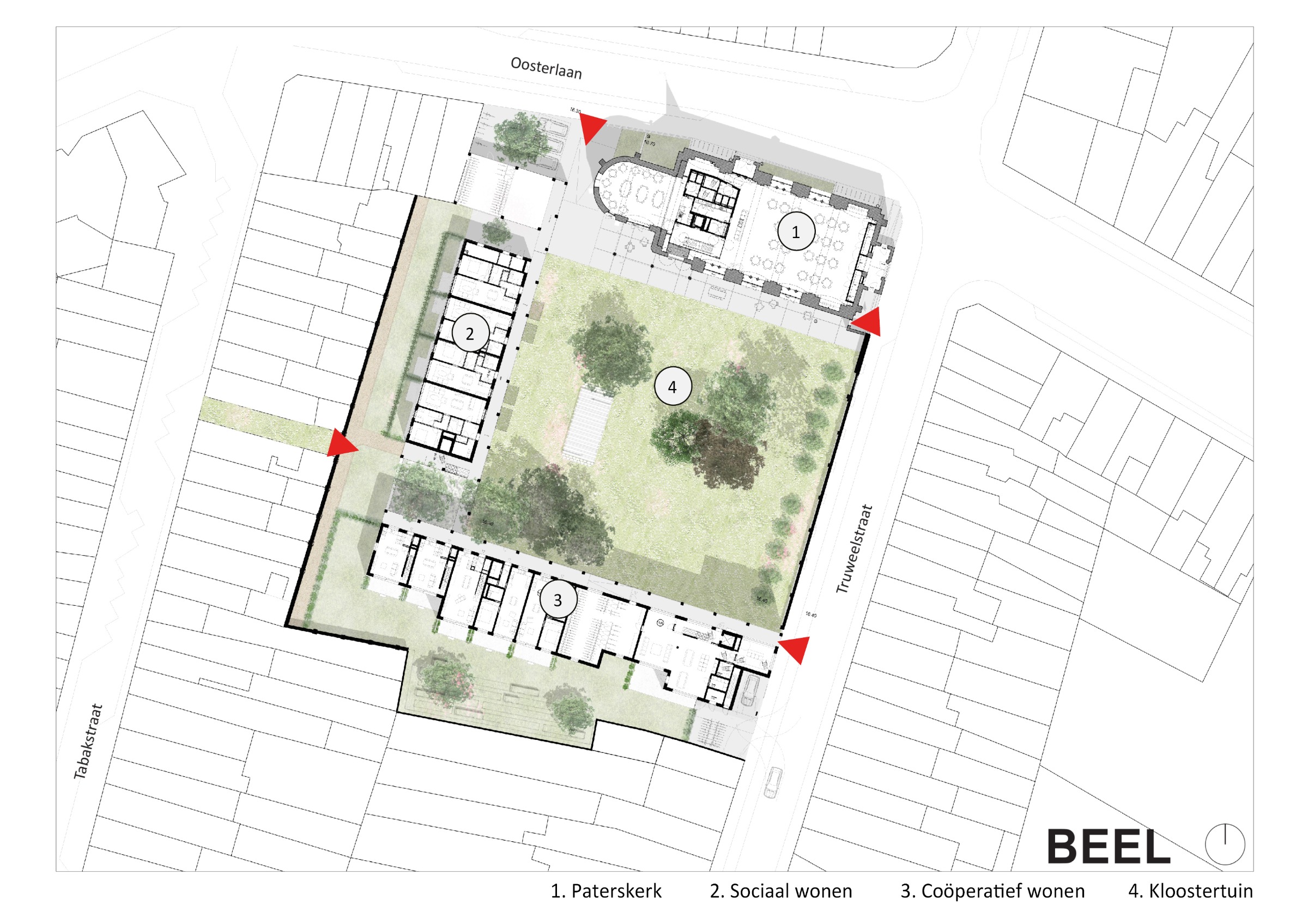 Het woonproject werd opgesplitst in sociaal- en coöperatief wonen. Om de Paterskerk en de twee nieuwe woonvleugels te laten samenwerken als één geheel op de site, wordt een verhoogde sokkel met overdekte rondgang rondom de kloostertuin gemaakt. Deze sokkel verbindt de verschillende gebouwen en accentueert de kloostertuin in het midden.