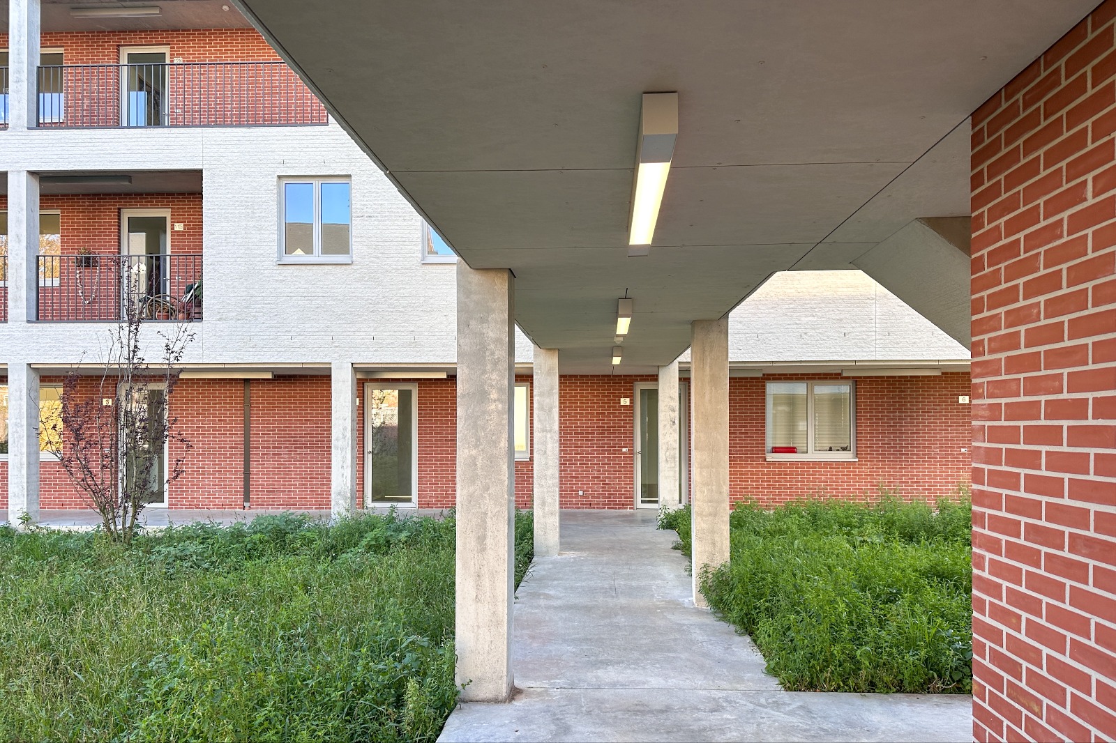 Er werd een buffer gemaakt tussen de gemeenschappelijke buitengang en de privé-woning. Op deze manier heeft elke woning voldoende privacy – essentieel voor voldoende levenskwaliteit – maar ook voldoende openheid naar het groen van het binnenhof. De woning richt zich op het gelijkvloers naar de semi-private tuin en kloostermuur en de verdiepingen worden gespiegeld naar het binnenhof. Ramen van slaapkamers en woonruimtes grenzen nooit aan de gemeenschappelijke cirulatie.