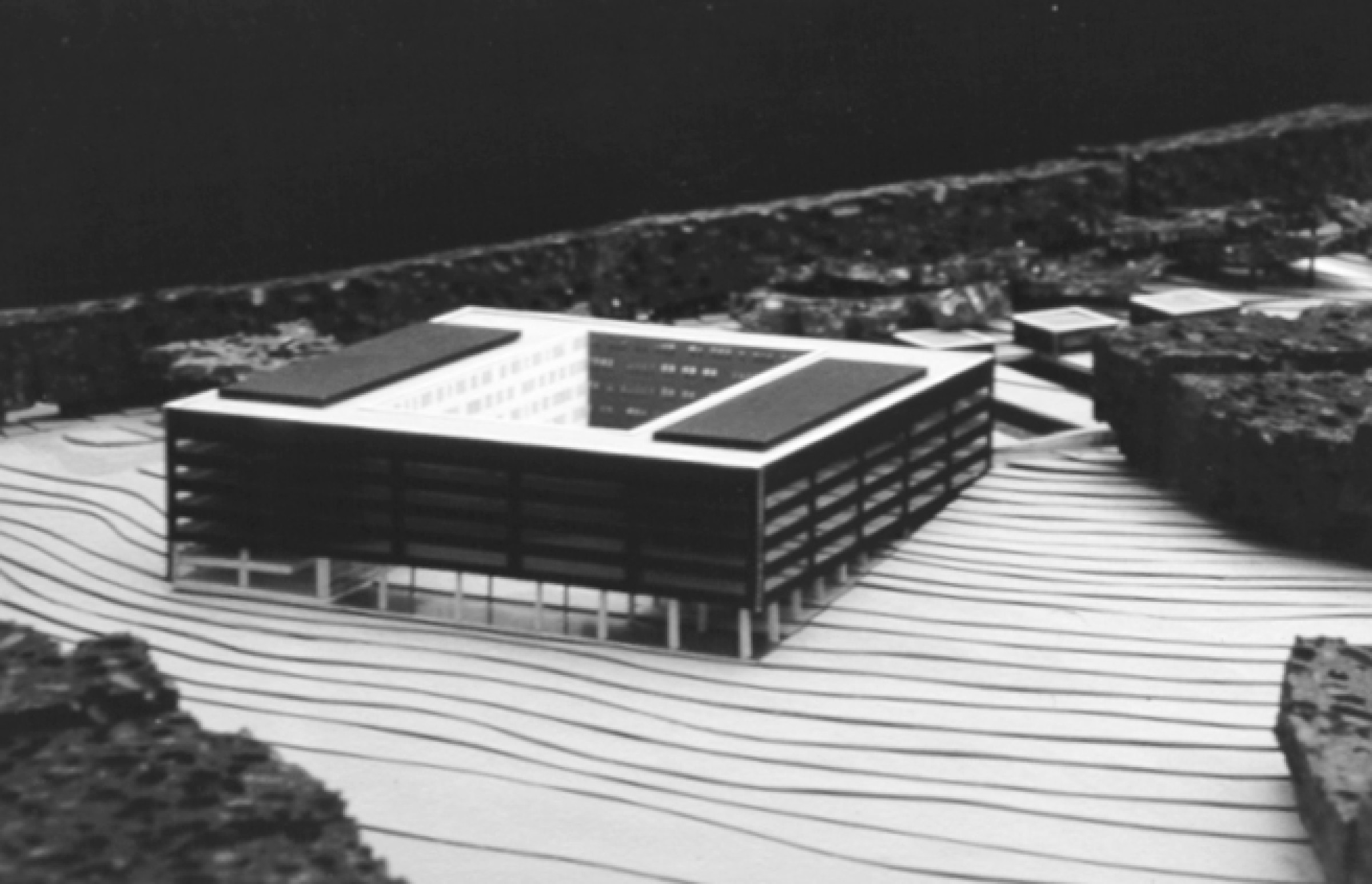 De klassieke kwaliteit van het monumentale kantoor-paleis van Bofill, het hoofdkwartier van S.W.I.F.T., krijgt zijn echo en tegenbeeld in de organisatie van een kloostergang en tuin, de ‘cour-carré’. Deze compacte en sobere ordening maakt de aanwezigheid van dit groot kantoorgebouw aanvaardbaar op de site, een golvend parklandschap.