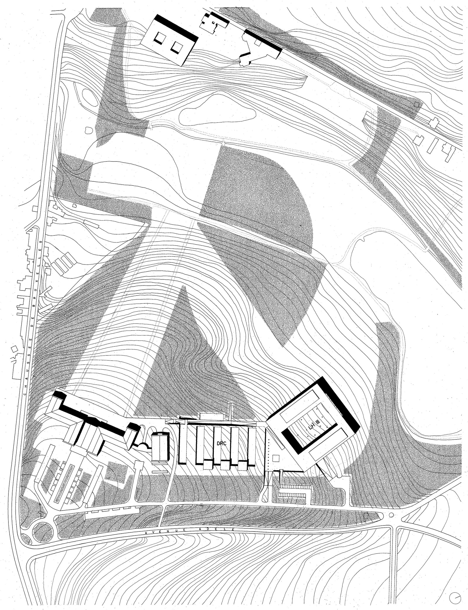 Vier identieke kantoorvloeren die zijn opgetild boven het hellende terrein en de publieke ruimten laten het landschap in de binnentuin vloeien. Het ‘Disaster Recovery Center’ trekt zich strategisch in de helling terug en laat de hoofdgebouwen hun rol spelen.