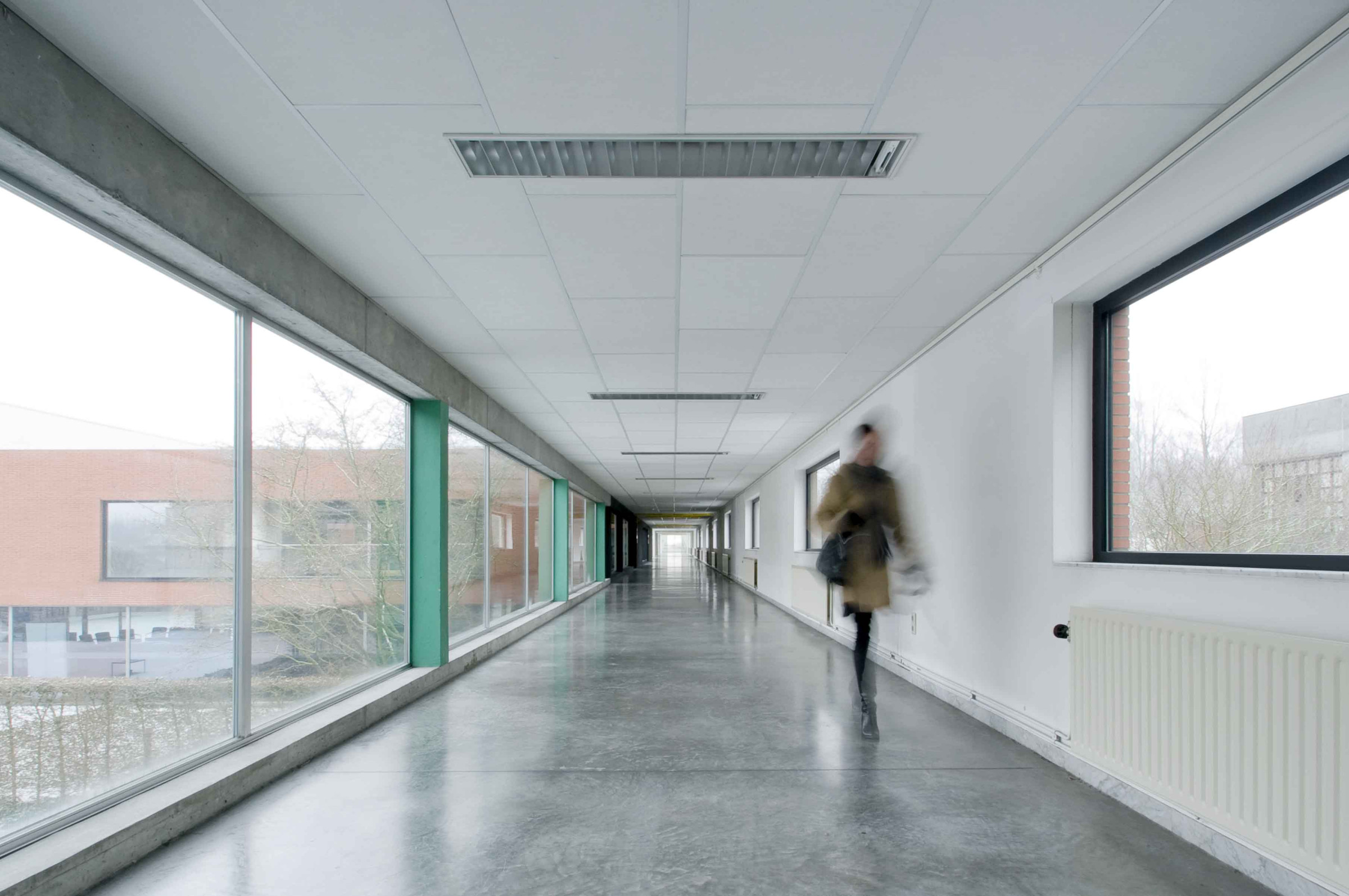 De onderzoeksvleugel voorziet in vijftig werkplekken, de onderwijsvleugel bestaat uit zes leslokalen en een auditorium dat grenst aan de spina. Leslokalen en docentenwerkplekken worden op dezelfde bouwlagen samengebracht. De onderlinge nabijheid wordt versterkt door de circulatie van de leslokalen te voorzien aan de patio. Deze opent zich naar de spina en geeft de gebruiker en passant een duidelijke oriëntatie. De bovenste bouwlaag leent zich tot een onderzoekscentrum of een andere spin-off activiteit die autonoom in het gebouw kan functioneren. Door de nieuwe leslokalen open te laten voor variabel gebruik van verschillende vakgroepen wordt de verbindingsas extra opgeladen als ontmoetingsruimte.