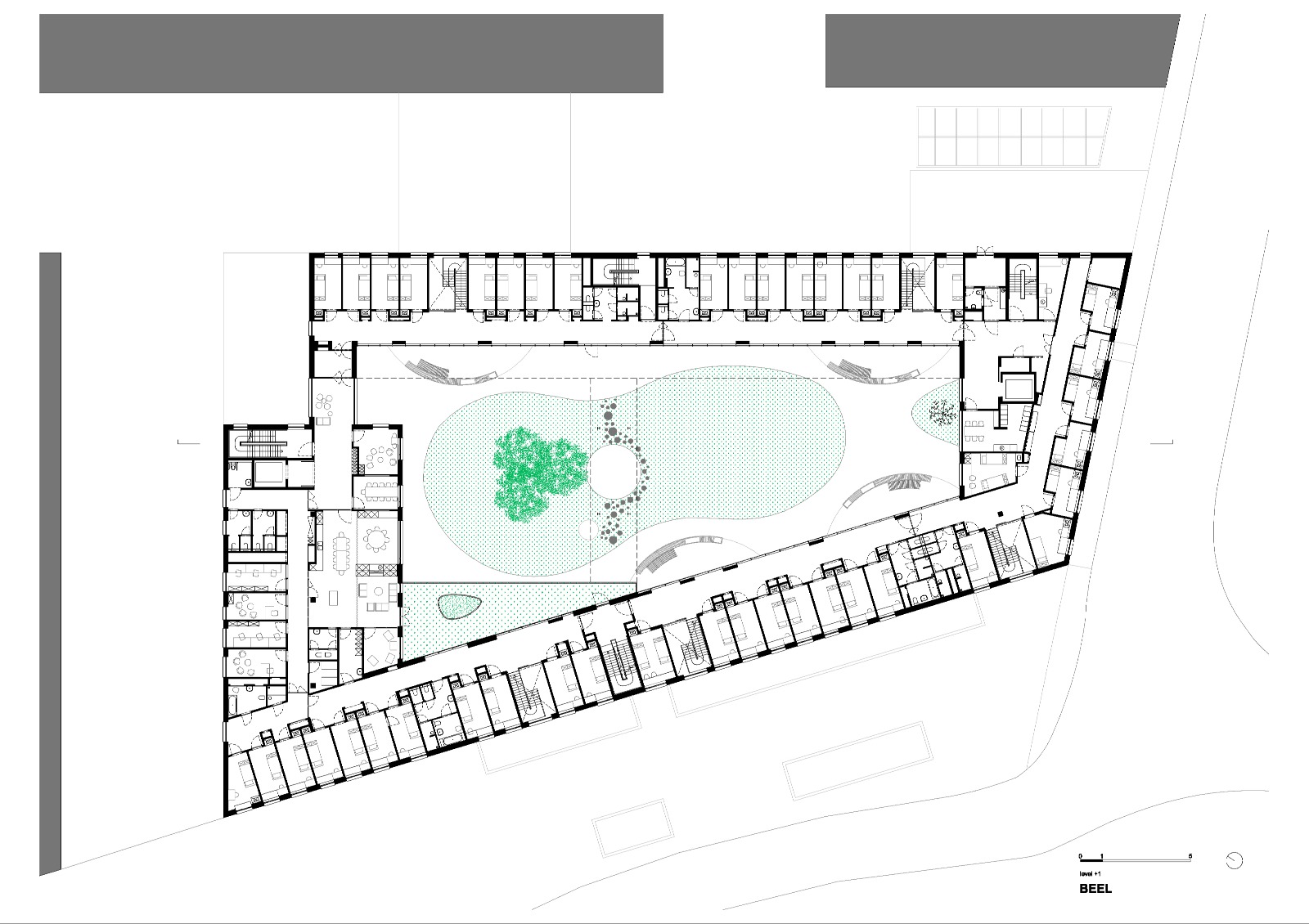 Niveau +1 (gelijkvloers) is het ontvangstniveau met onthaal, daghospitalisatiezones en leefgroepen.