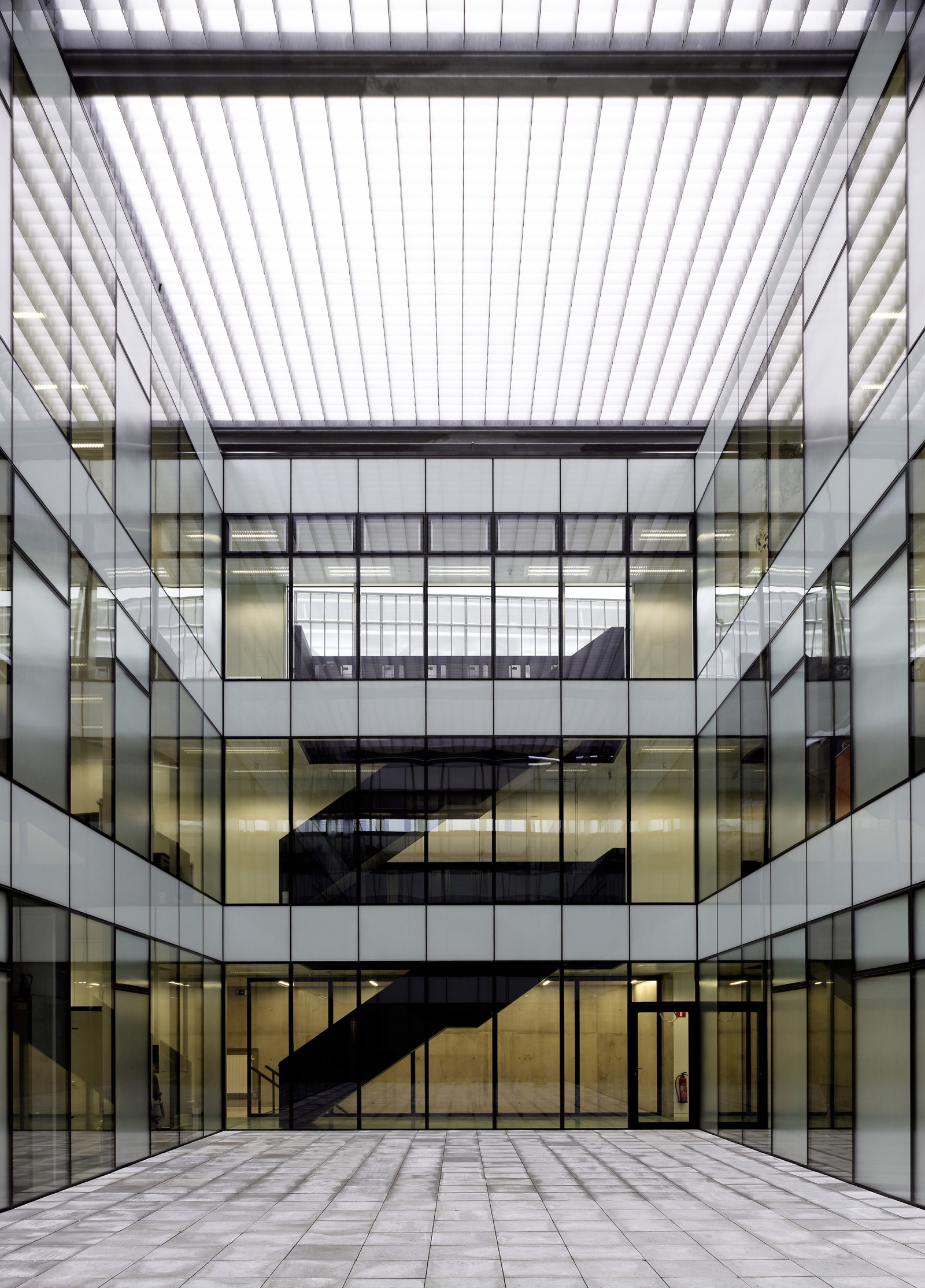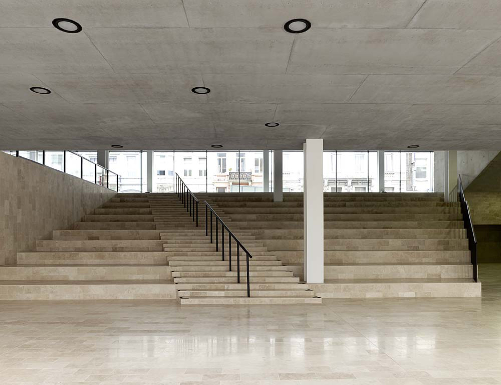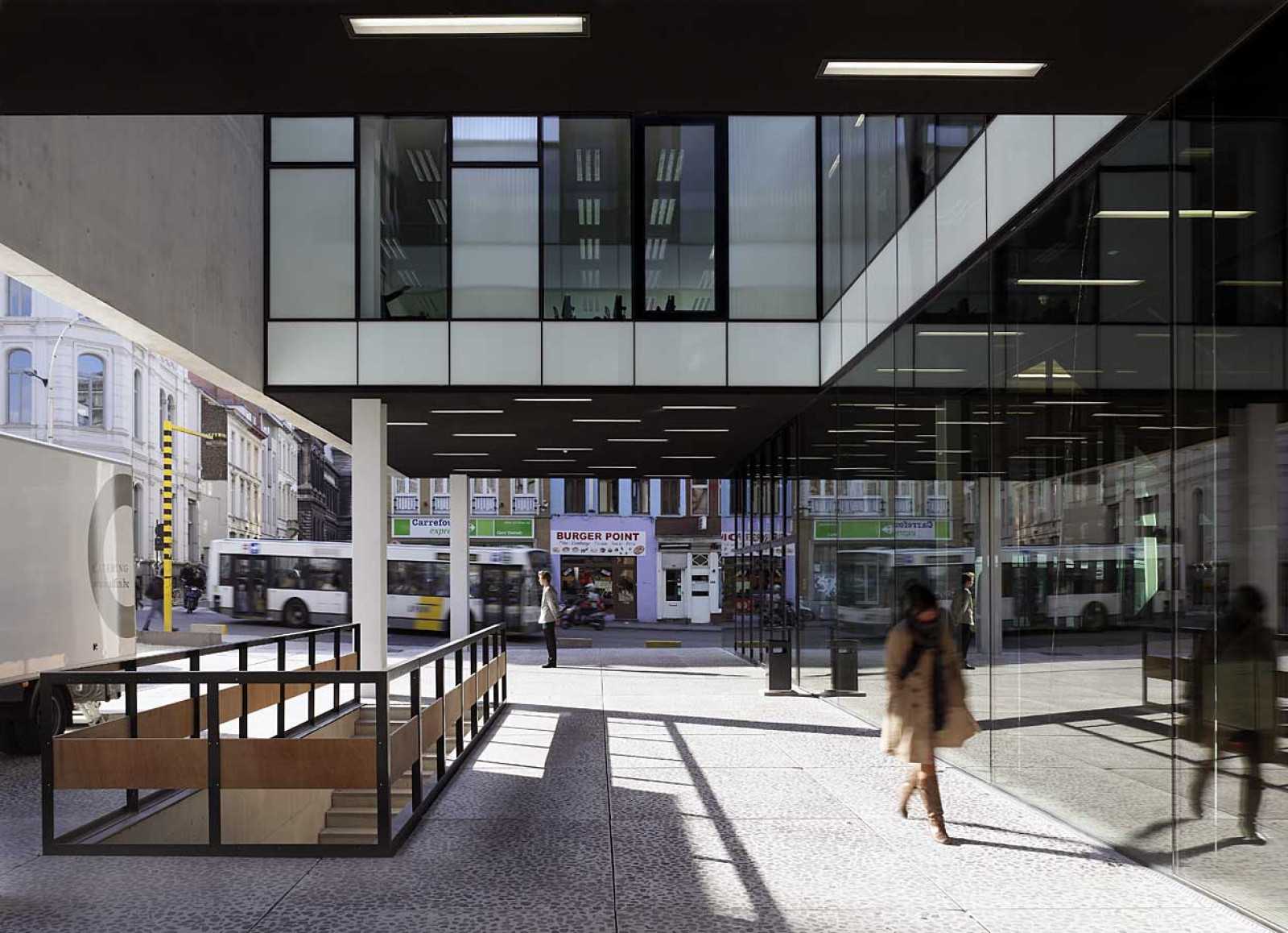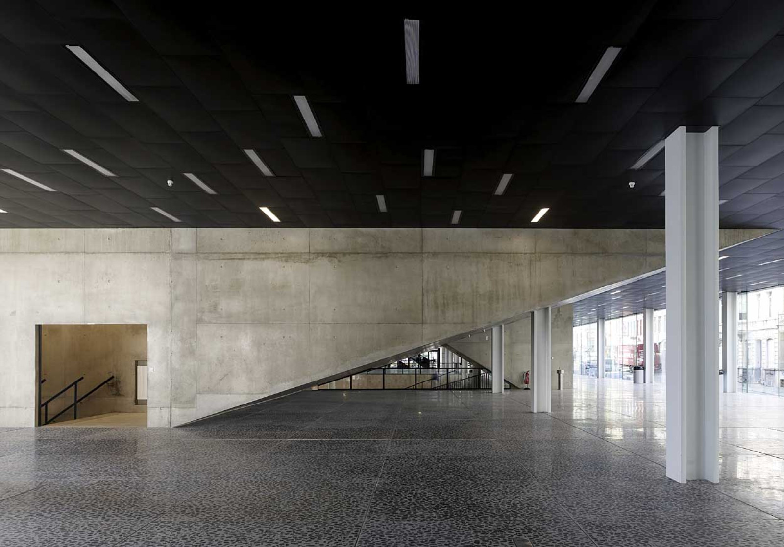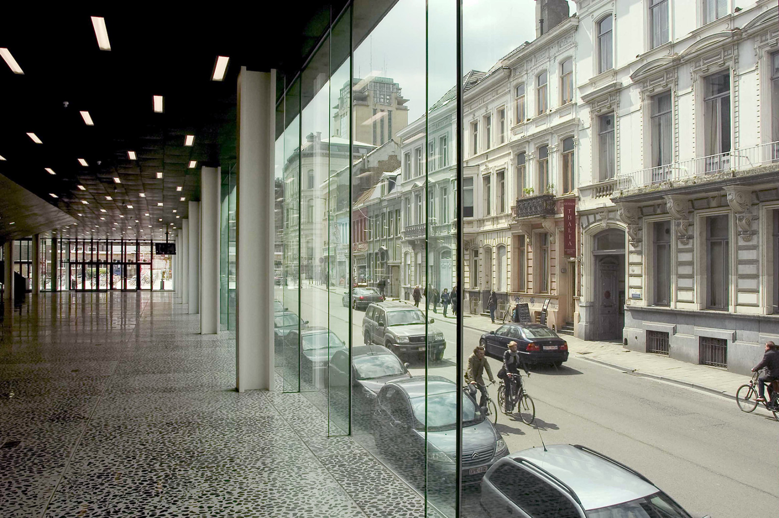 Al deze functies bevinden zich boven of onder de foyer die als een open publieke ruimte het gebouw horizontaal in twee splijt. Een deel van de foyer daalt af tot in de plint en vormt zo het gebouwde verlengde van het naar de Schelde toe afdalende landschap. Boven de foyer bevindt zich het grote auditorium dat aan beide uiteinden geflankeerd wordt door kantoren die telkens rondom een patio georganiseerd worden.