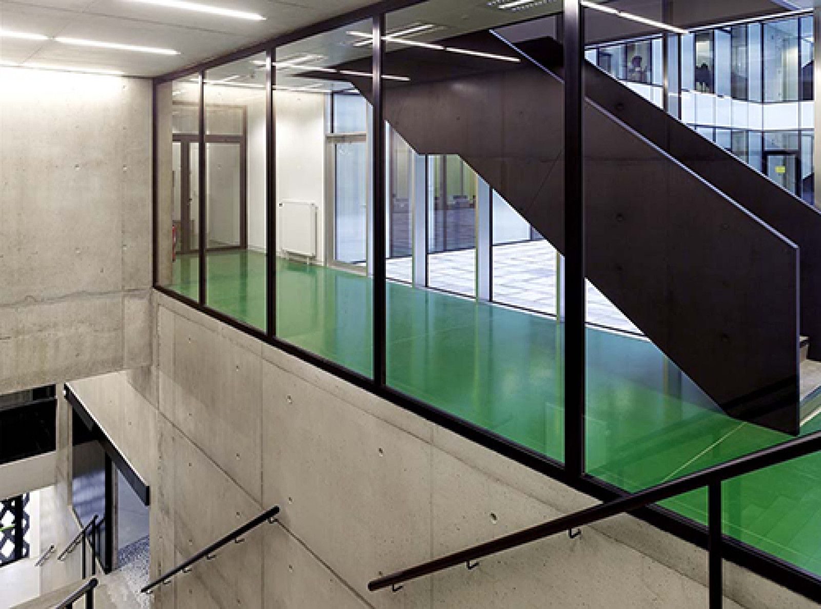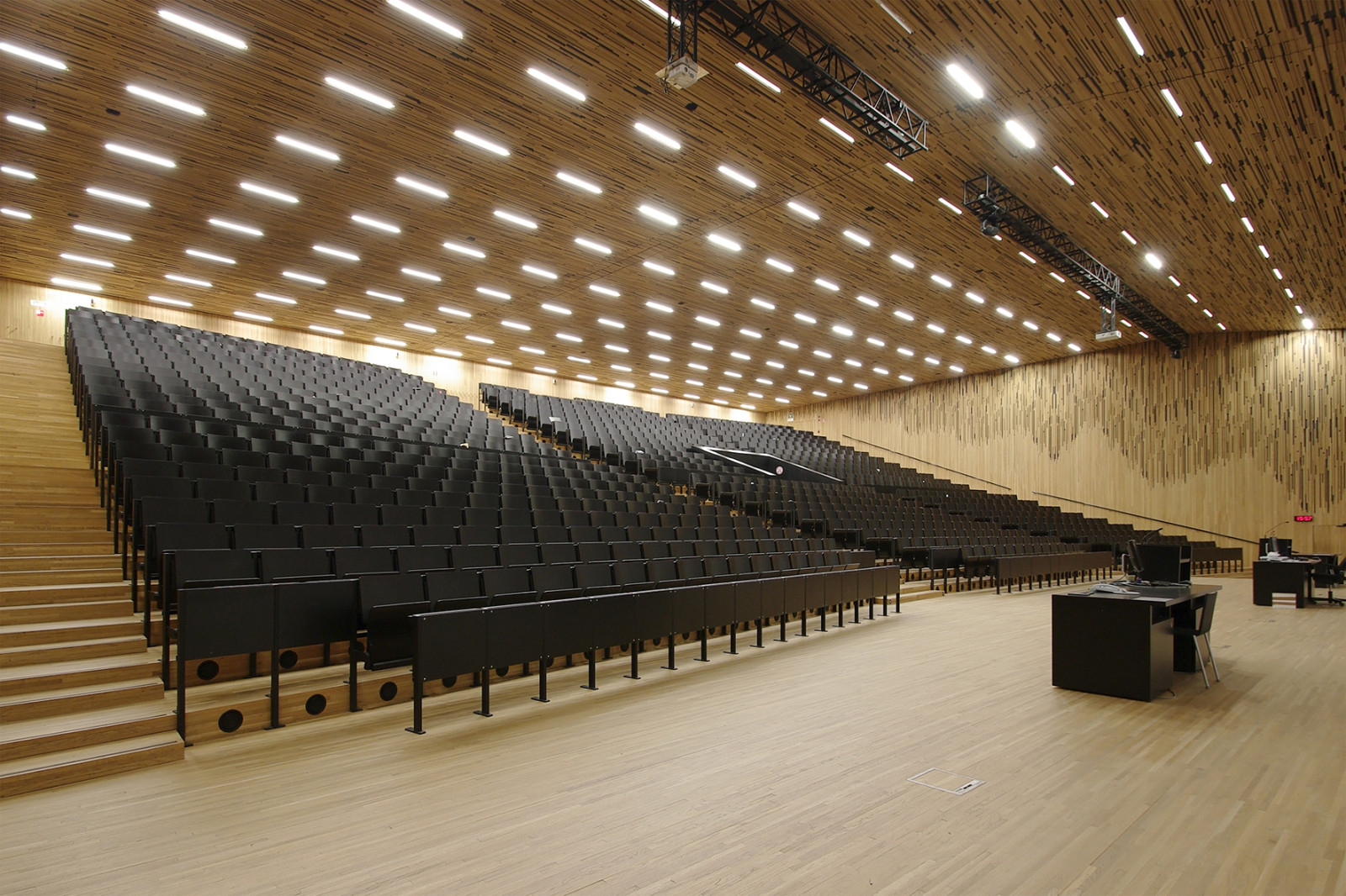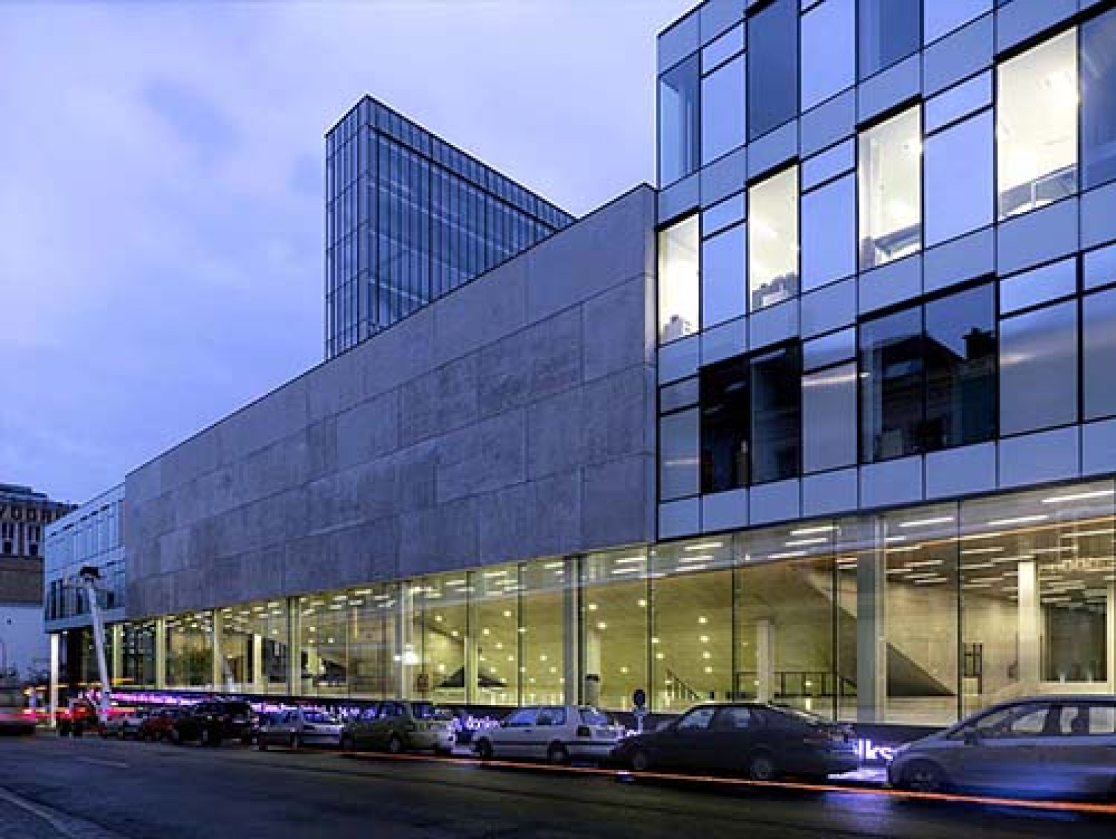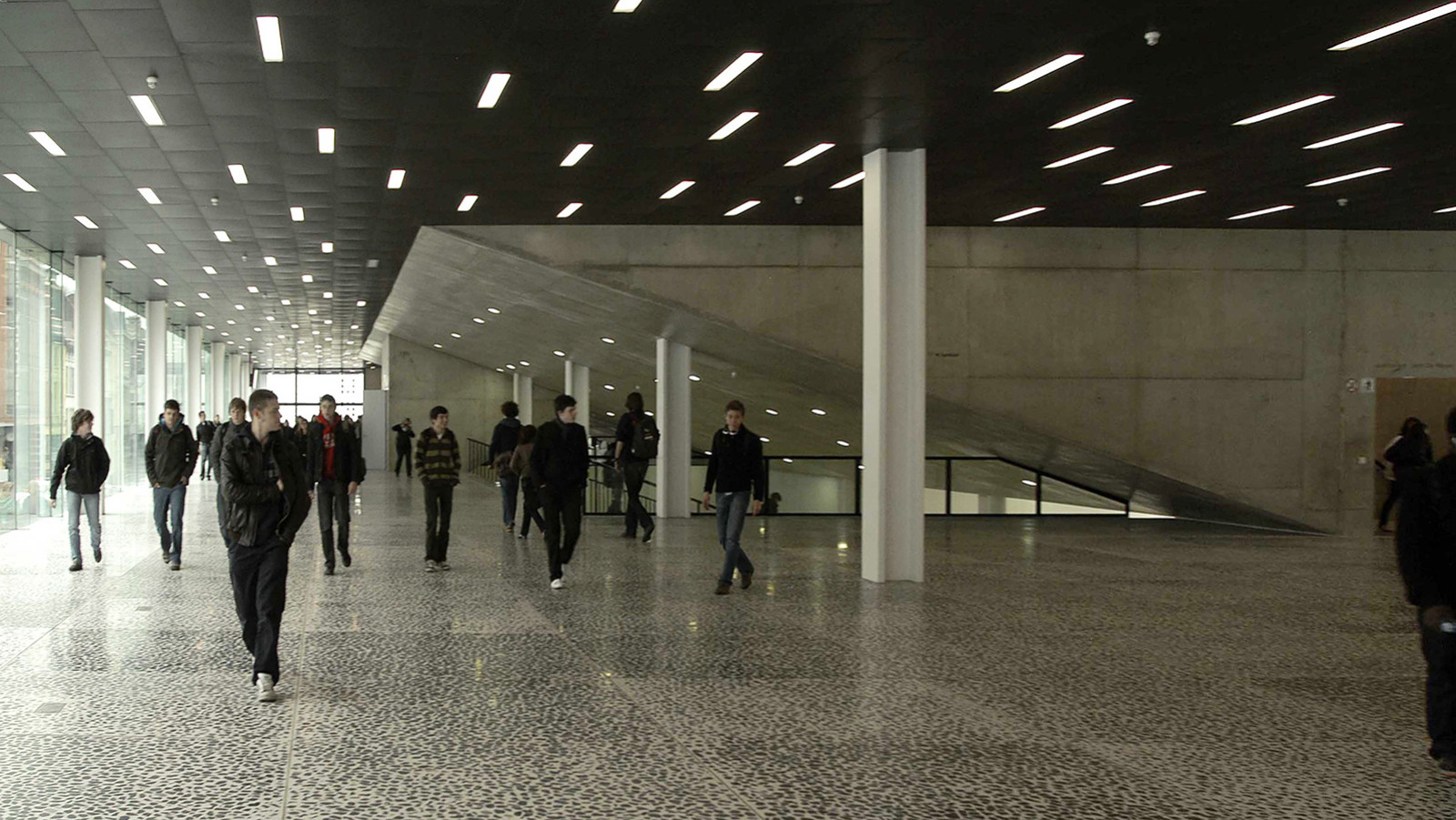 De vrij statische compositie van de gevel wordt gebroken door een 70m lange mediapaneel op het niveau van de straat en door de verticaal bewegende scheidingswand voor het auditorium die boven het gebouw te voorschijn komt. Met de grote groepen studenten die massaal de foyer in- en uitstromen toont de universiteit zich aan de stad en animeert het gebouw de stedelijke ruimte.