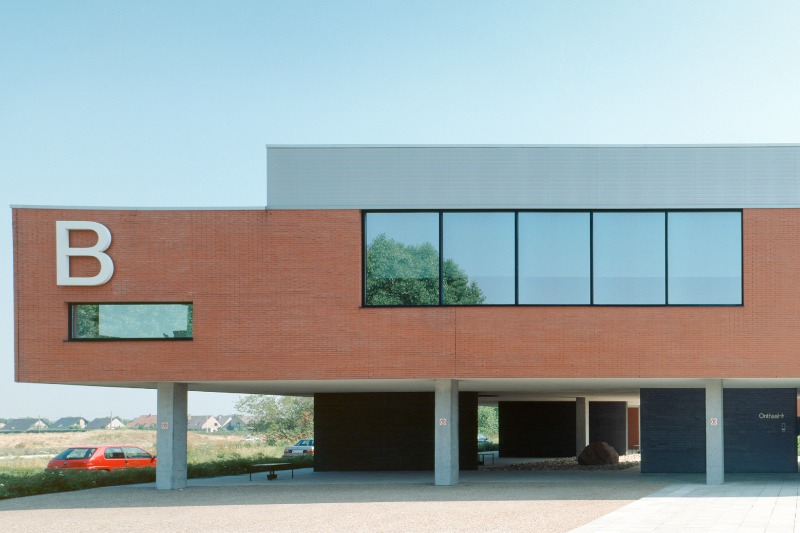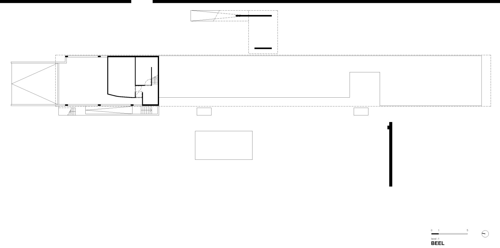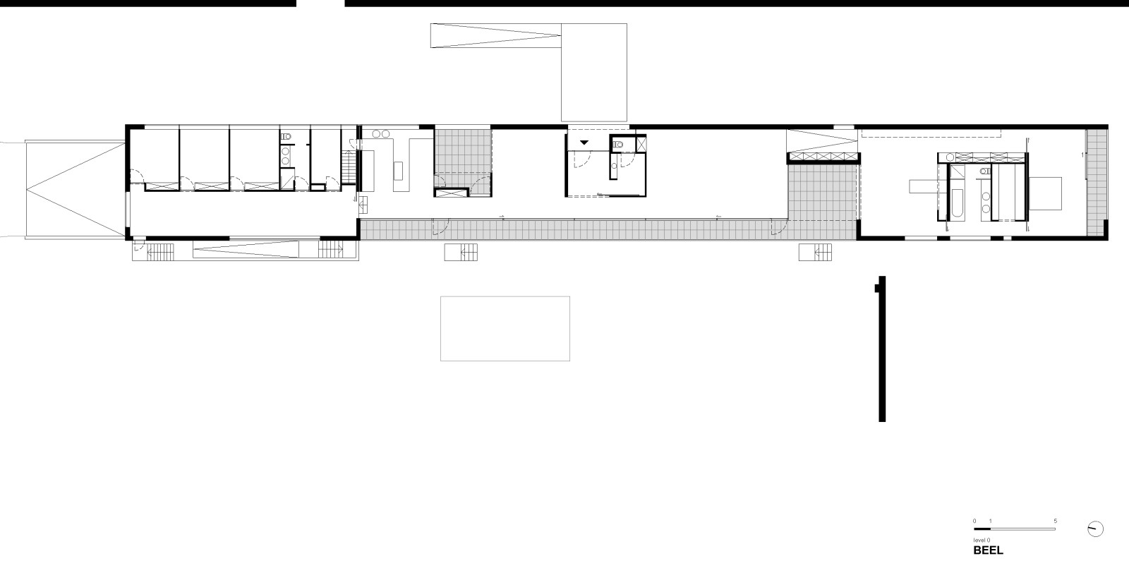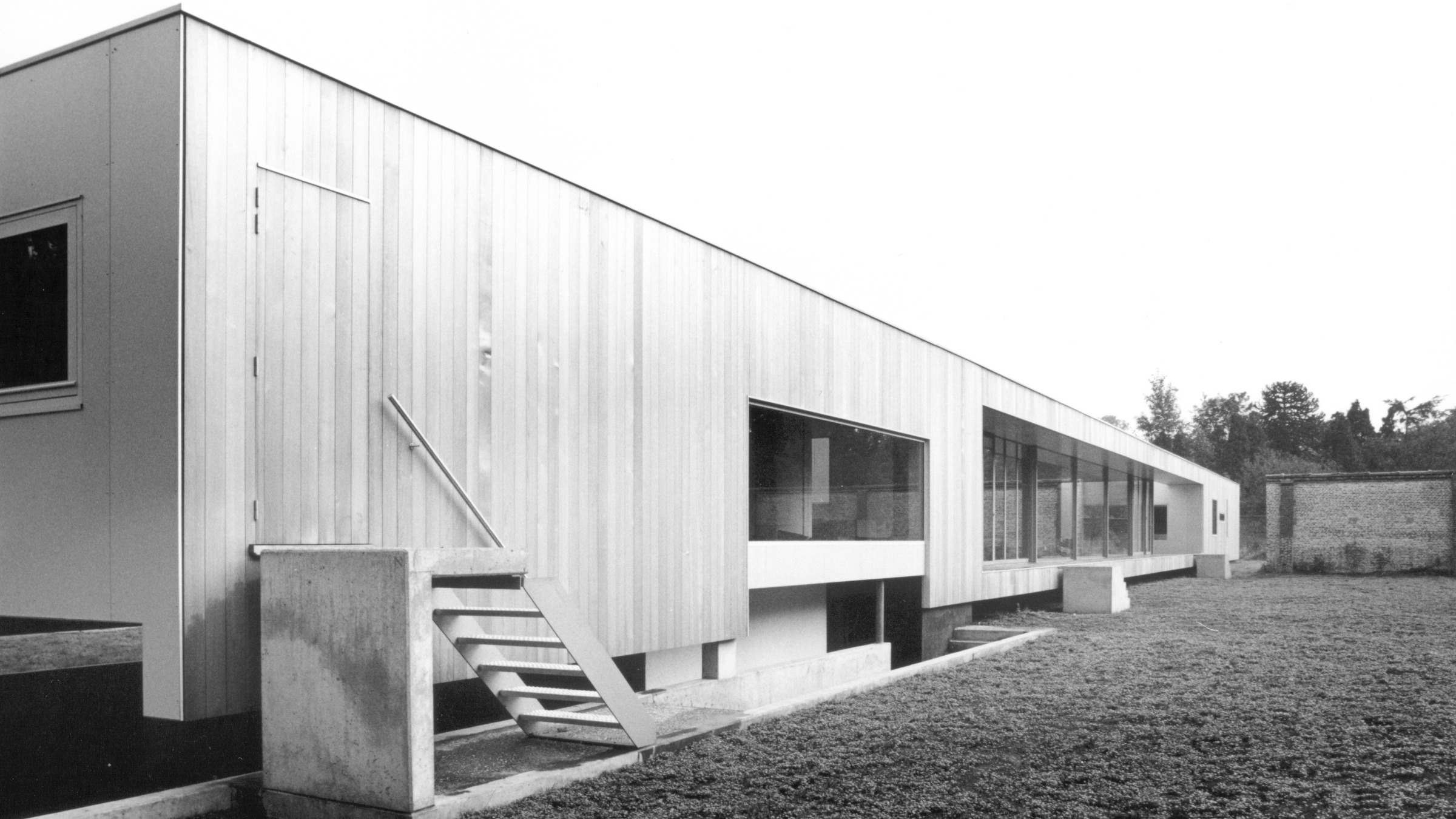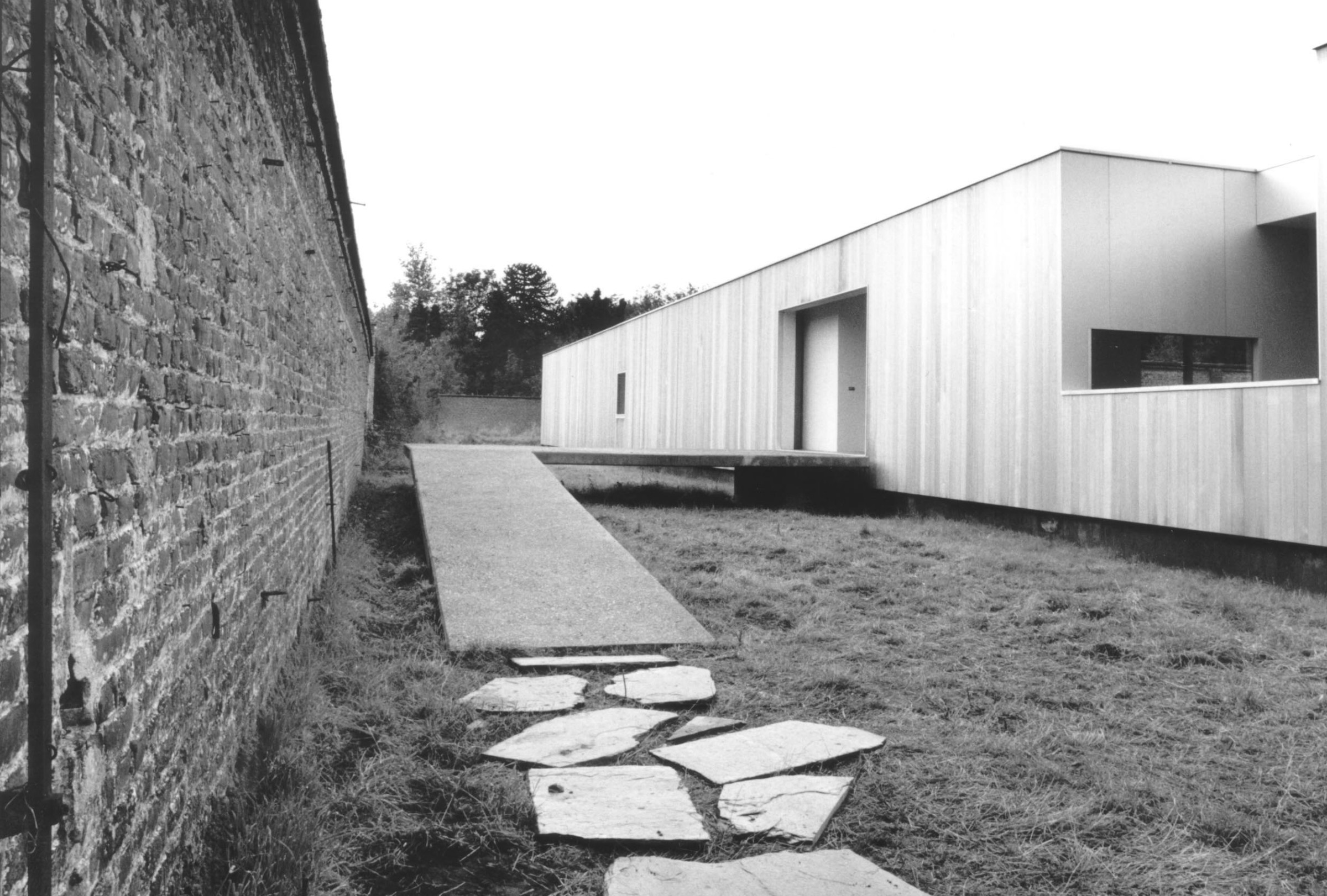 De krachtige neutraliteit van een lang verhoogd en éénvormig volume vormt de vertrouwde en vreemde aanvulling op het terrein. Een nieuwe bewoonde muur. Het omhulsel met zijn constante hoogte vormt, over zijn volle lengte, een tuingevel en creëert de sfeer van een bijkomende smalle buitenruimte.