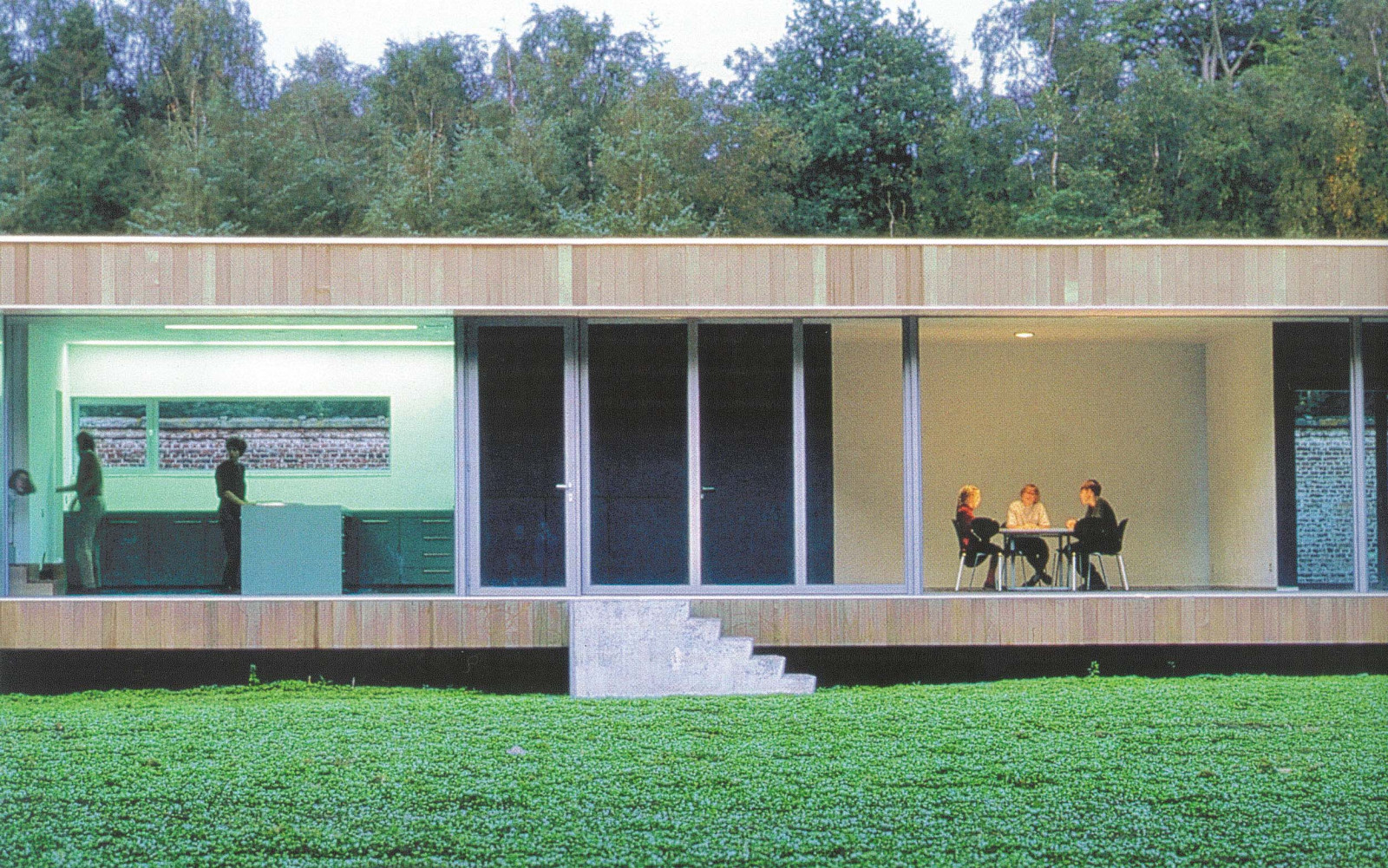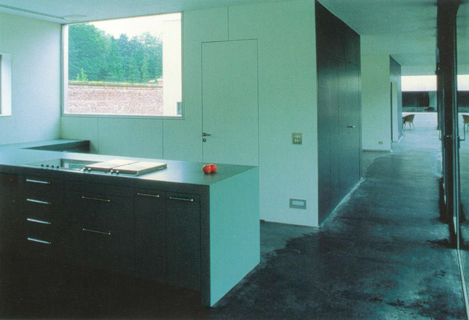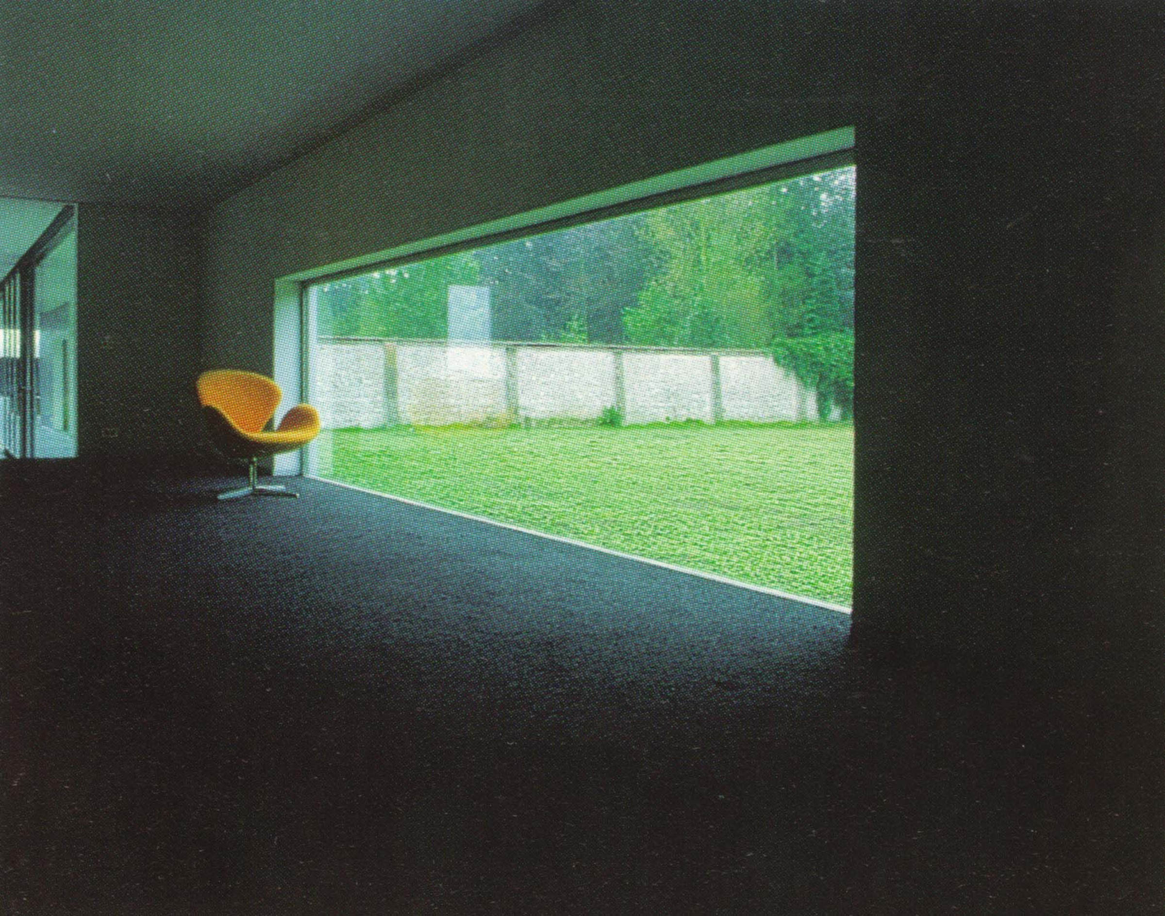 Tuin en boomgaard worden ter hoogte van de beglaasde middenzone deel van het interieur. De gesloten wanden worden op strategische plaatsen geopend en uitgesneden: om het landschap in te lijsten en het te dimensioneren, om het op maat van de woning te maken en omwille van het licht. Door verhullen en onthullen geven deze openingen iets prijs van de vertrekken en tuinen erachter. De patio’s zijn buitenkamers die bemiddelen tussen verte en nabijheid. De binnenvolumes zijn als grote meubels, die privacy en samenkomst, open en gesloten, binnen en buiten gradueren. Wat op het eerste gezicht een onlogische afmeting en verhouding lijkt, creëert bij nader inzien ontelbare relaties, zowel binnen als tussen binnen en buiten. Deze zijn niet enkel het gevolg van een louter functioneel verbindings- en relatiepatroon maar vloeien ook voort uit de behoefte aan intuïtieve en irrationele waarden en verlangens.